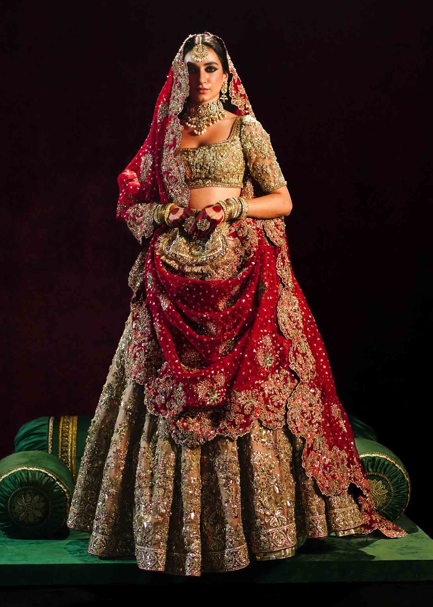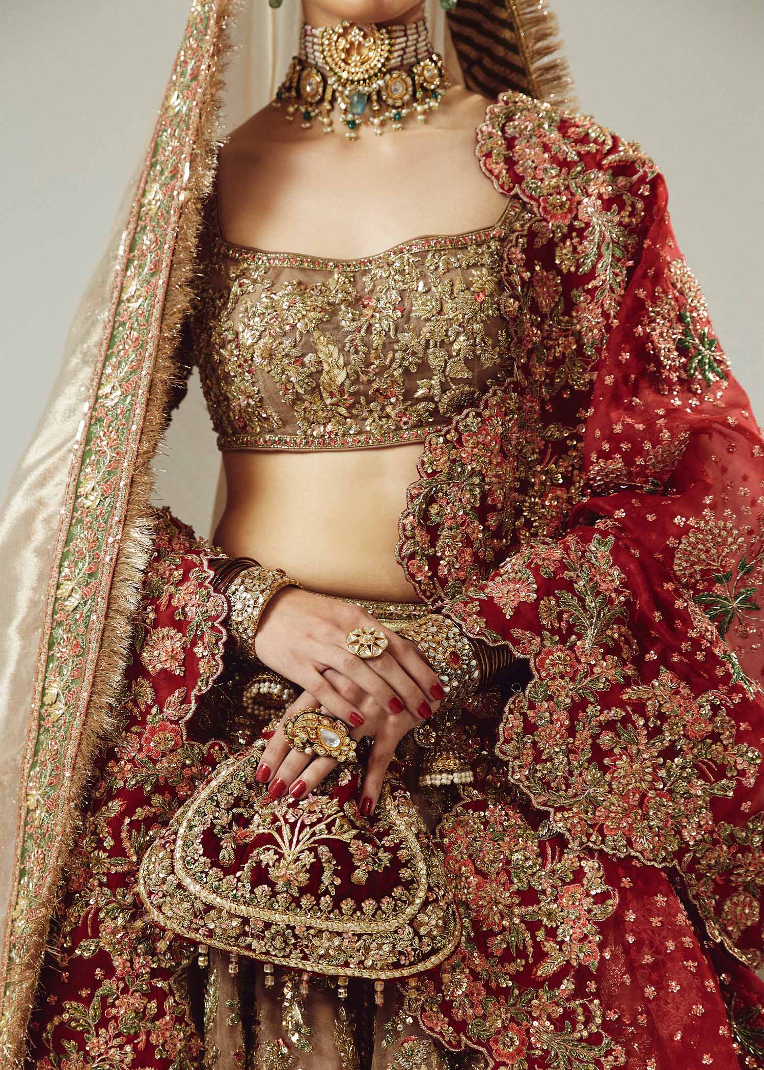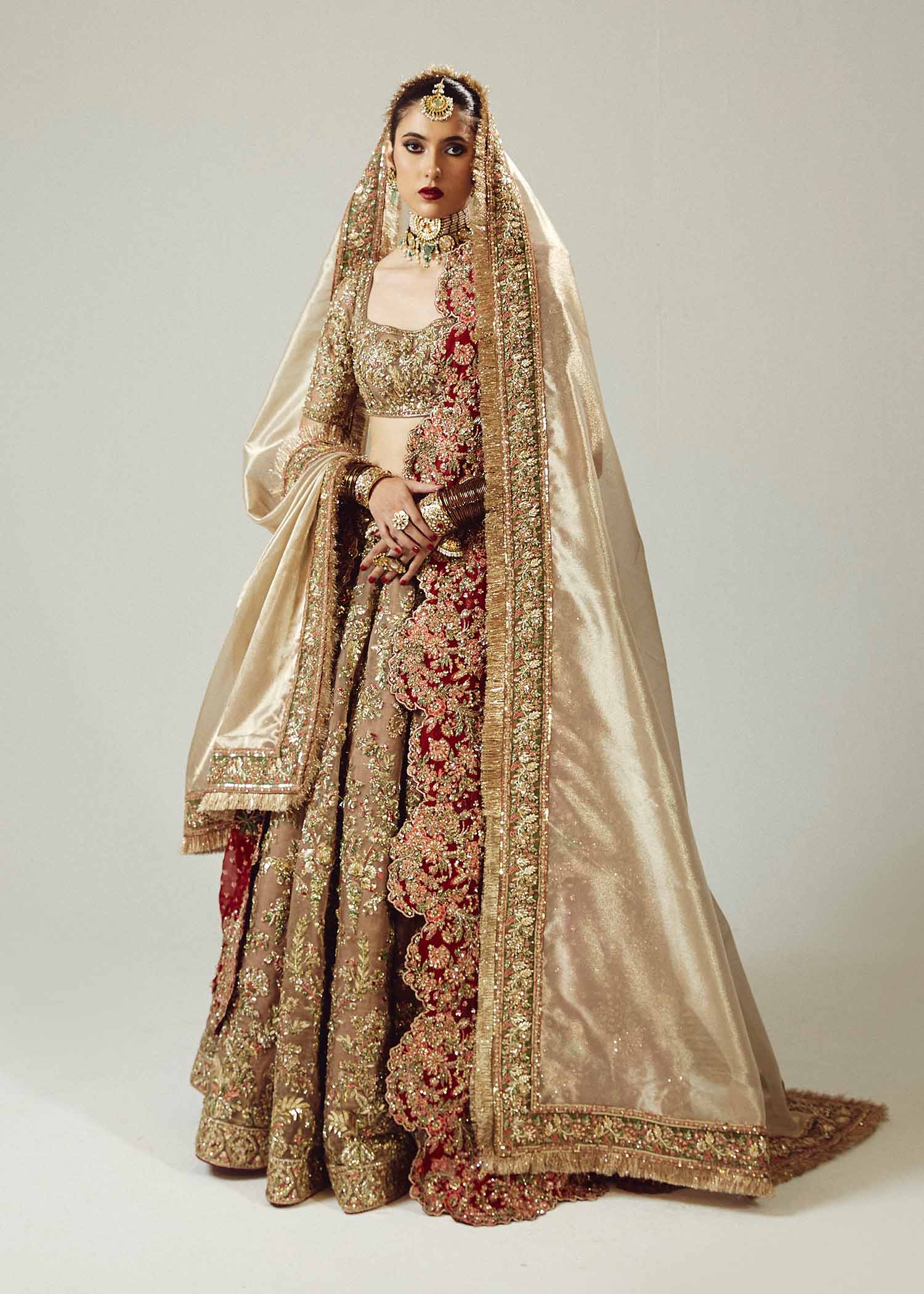 The resplendent bridal gold pure organza lehenga choli, accompanied by a maroon pure organza dupatta adorned with exquisite adda handwork. The meticulous craftsmanship showcases the artistry of red and gold mukesh and green bugle beads, creating a mesmerizing interplay of colors and textures. This opulent ensemble is a true masterpiece.