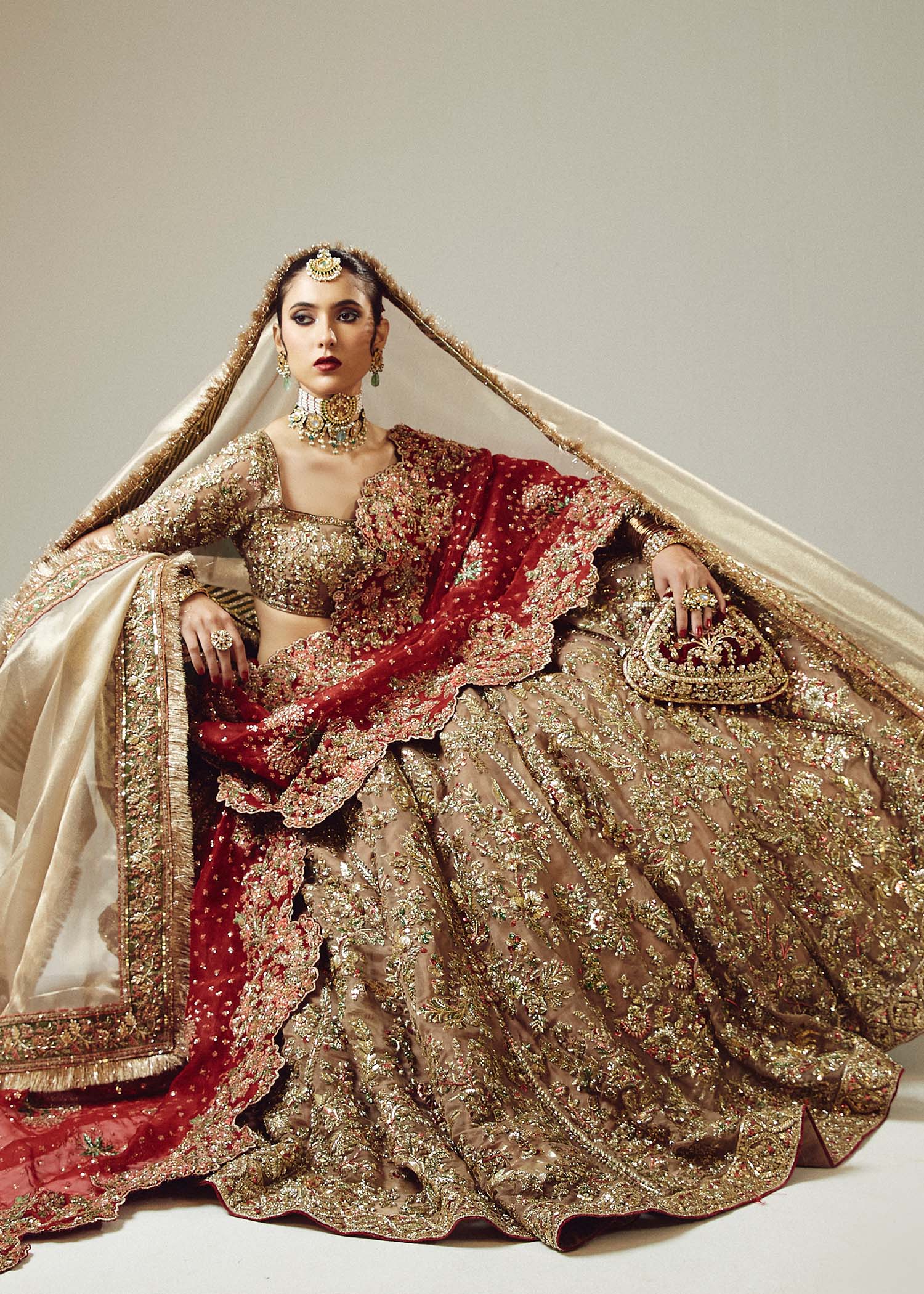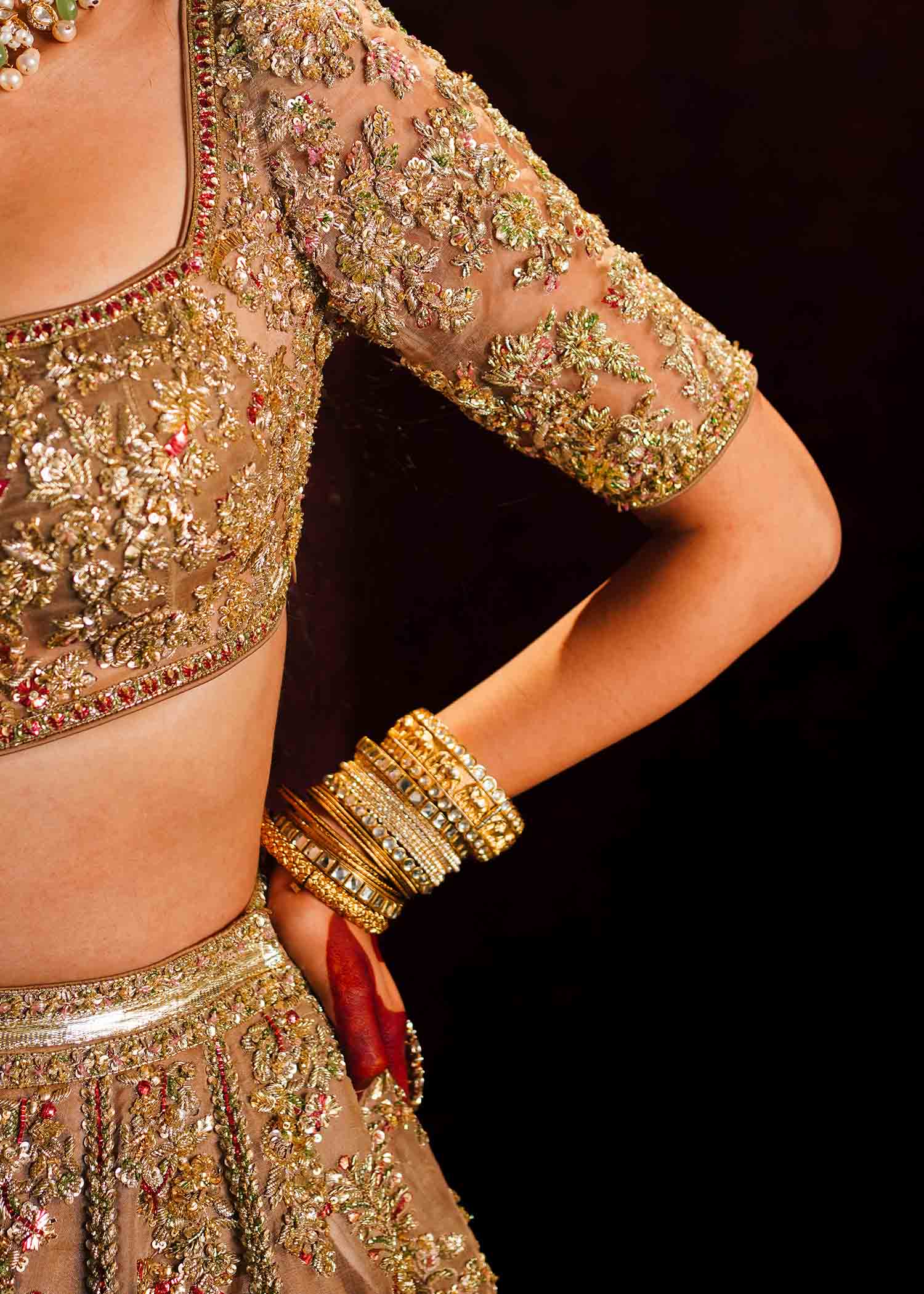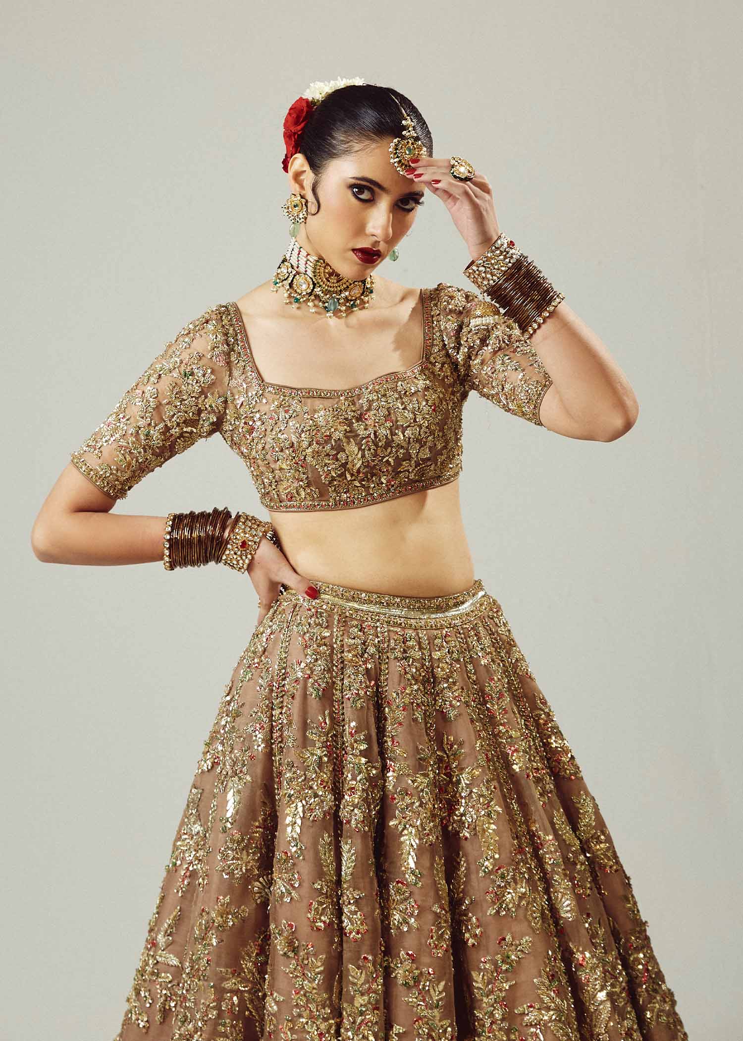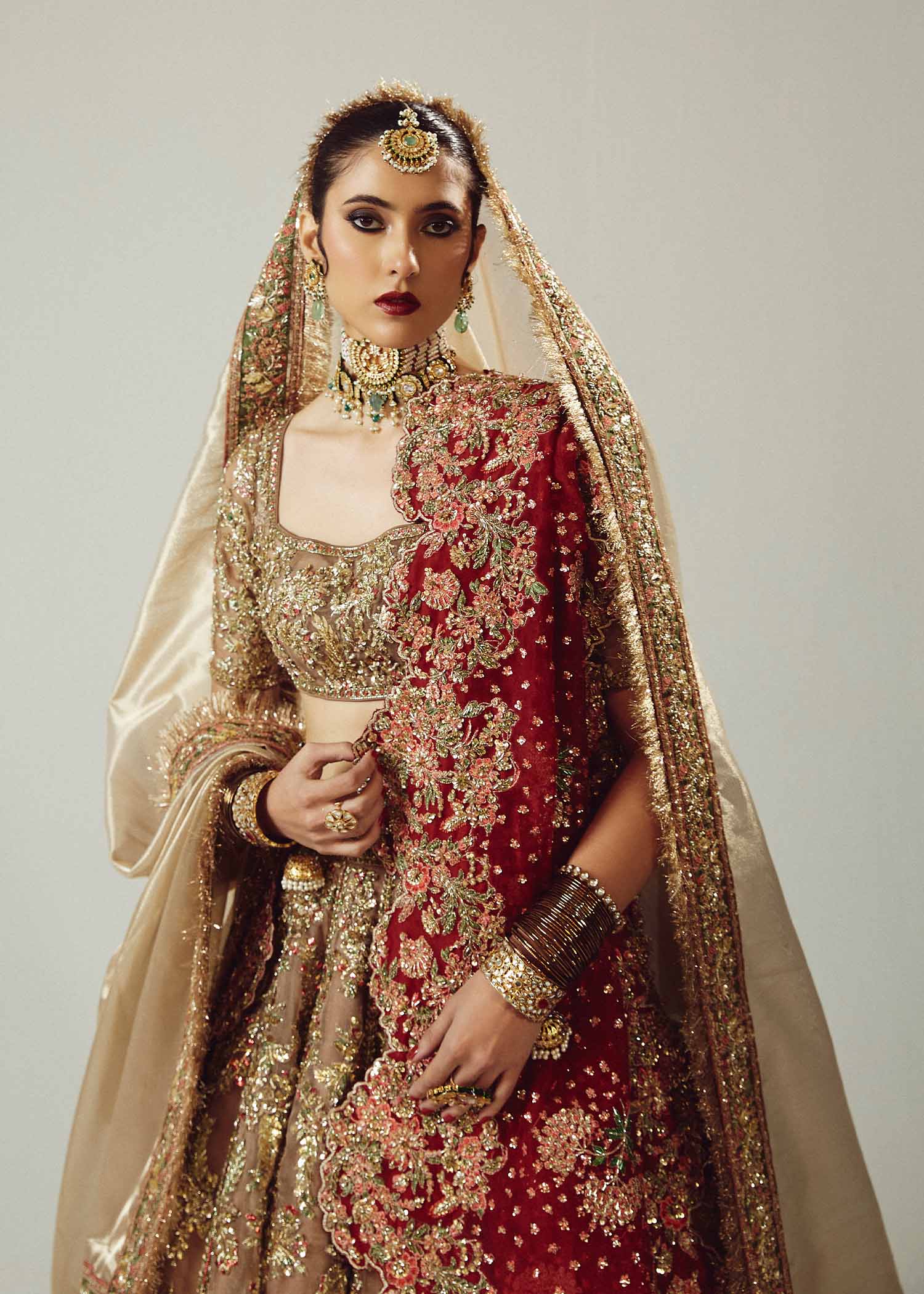 The resplendent bridal gold pure organza lehenga choli, accompanied by a maroon pure organza dupatta adorned with exquisite adda handwork. The meticulous craftsmanship showcases the artistry of red and gold mukesh and green bugle beads, creating a mesmerizing interplay of colors and textures. This opulent ensemble is a true masterpiece.
