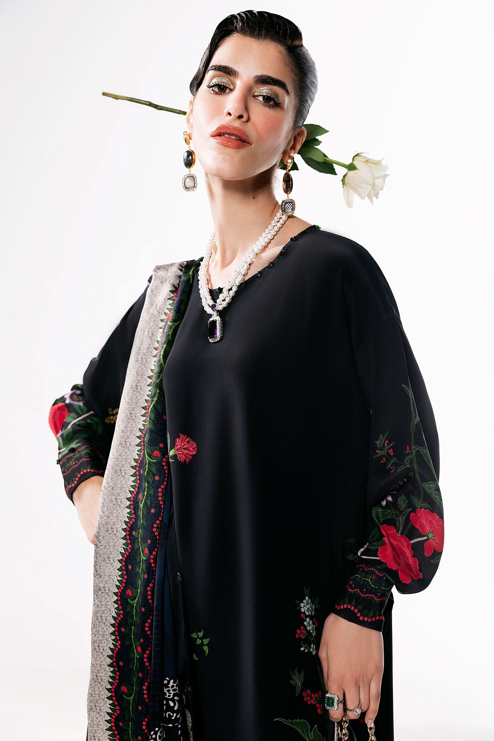 Adorned with intricate ornamental motifs in deep cerulean, scarlet, and crimson — reminiscent of ancient frescoes and imperial tapestries — and crowned with a rich ebony hem, Amélie stands as a testament to refined craftsmanship. Complemented by a meticulously bordered dupatta, this creation balances historic opulence with playful versatility.