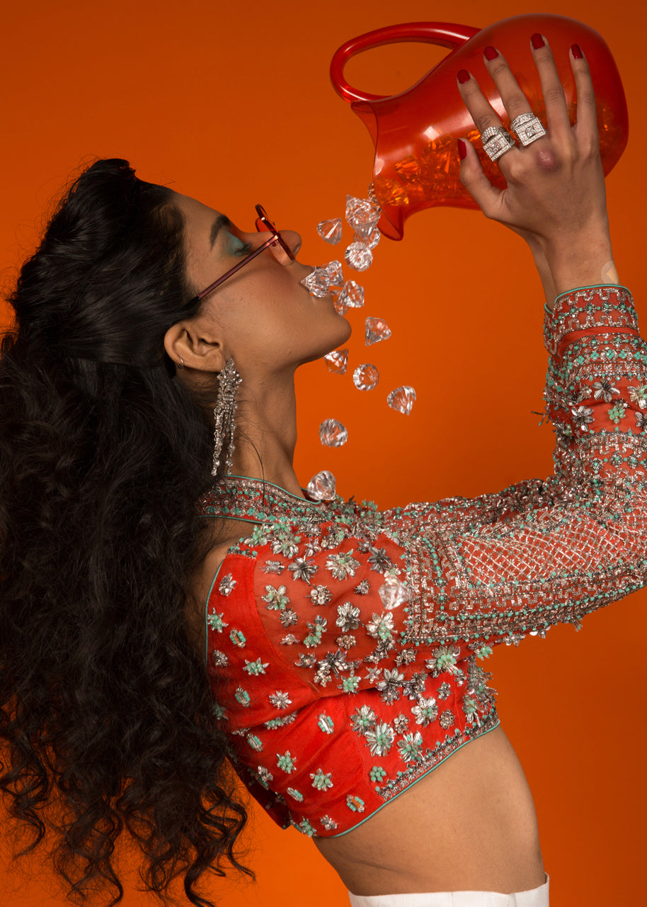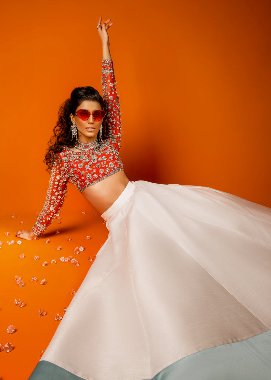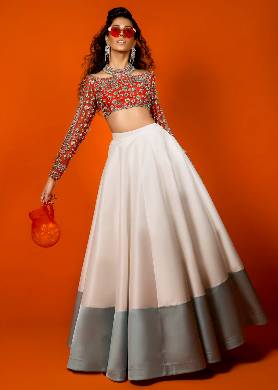 The rust orange blouse has full sleeves with a halter neck. The organza blouse has chunky ice blue and silver embellishments spreading throughout the front back and sleeves. The blouse is lined with medium silk. The raw silk white skirt has a large plain raw silk border panel in ice blue color at the hem.