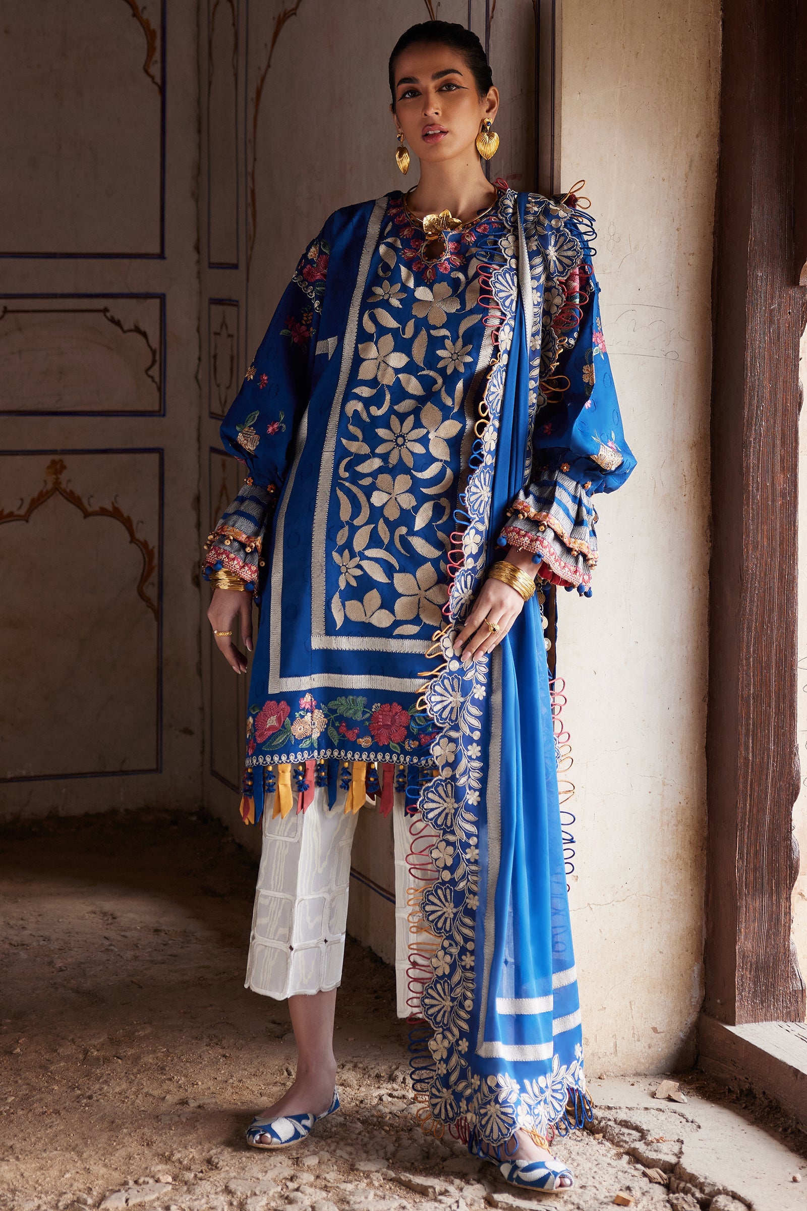 Soft, detailed embroidery graces the neckline and sleeves, enhancing the piece’s rich textures and creating a harmonious dance of craftsmanship. The tonal voile dupatta, adorned with vivid floral scalloped borders and finished with playful tassels, adds gentle movement and an air of sophistication to the ensemble.