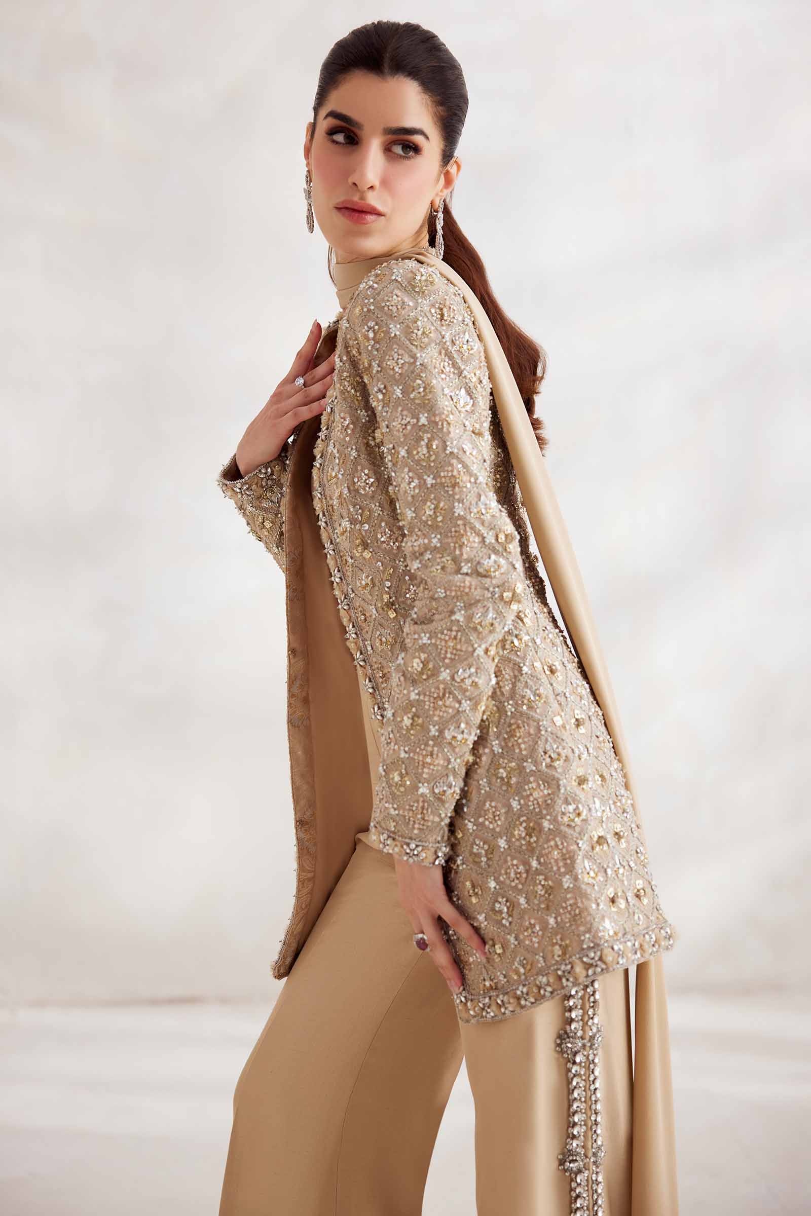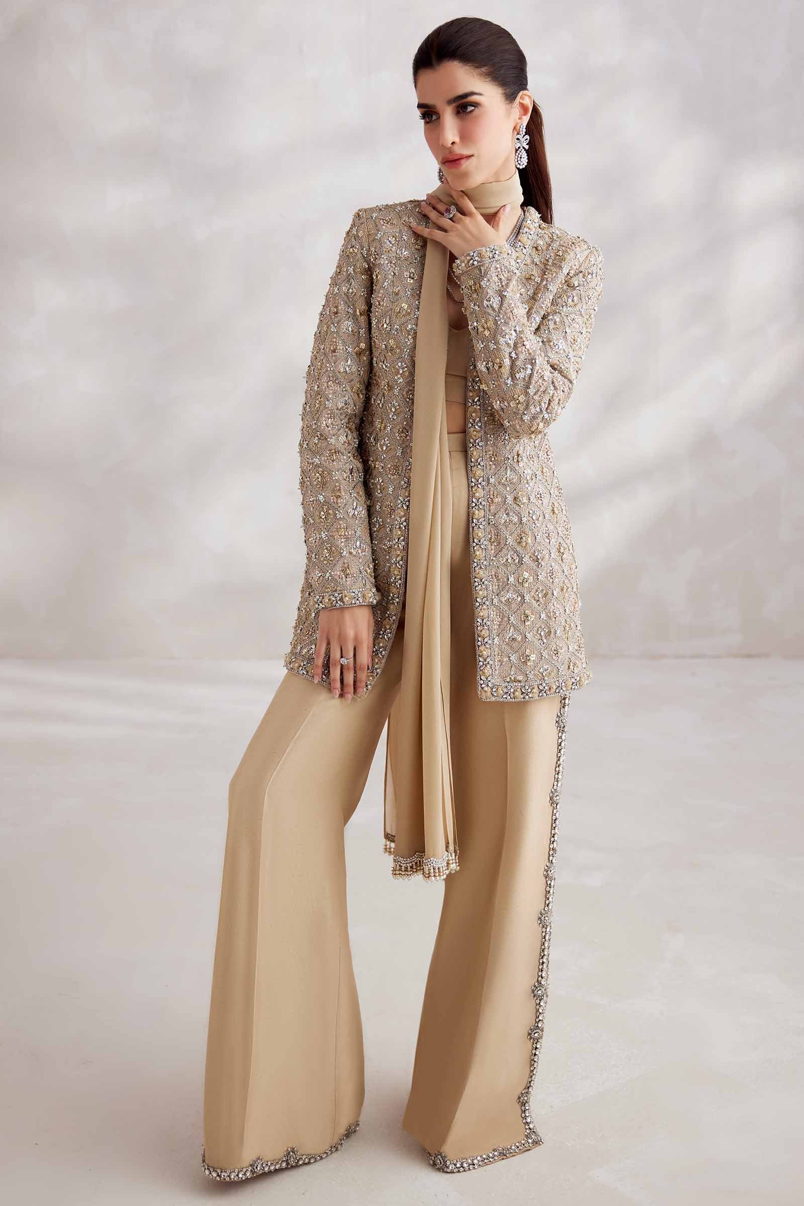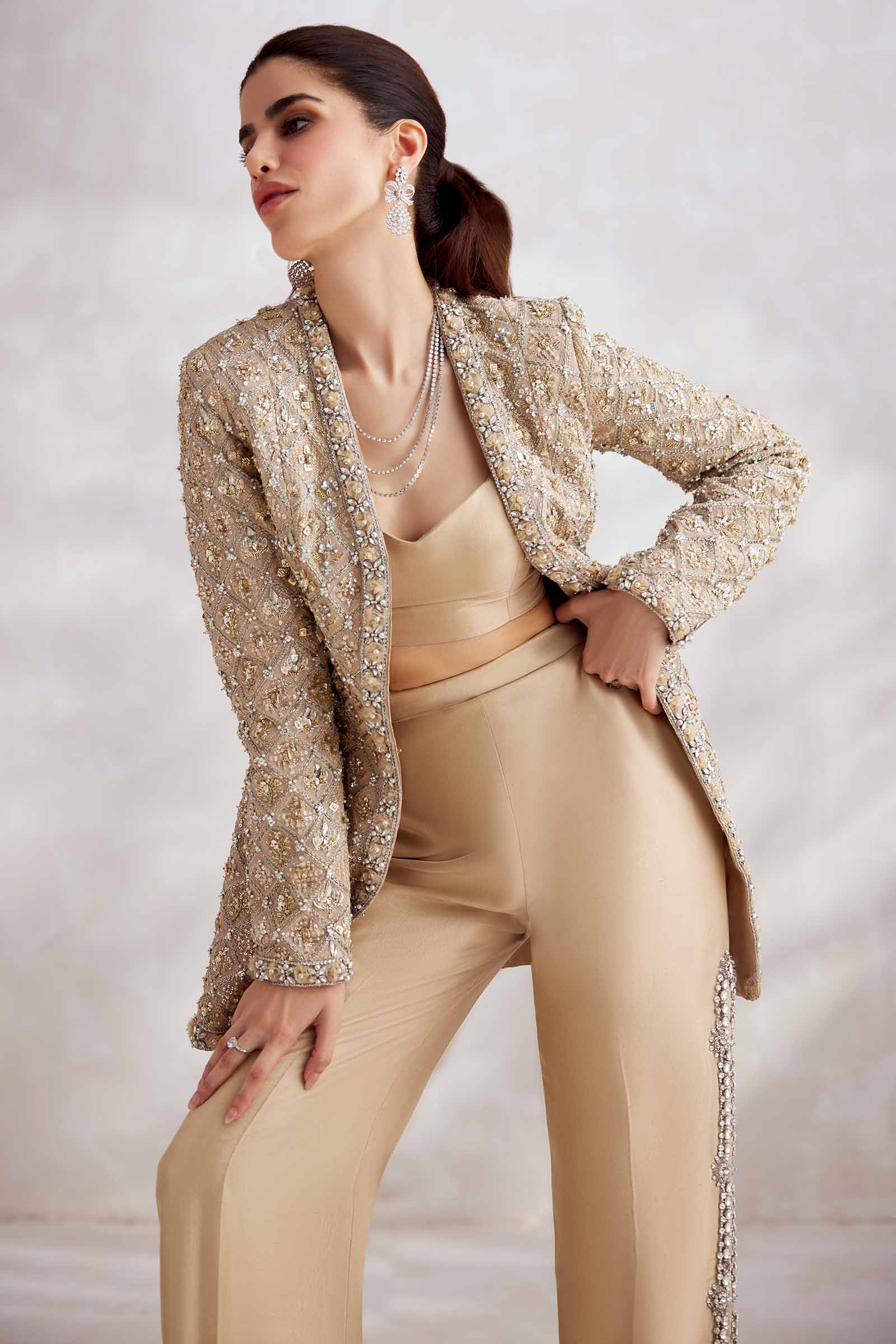 Experience the pinnacle of opulence with "Aurélien." Enveloped in a delicate champagne hue, this ensemble epitomizes refined elegance. The jacket, crafted from the finest ethereal fabric, is lavishly adorned with intricate gold crystals, Swarovski embellishments and artfully placed floral motifs, transforming it into a timeless masterpiece. Complemented by impeccably tailored bootcut pants with bejeweled side slits, this creation is a testament to understated grandeur.Elevate your look with a neck scarf adorned with exquisite tassels, radiating an aura of sophistication and leaving an indelible mark of pure luxury.
