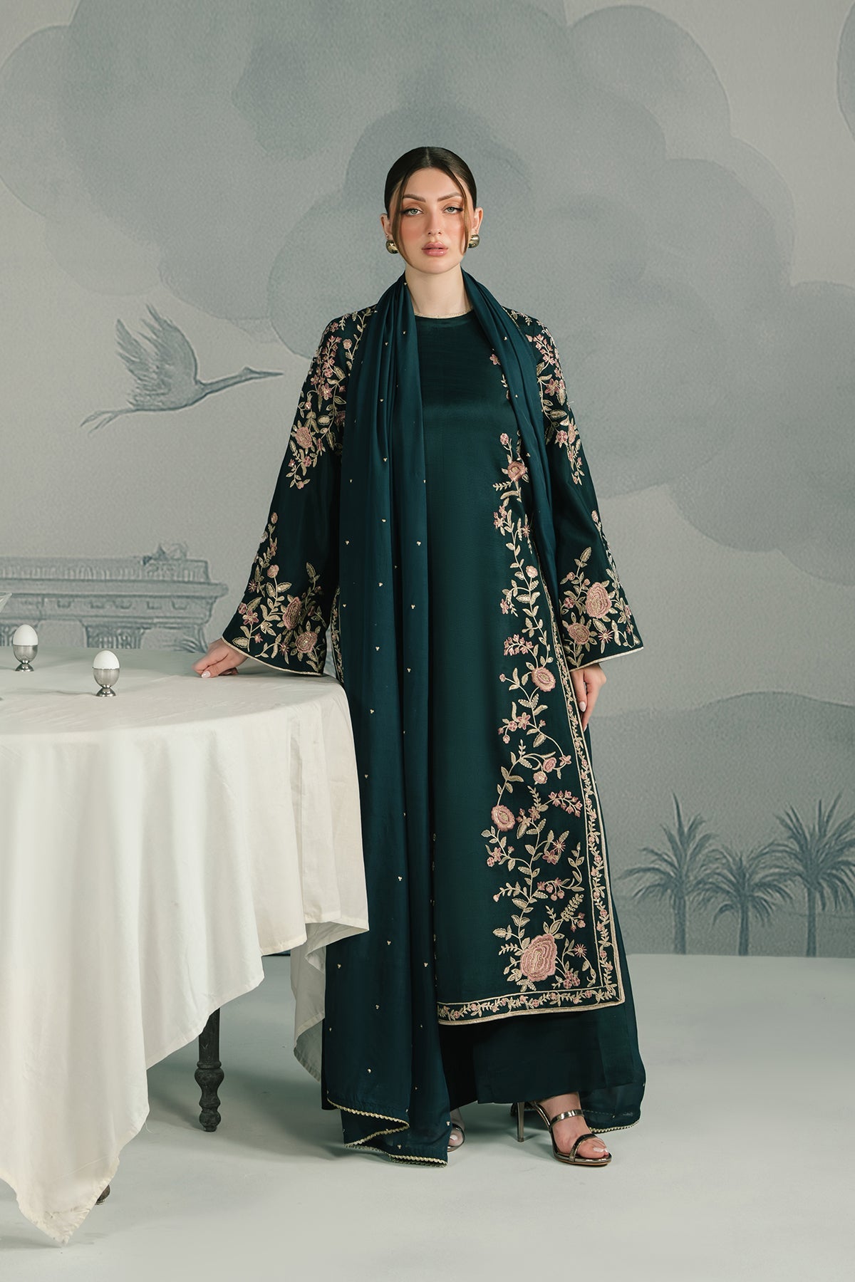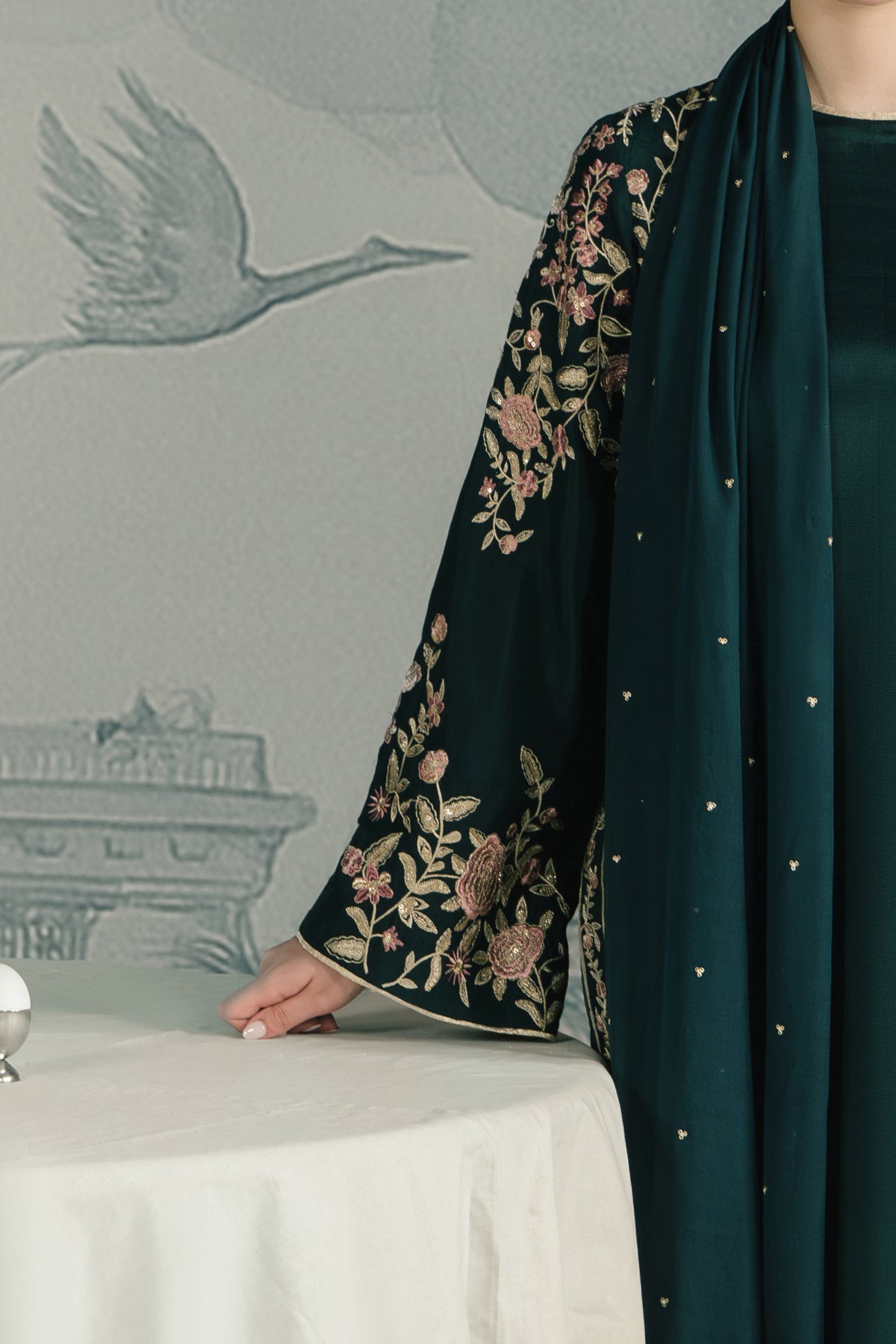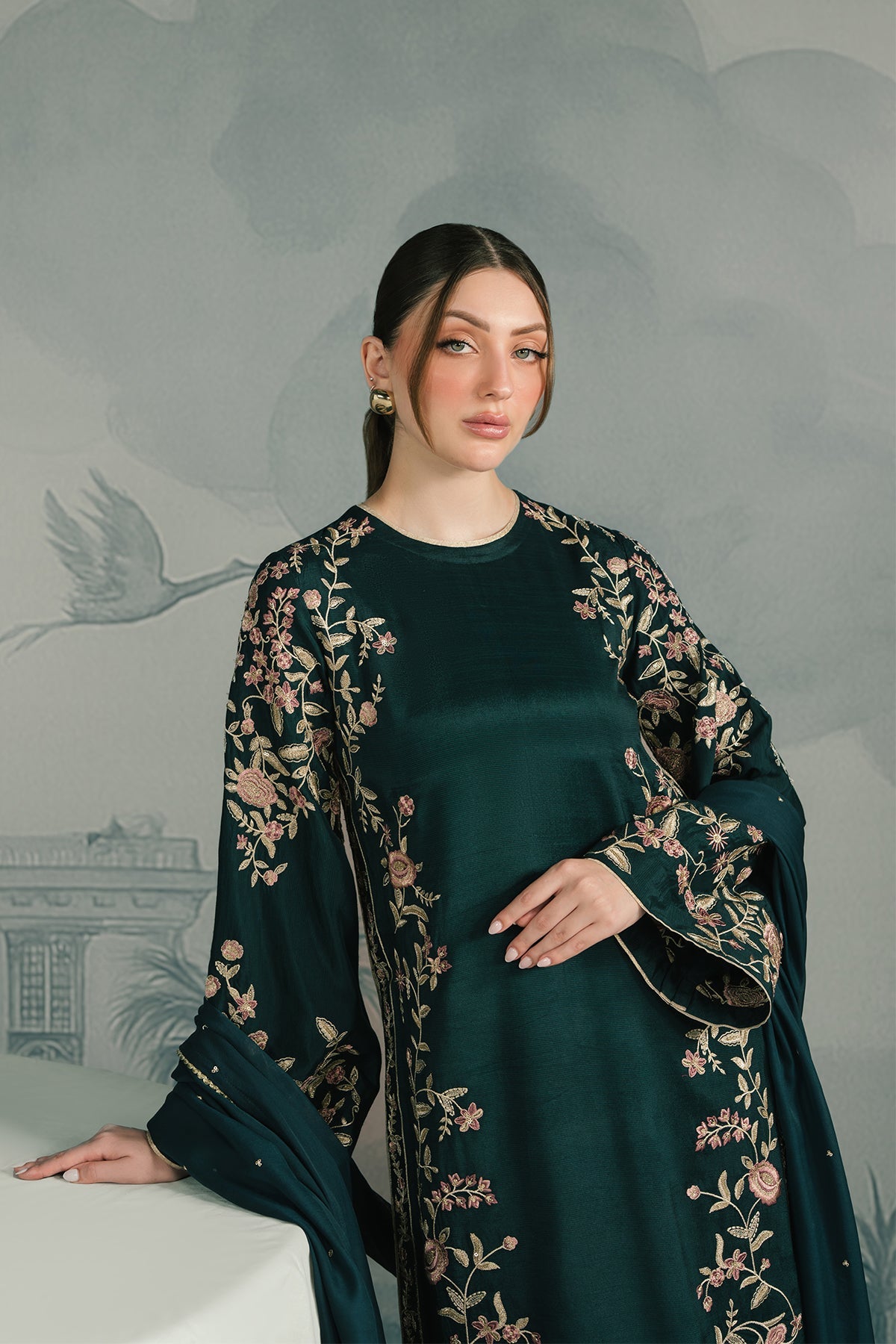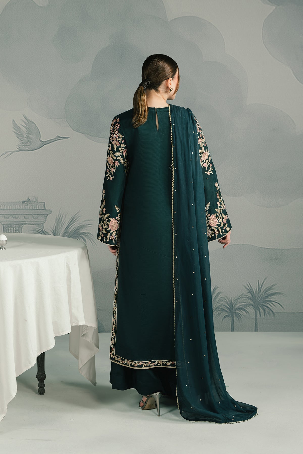 A midnight green raw silk long embrioded shirt, richly adorned with intricate floral embroidery cascading along the front, sleeves and borders. Paired with straight trouser for a sleek silhouette, the ensemble is elevated by a matching pp chiffon dupatta, delicately embroidered with pastel blooms — a perfect harmony of depth