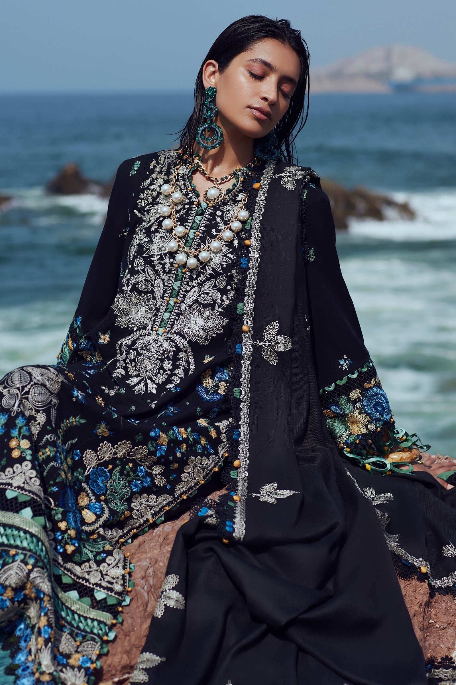 Make a formidable statement this winter in ‘Ayanna' - a beguiling ebony is adorned with beautifully composed floral embroideries in detailed hues of moss green, laguna, azure and cream. Paired with a gorgeous contrasting pure wool shawl superimposed with floral motifs, this regal design is perfect to make all heads turn.