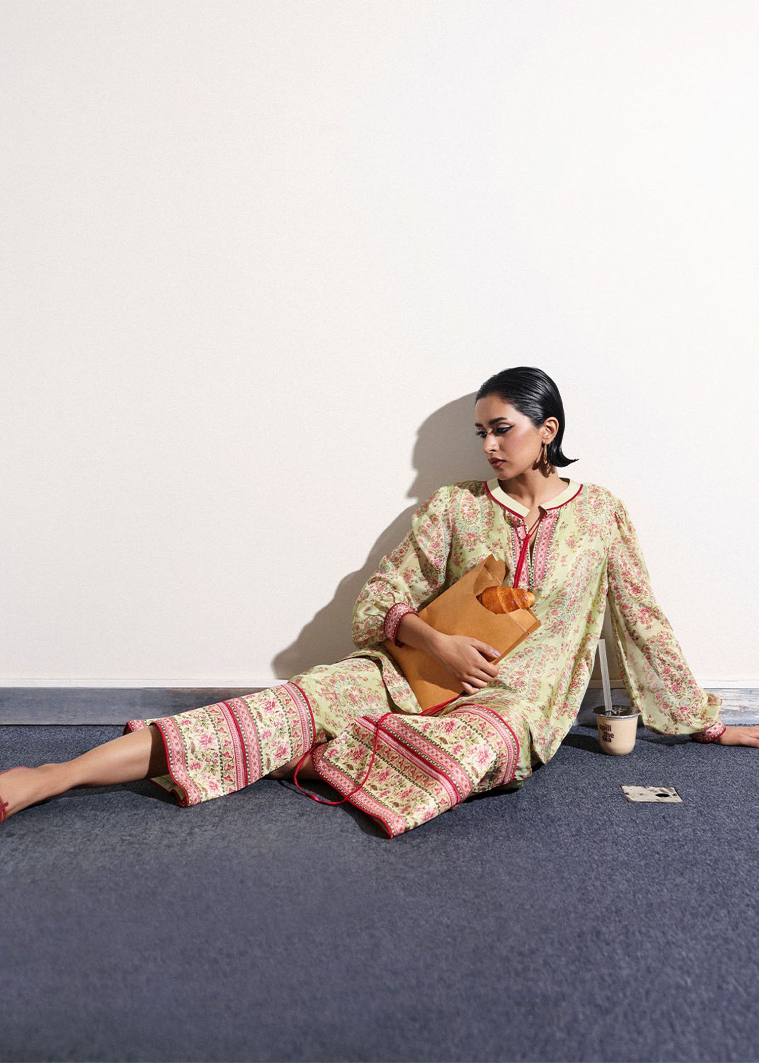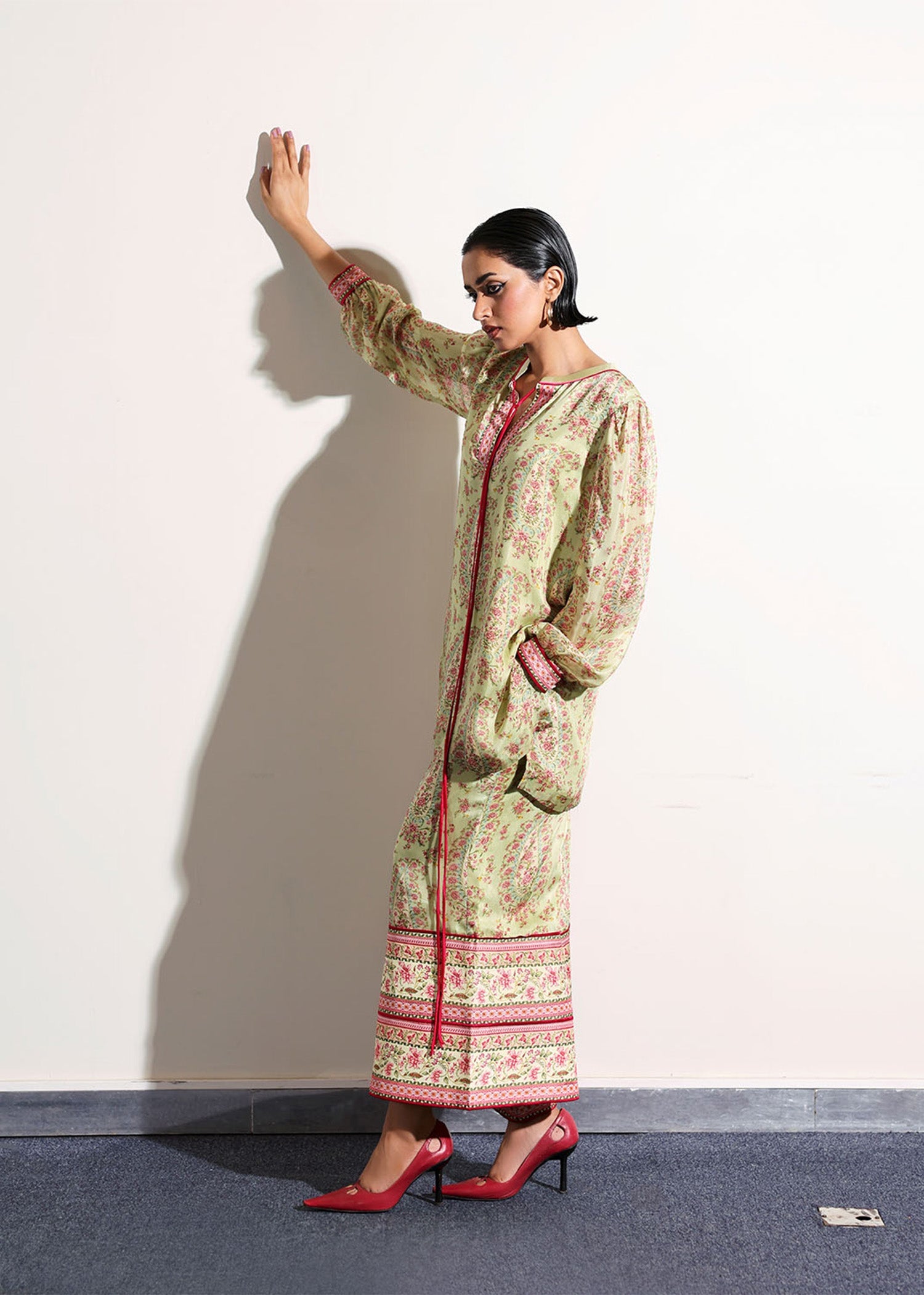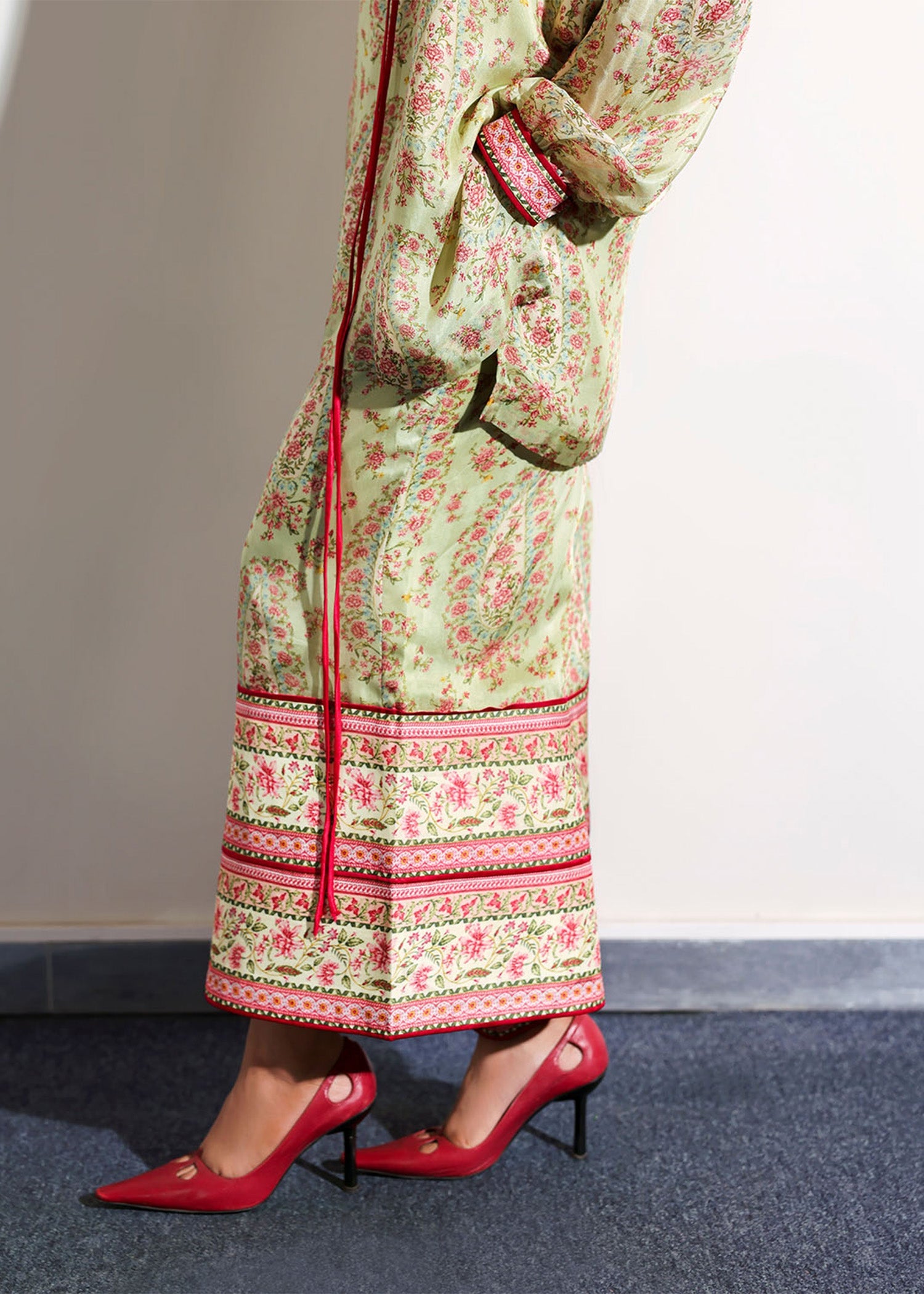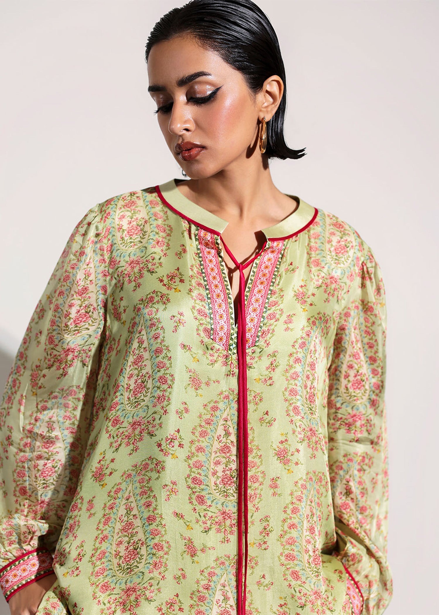A light parrot green silk coord set featuring an all-over paisley print, complemented by a parrot green silk collar band and delicate pink satin silk tassels and trims. The balloon sleeves are finished with floral print cuffs and subtle pink satin piping for added texture. Paired with matching printed culottes featuring a bold double border — a playful yet polished silhouette rooted in soft contrasts and thoughtful detailing.