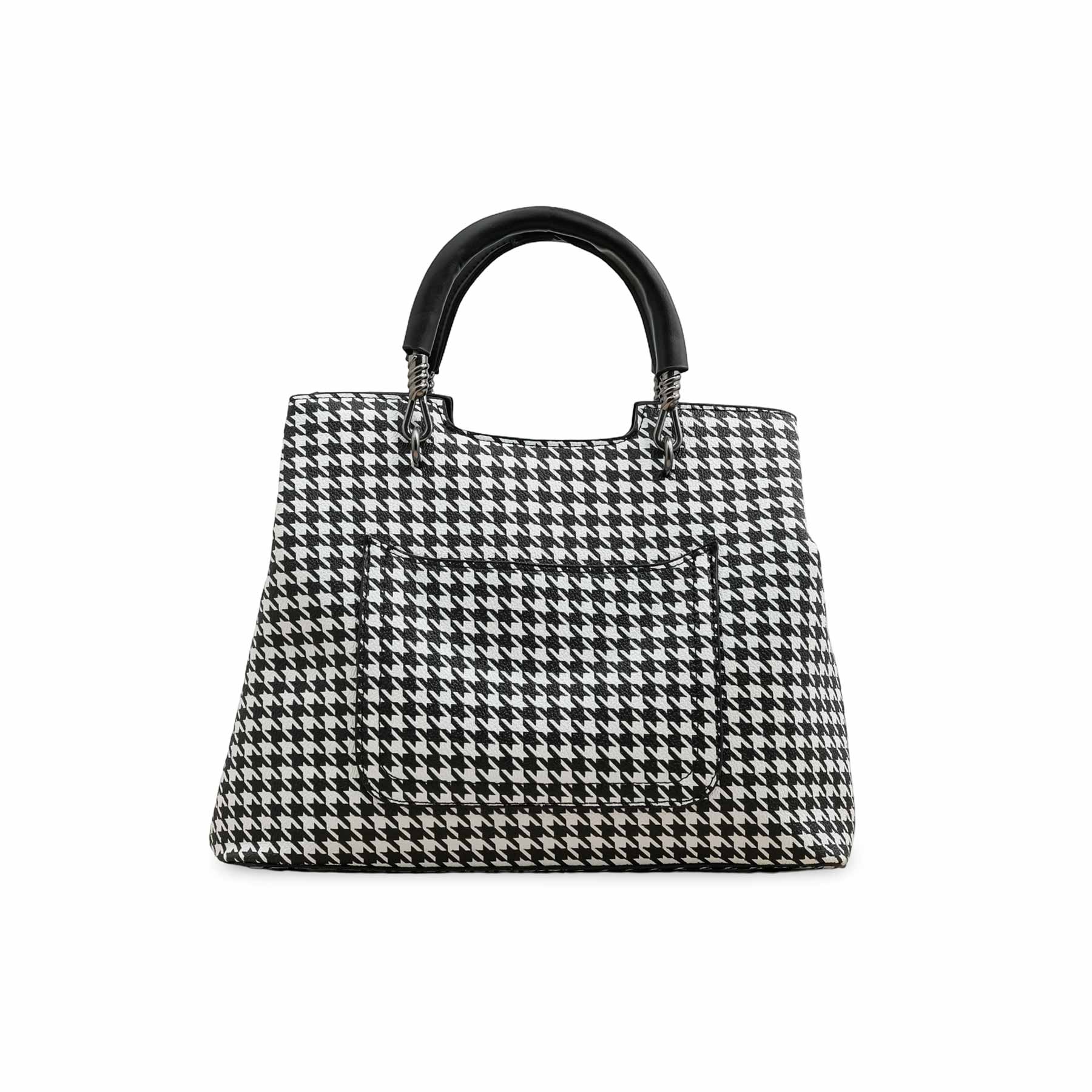 This chic bag features a classic black and white pattern and a unique, curved handle.