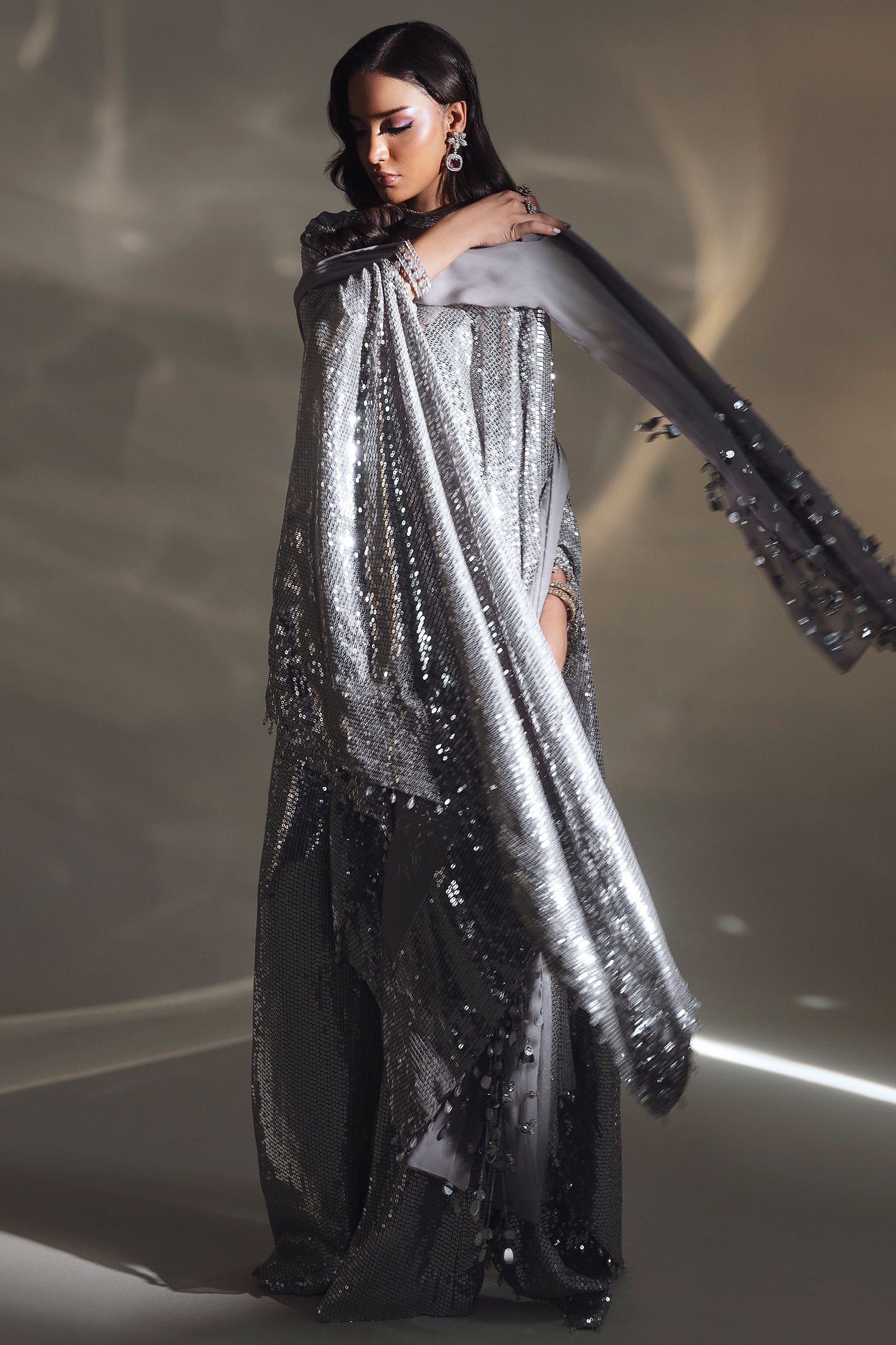 Command the spotlight in Lumière, a breathtaking silver shimmery cape paired with dazzling sequined pants, exquisitely embellished with radiant crystals. This show-stopping ensemble exudes opulent glamour and ethereal elegance, designed to captivate at the most exclusive soirées and upscale events. Every shimmer catches the light, every detail whispers luxury — making Lumière your flawless armor for unforgettable nights.
