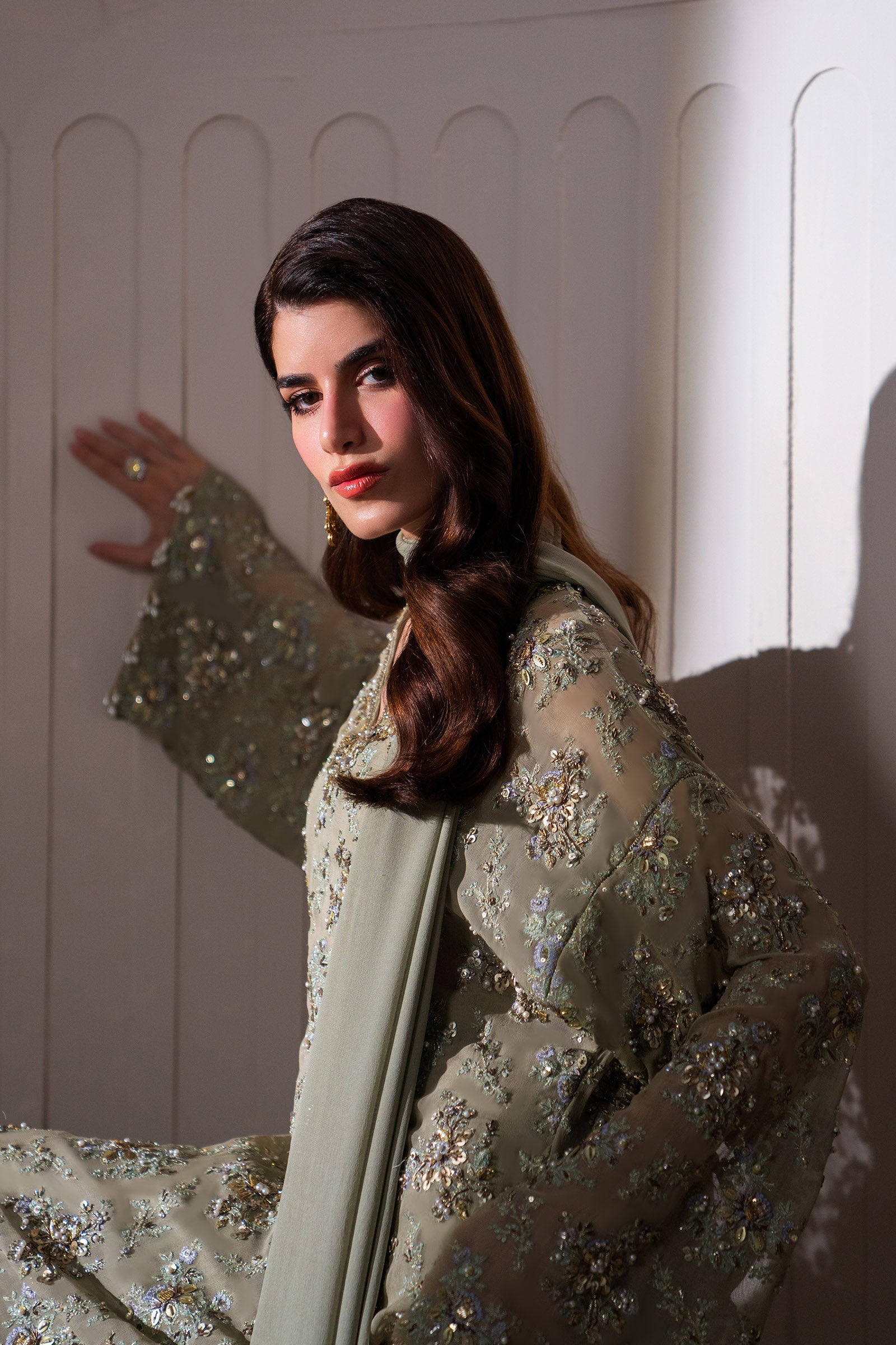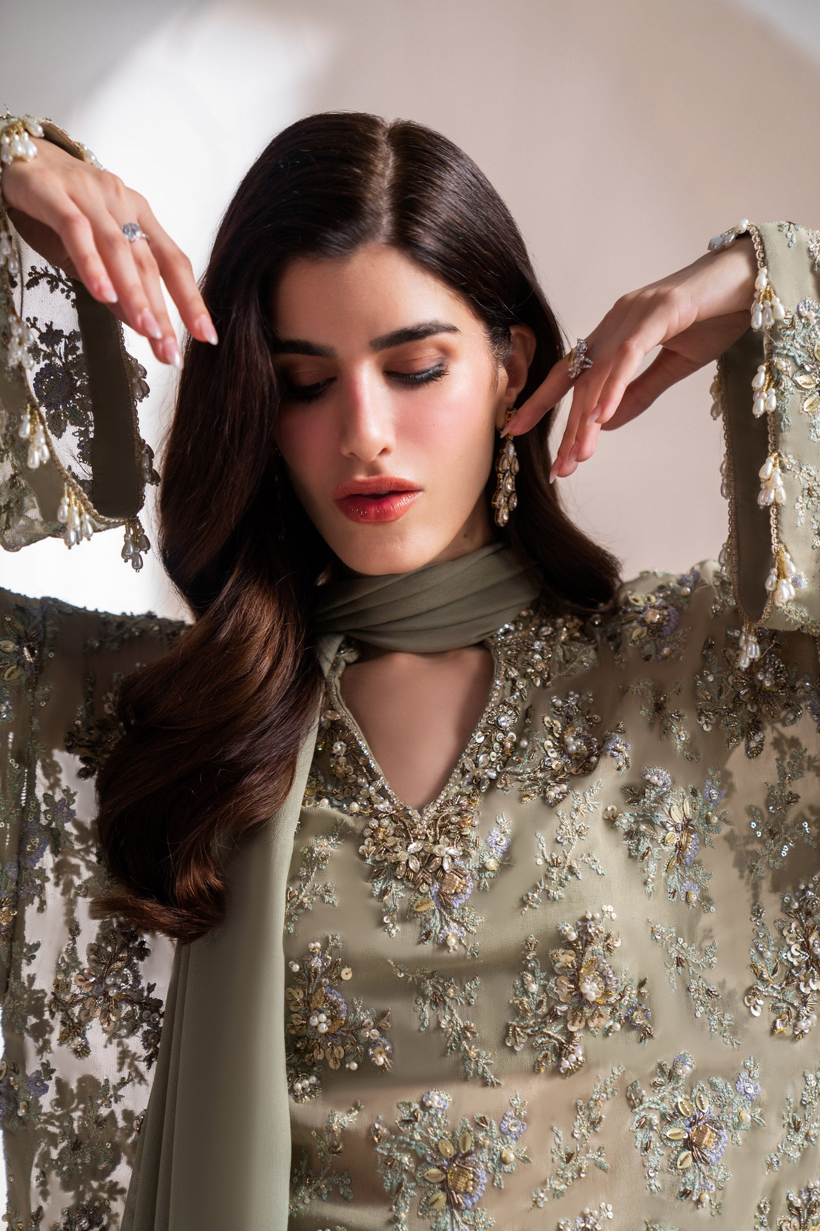 Enter a realm of sublime luxury with 'Clarté,' an Iseo Sage Green creation that masterfully redefines regal elegance. This breathtaking drop-shoulder, long-shirt silhouette is a testament to refined craftsmanship, adorned with opulent gold-chrome accents, where each floral motif is brought to life with dazzling sequins, delicate gotta, and shimmering crystals. A chiffon dupatta, lavishly detailed with plush fur and hand-embellished intricacies, drapes effortlessly, while raw silk palazzos, embellished with a cascade of delicate crystals, radiate an aura of pure grandeur. Perfect for the upcoming wedding season, 'Clarté' is not just an ensemble, but a statement of enduring elegance and exceptional luxury.
