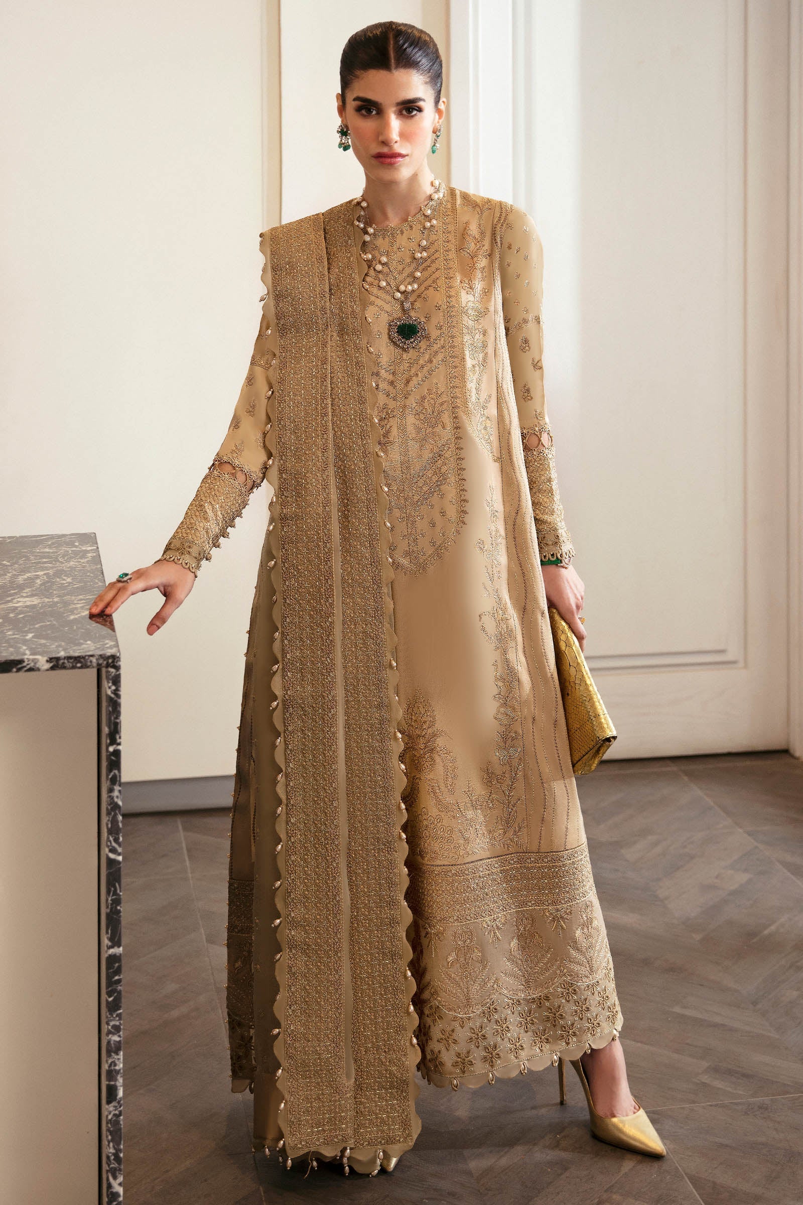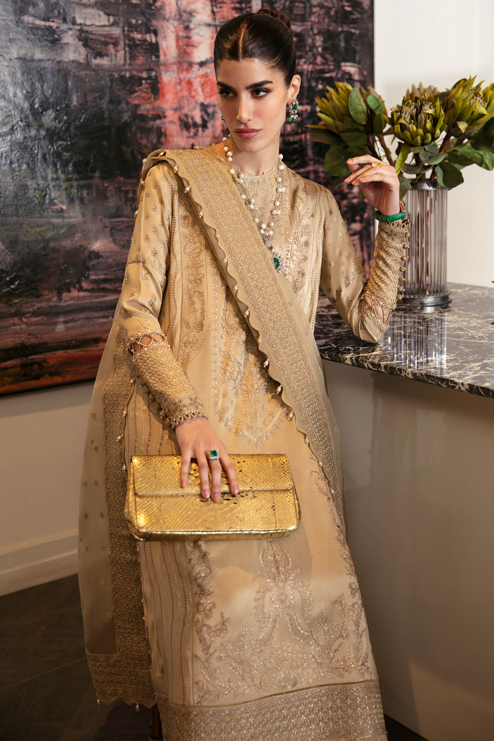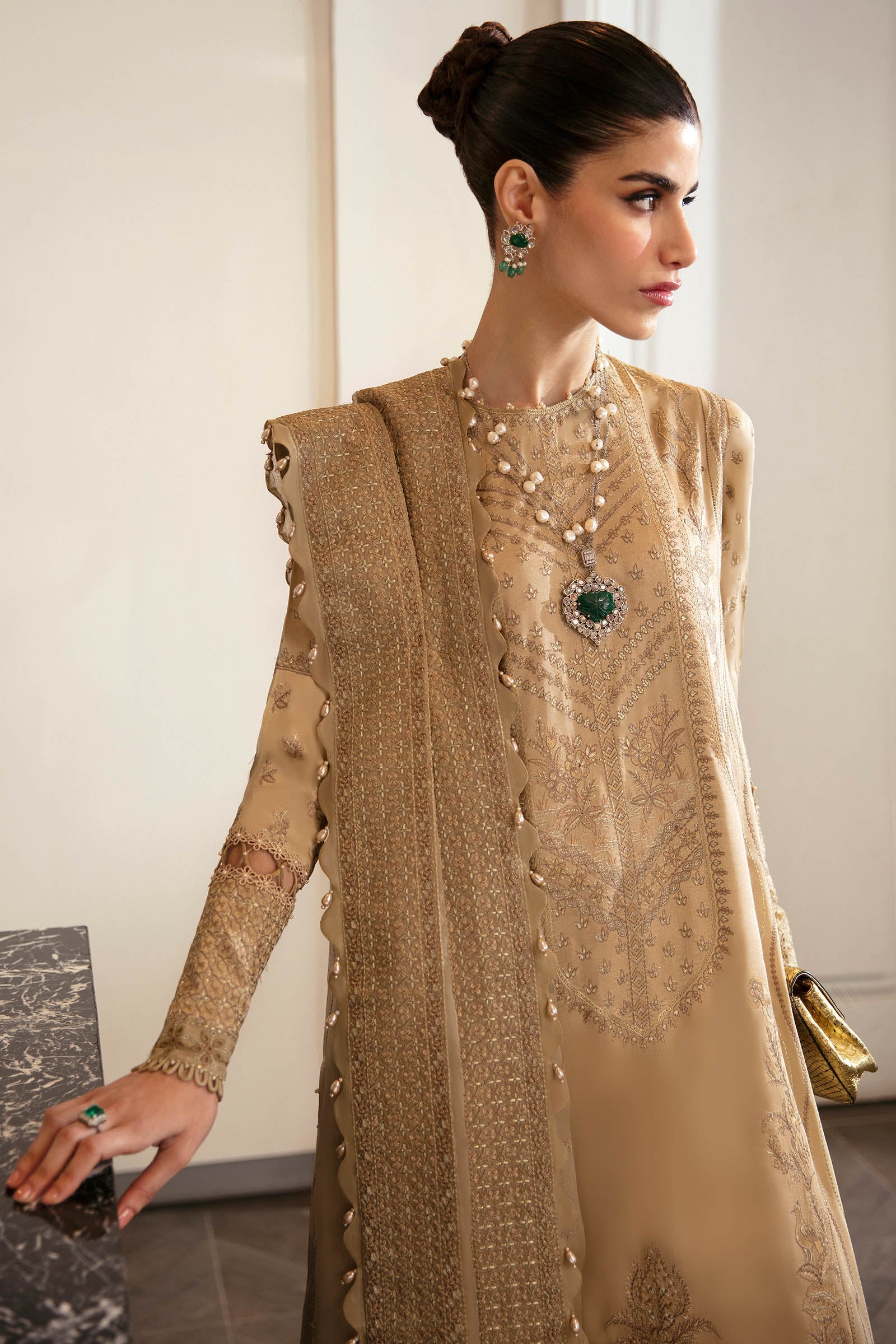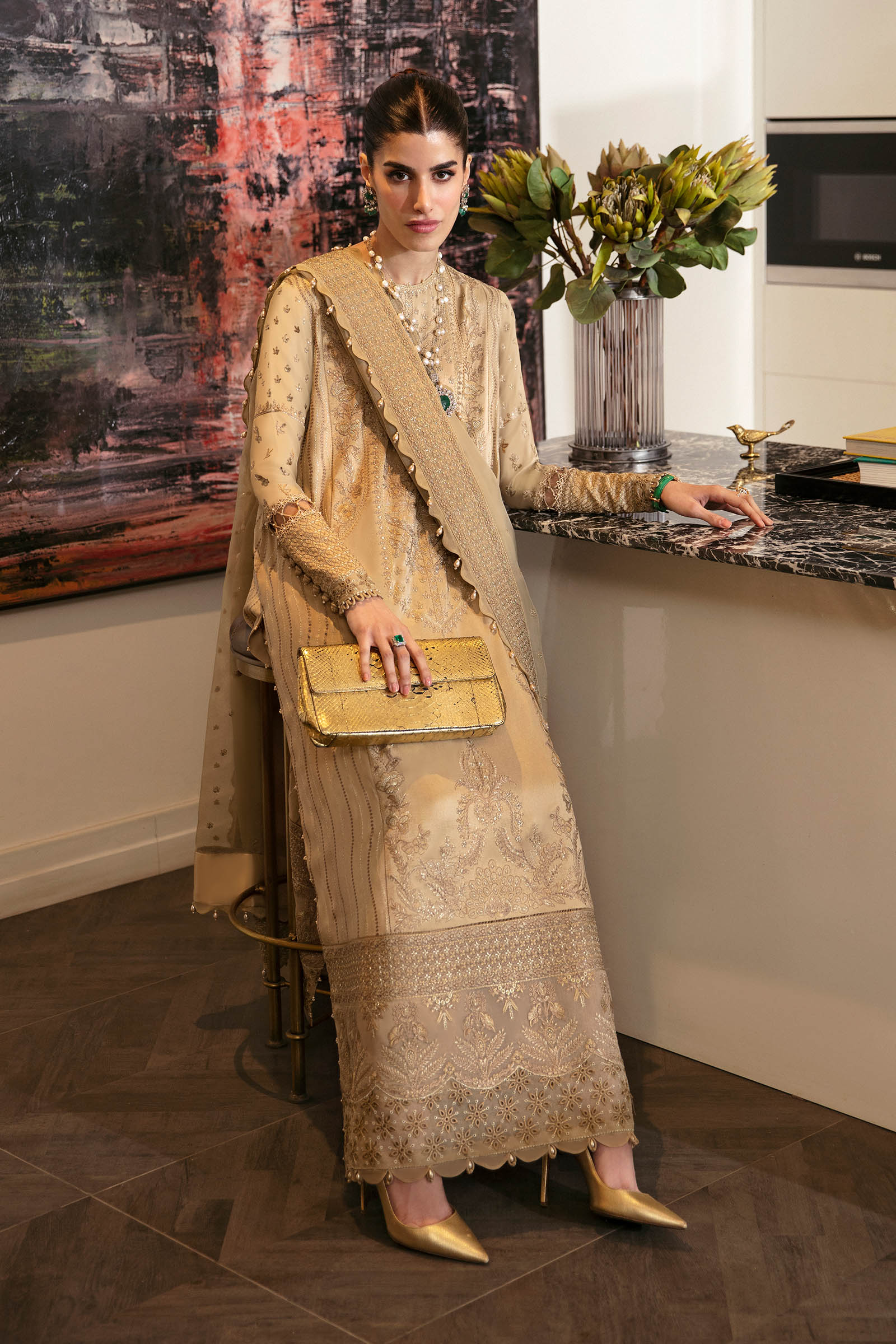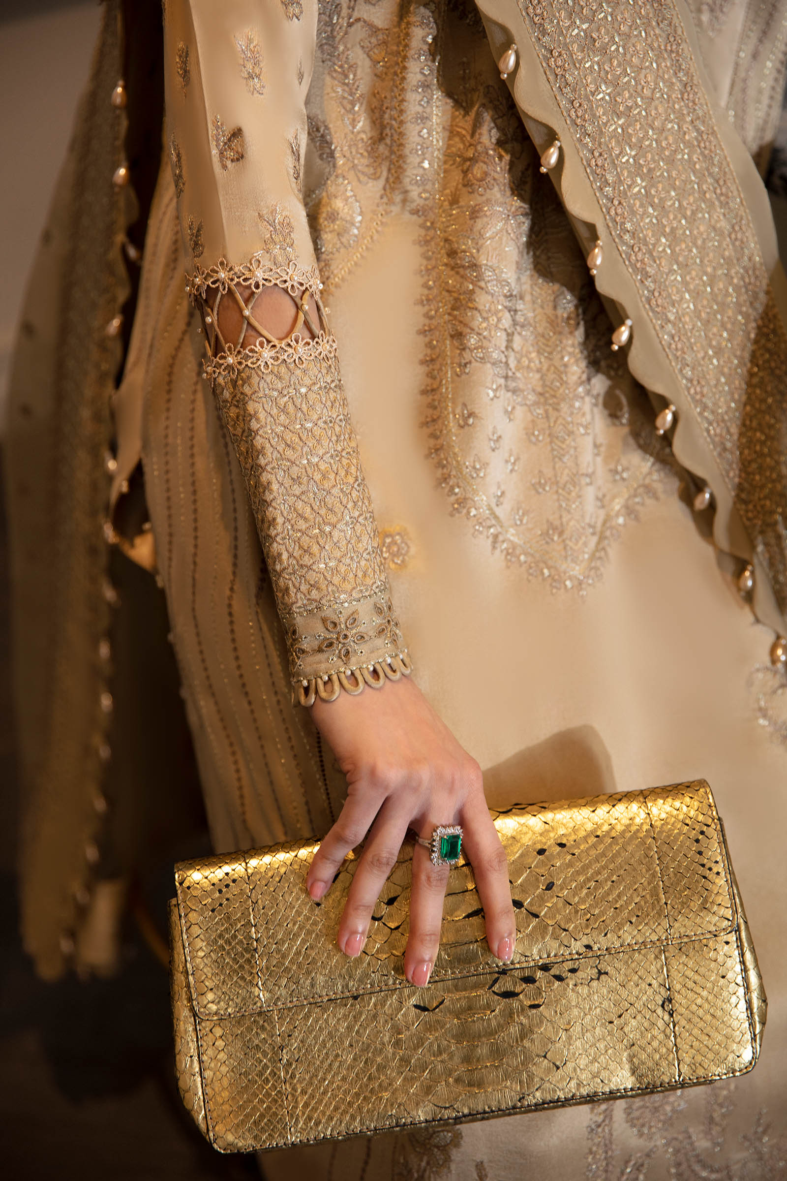 In the realm of minimalism, 'Conte doré' unfolds as a dream meticulously fashioned from dreamy gold raw silk, adorned with nuanced tone-on-tone embroideries. The ensemble, accompanied by an airy bordered dupatta and a tapered shalwar, not only encapsulates timeless elegance but also asserts itself as an enduring expression of style that transcends passing trends.