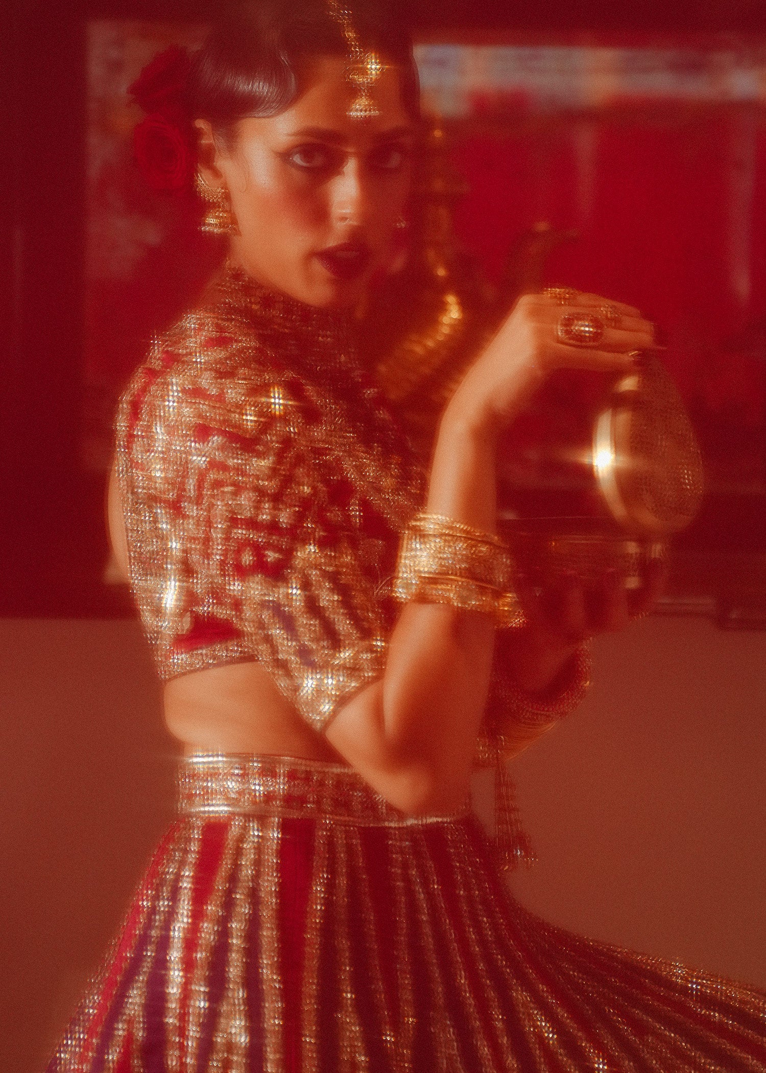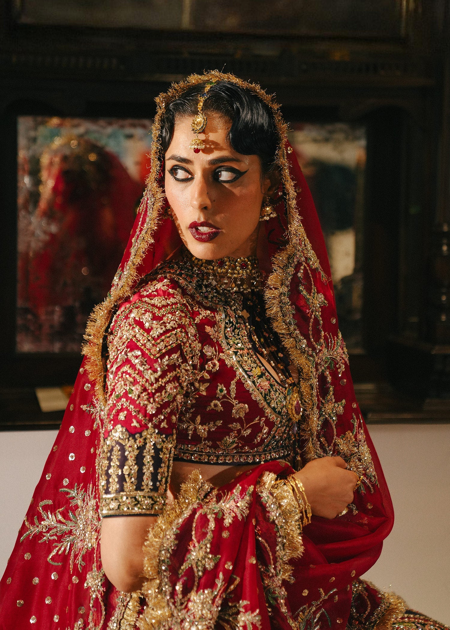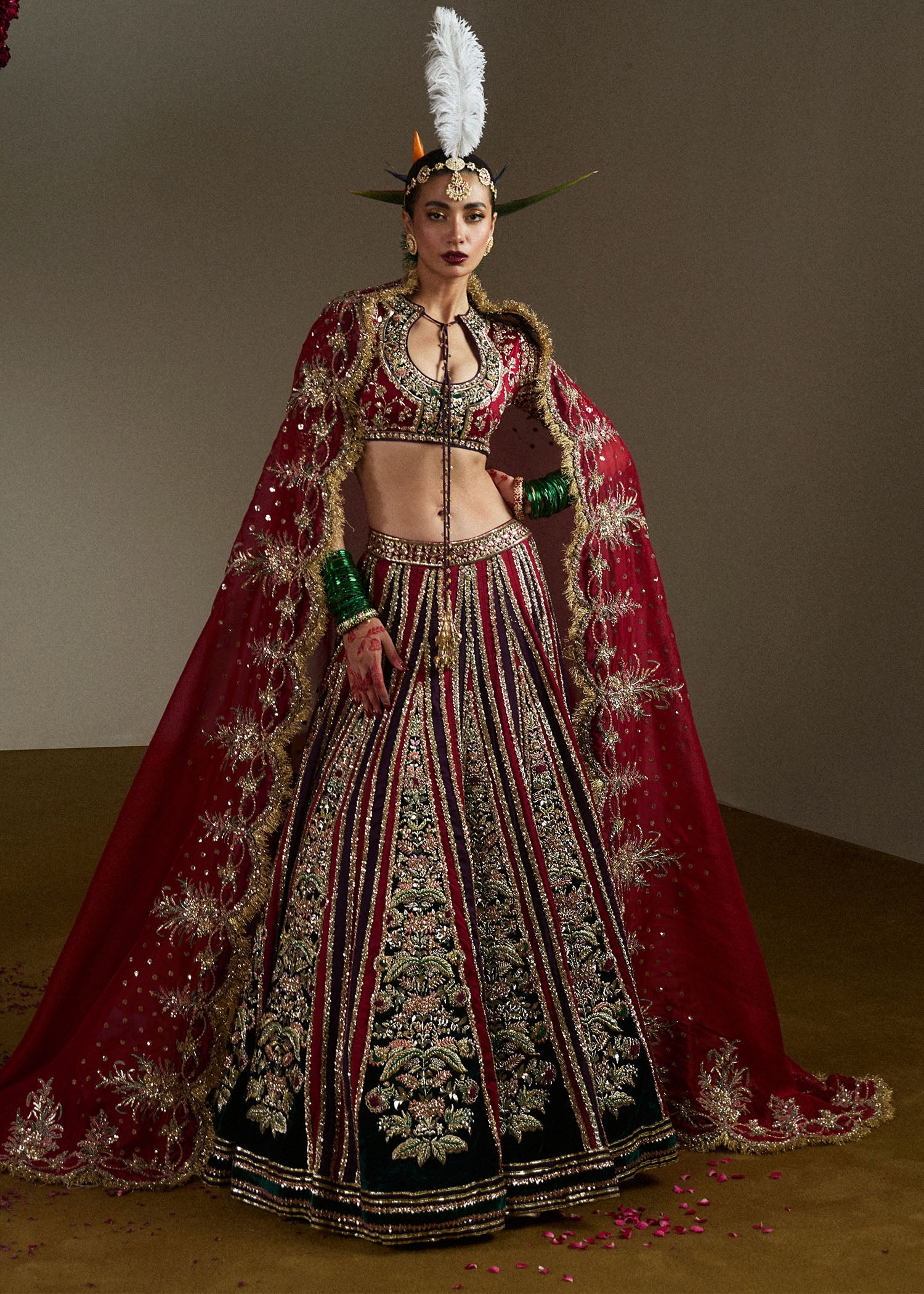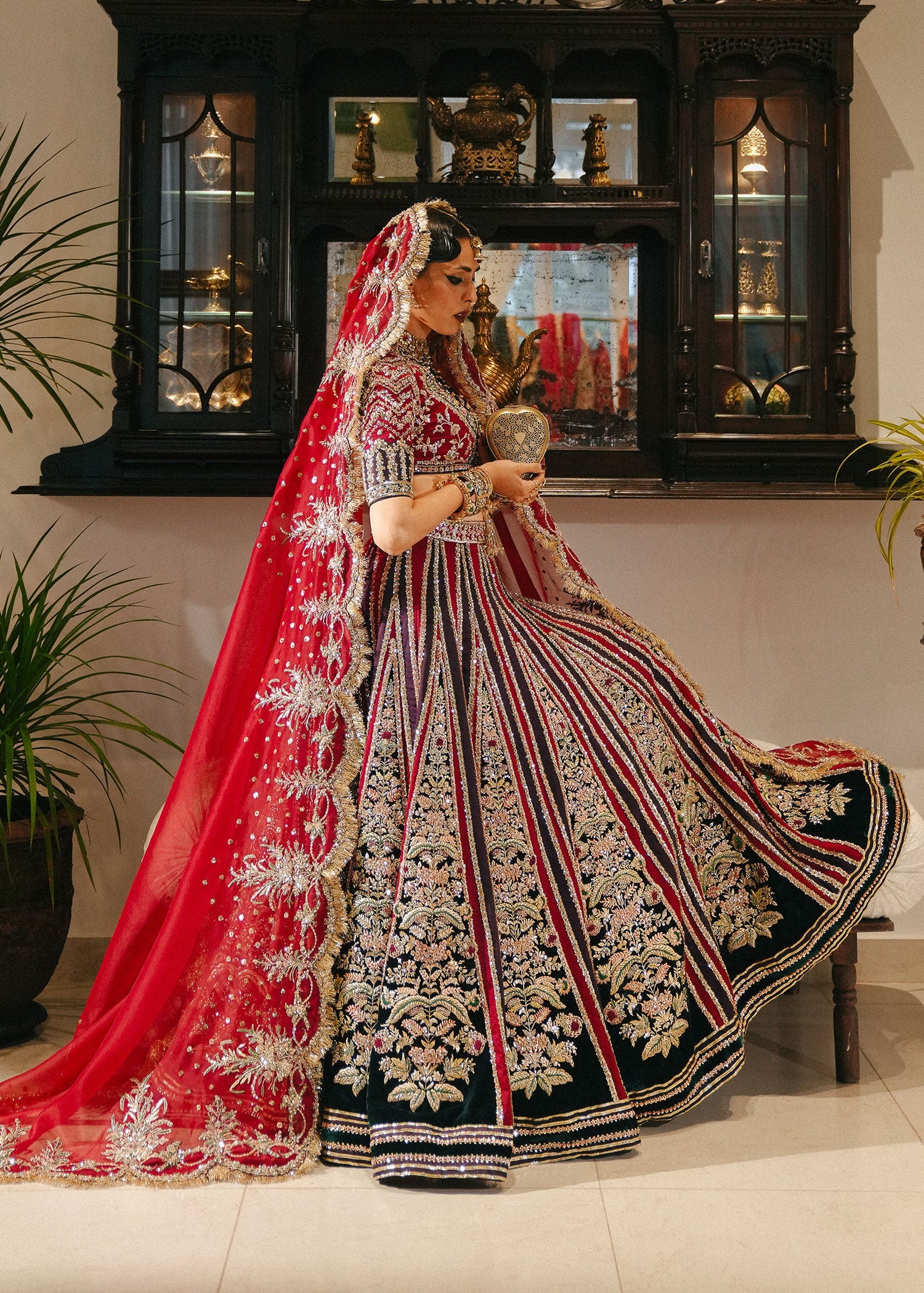 Turn heads in our unique double-colored velvet lehnga, showcasing rich red and bottle green pyramidal panels with intricate hand embellishments. Paired with a hand-embellished pure raw silk choli and a luxurious pure organza dupatta, this ensemble exudes elegance and sophistication. Perfect for any special occasion, it’s a true masterpiece of style!