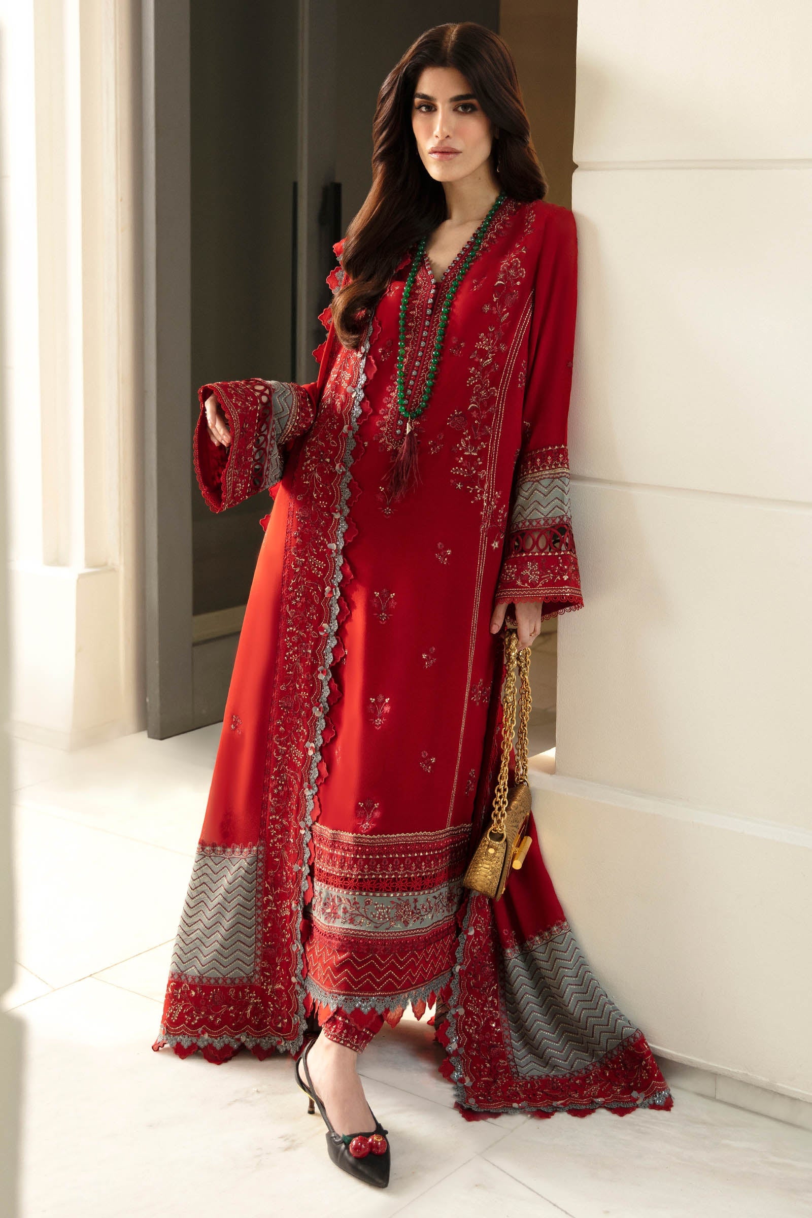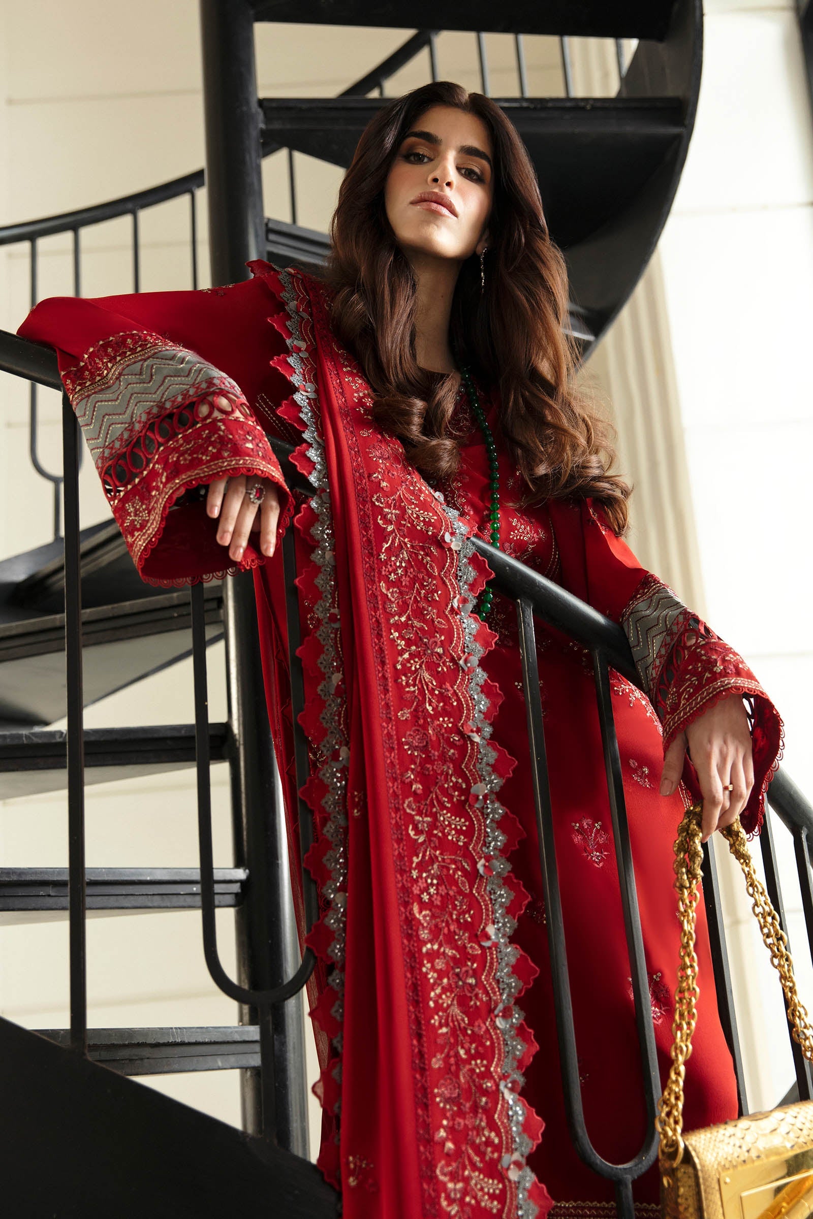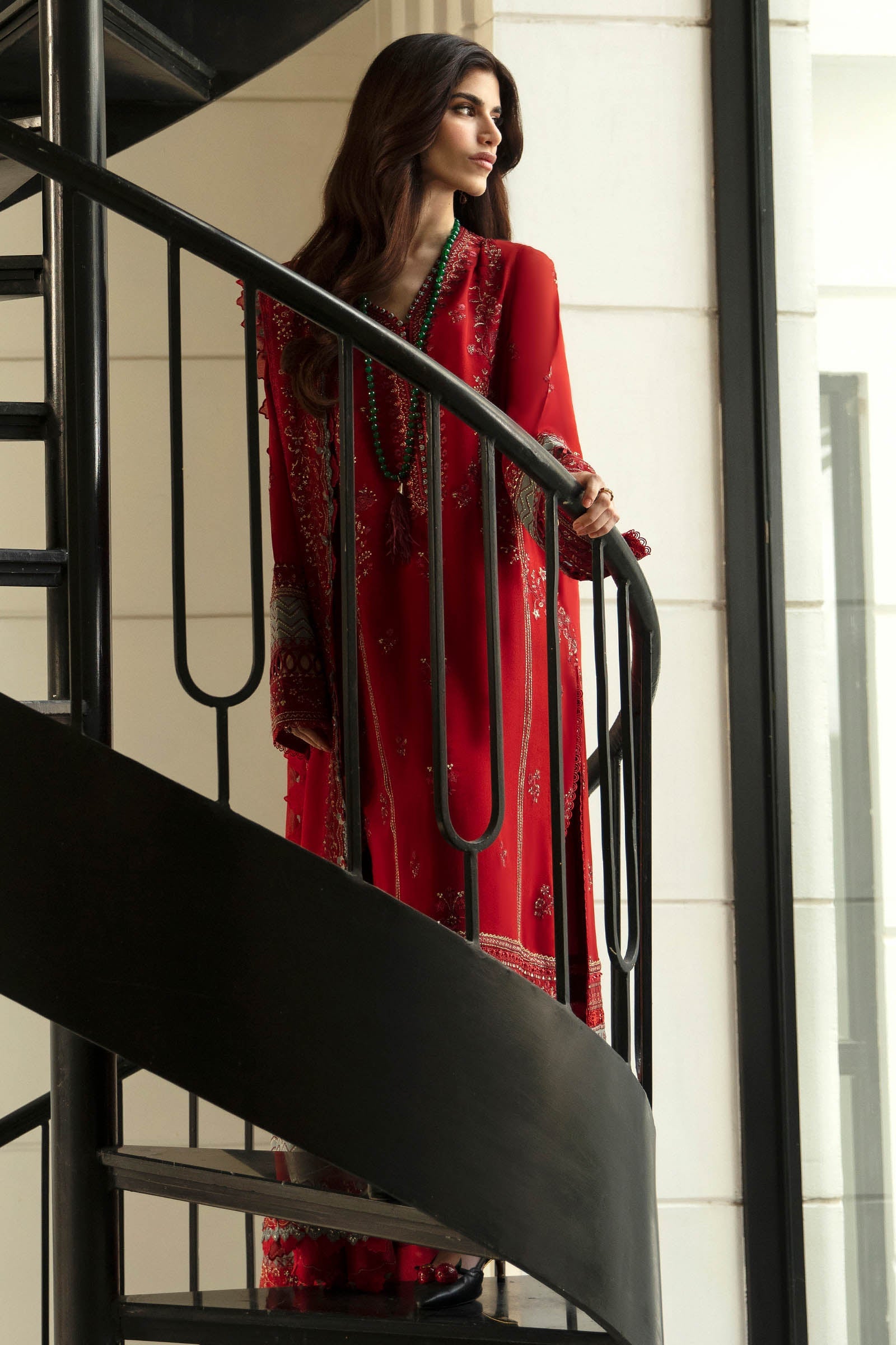 Draped in resplendent vermilion, 'Écarlisse' unfolds with a melange of tonal and contrasting slate embroideries, intricately interwoven through the fabric. The meticulously rendered floral motifs grace the neckline, infusing an aura of feminine sophistication into this sartorial masterpiece. Accompanied by a narrow shalwar and an ornately embroidered dupatta, this ensemble manifests as a paragon of timeless elegance.