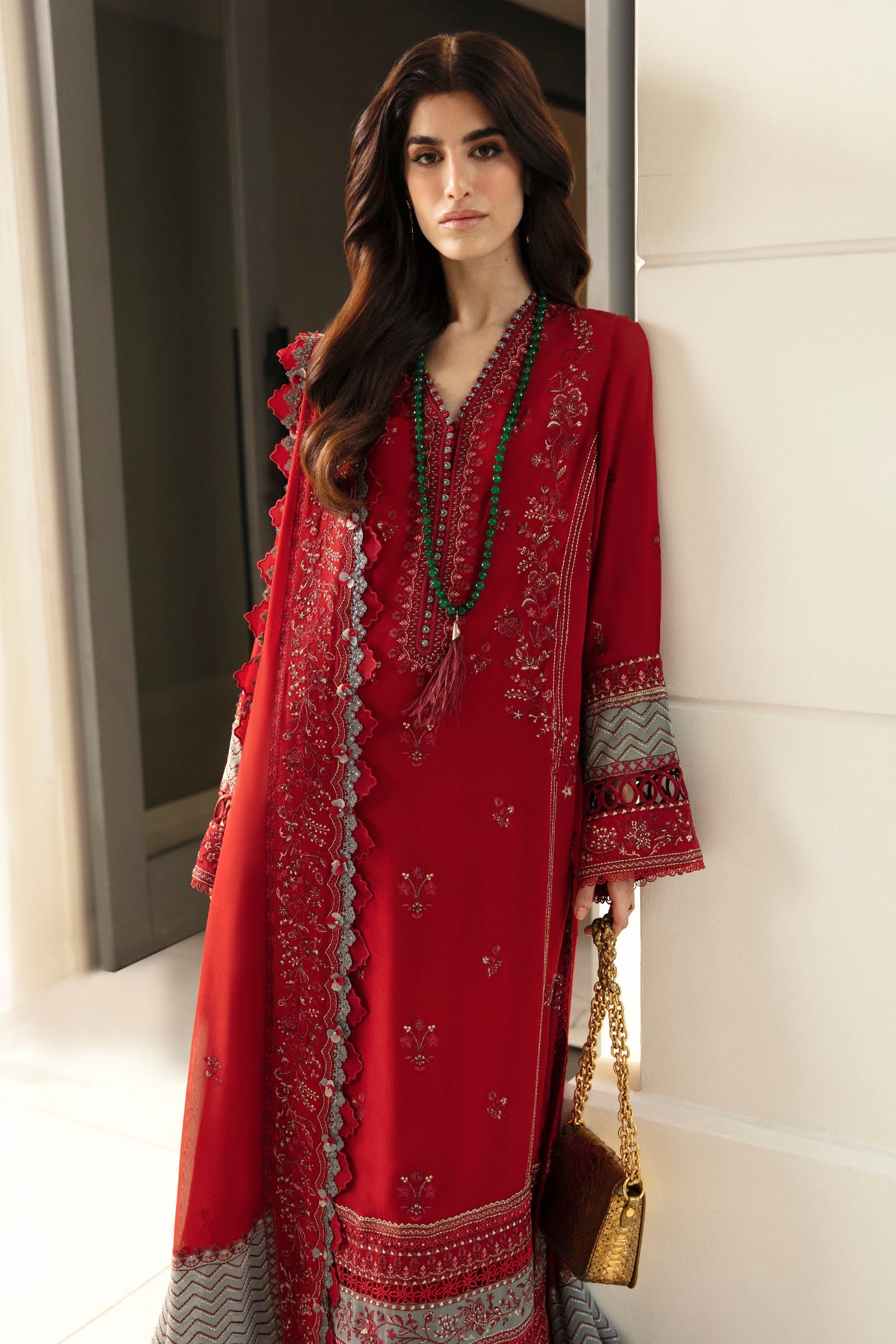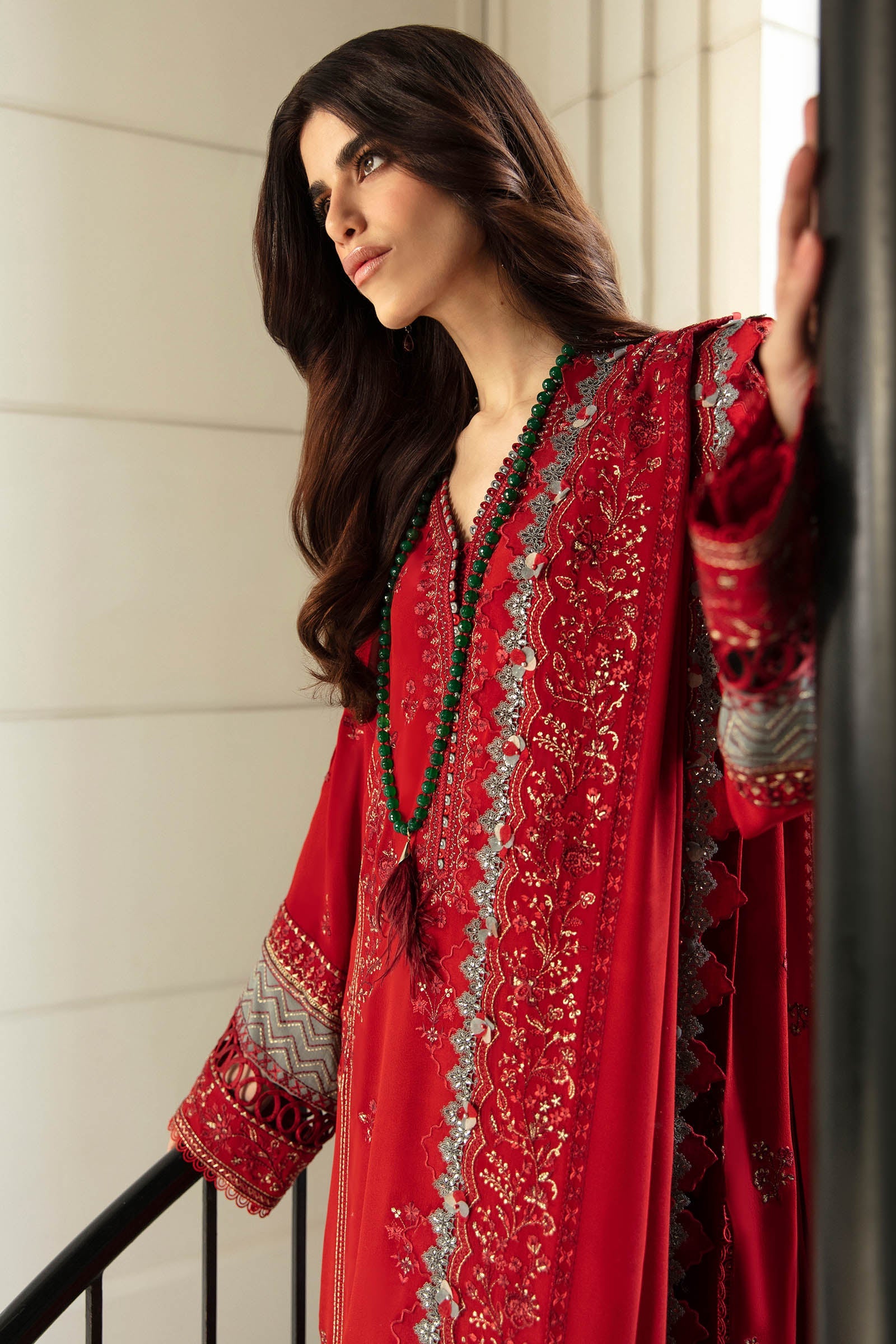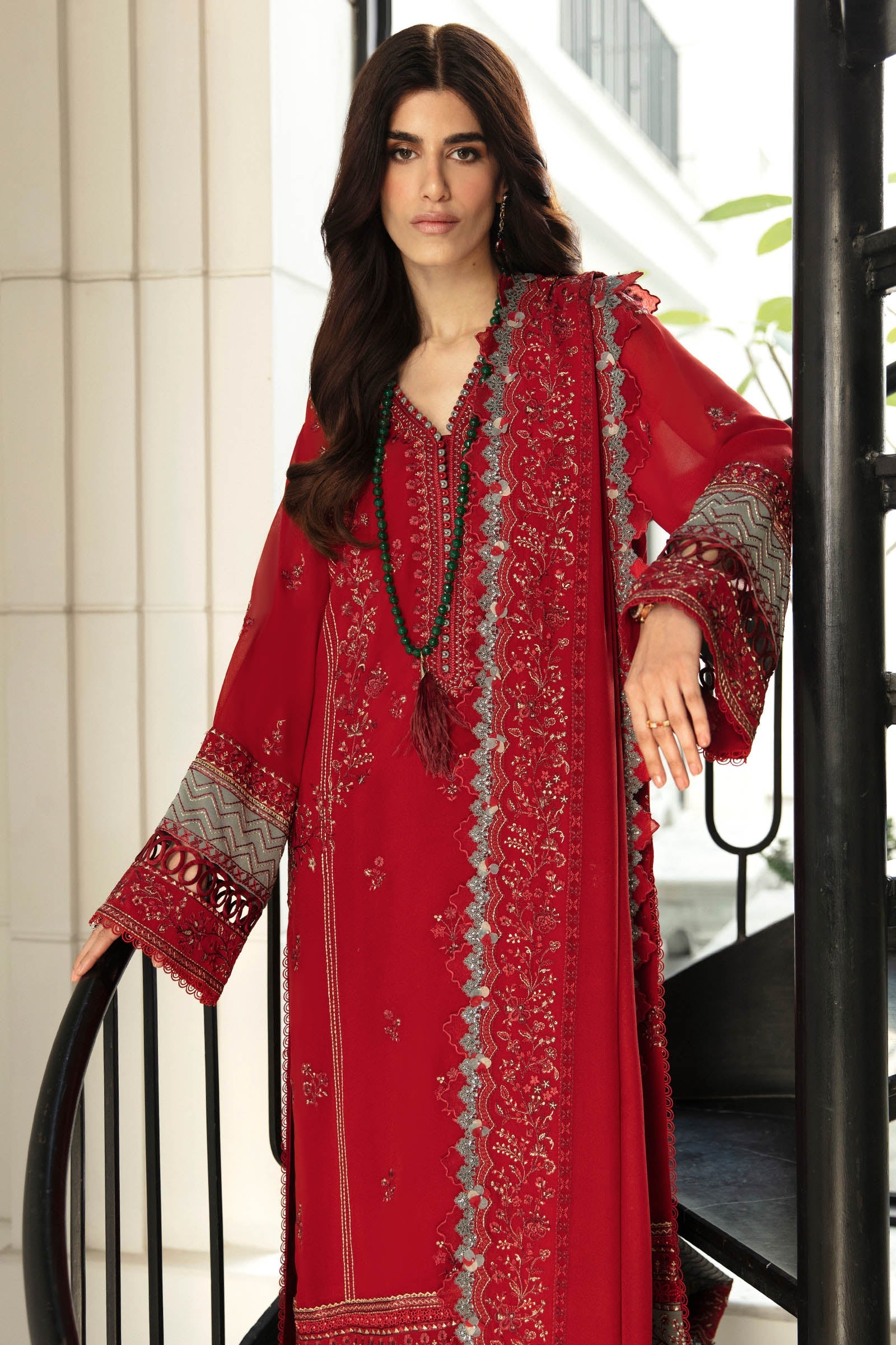 Draped in resplendent vermilion, 'Écarlisse' unfolds with a melange of tonal and contrasting slate embroideries, intricately interwoven through the fabric. The meticulously rendered floral motifs grace the neckline, infusing an aura of feminine sophistication into this sartorial masterpiece. Accompanied by a narrow shalwar and an ornately embroidered dupatta, this ensemble manifests as a paragon of timeless elegance.