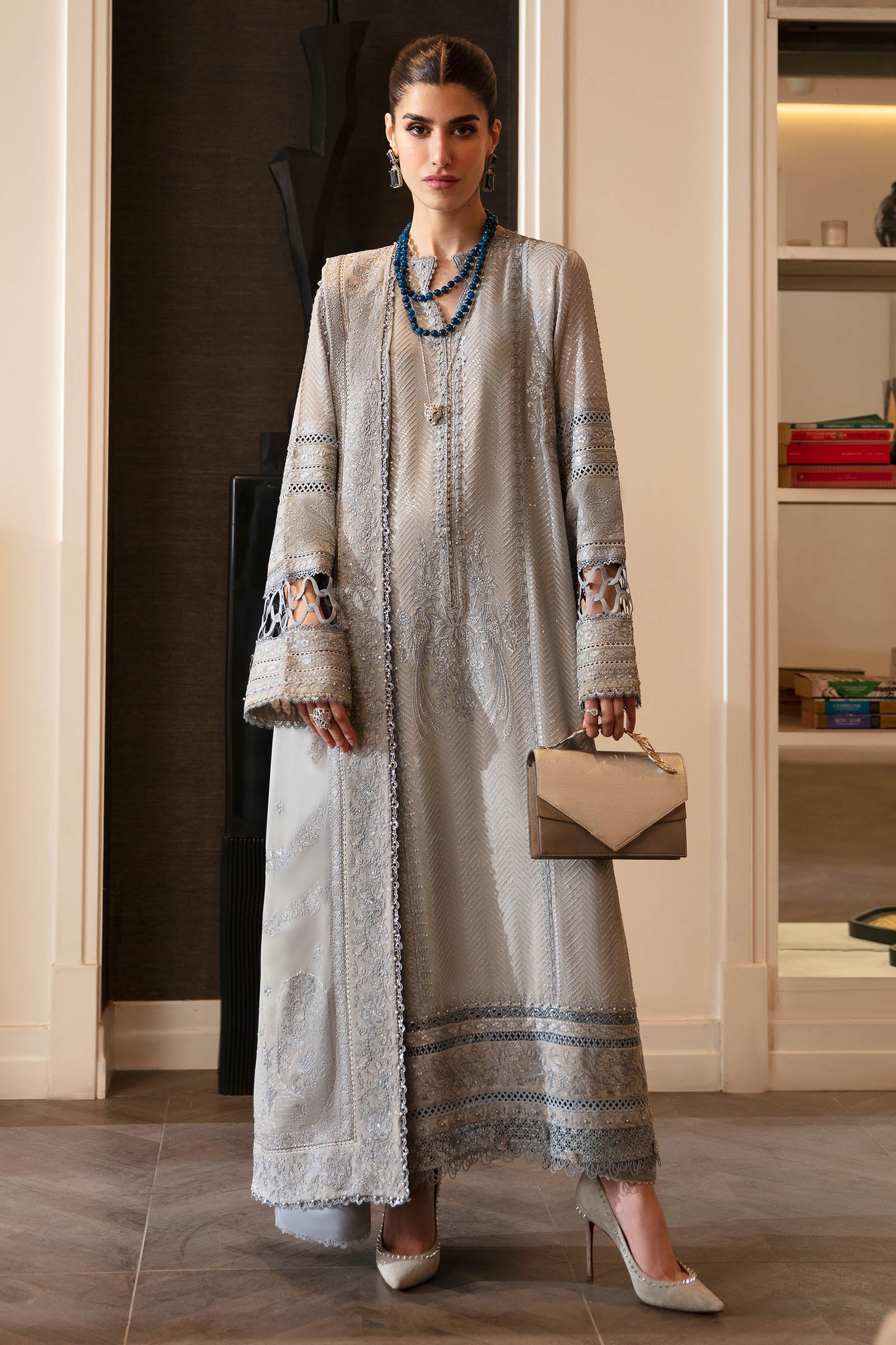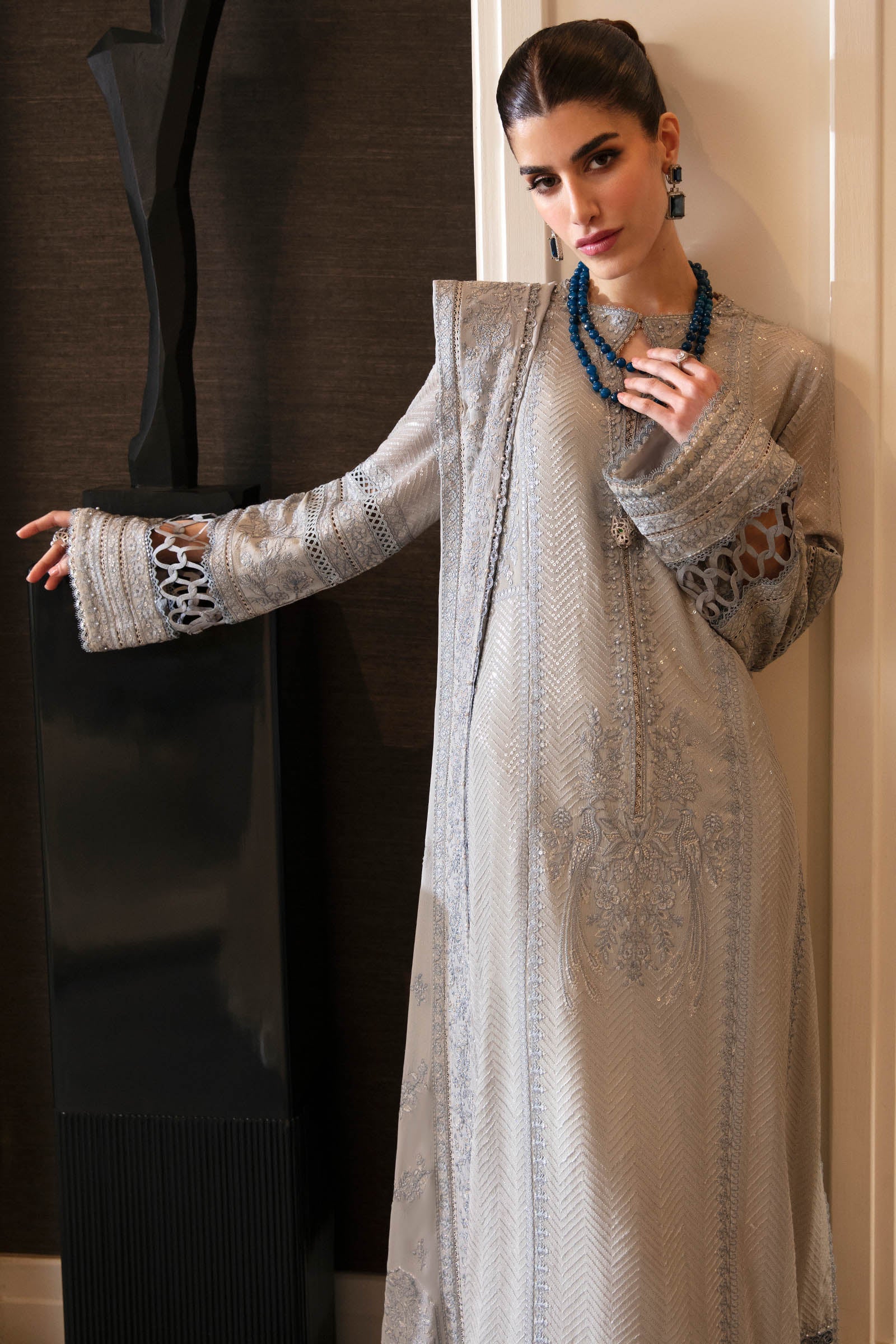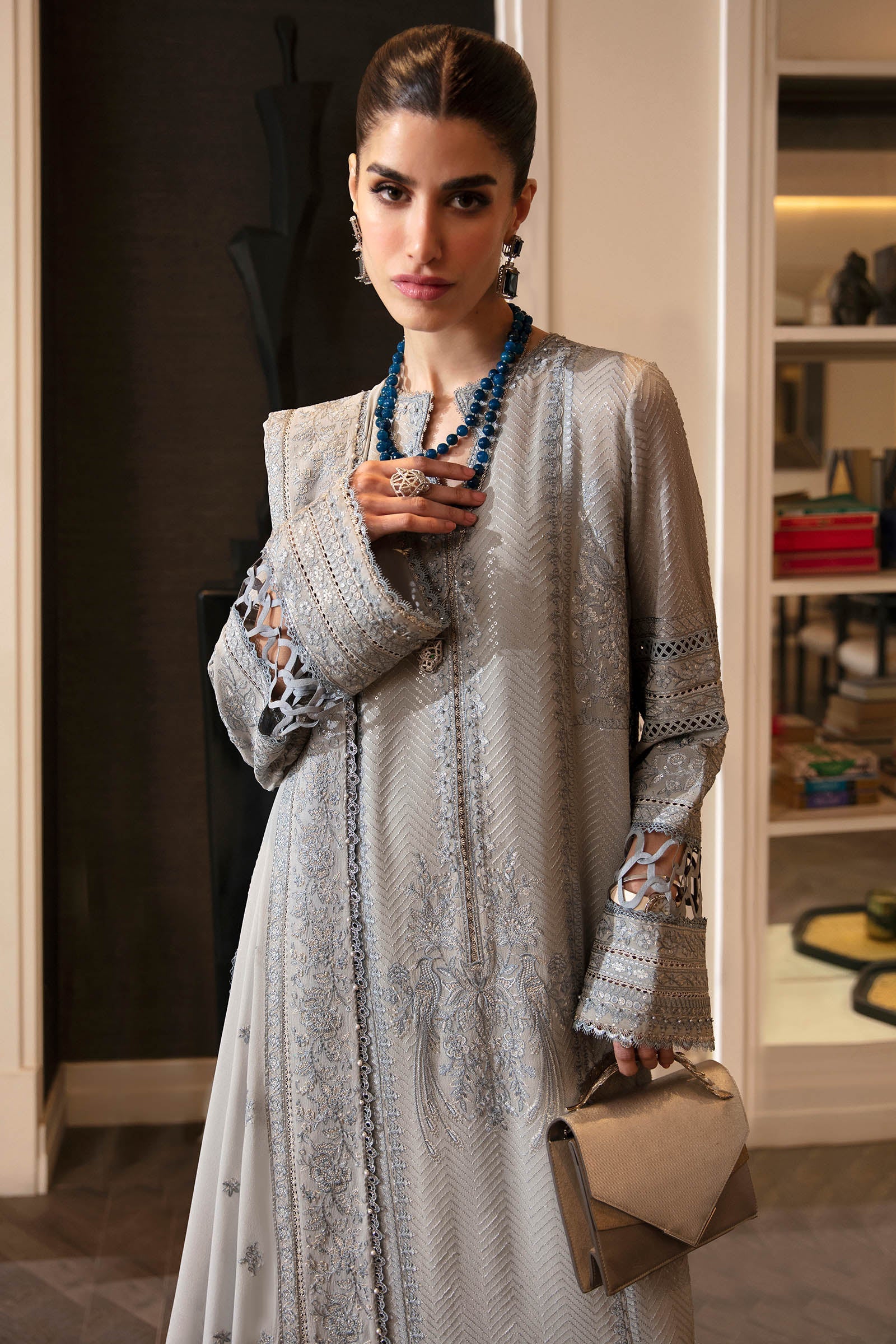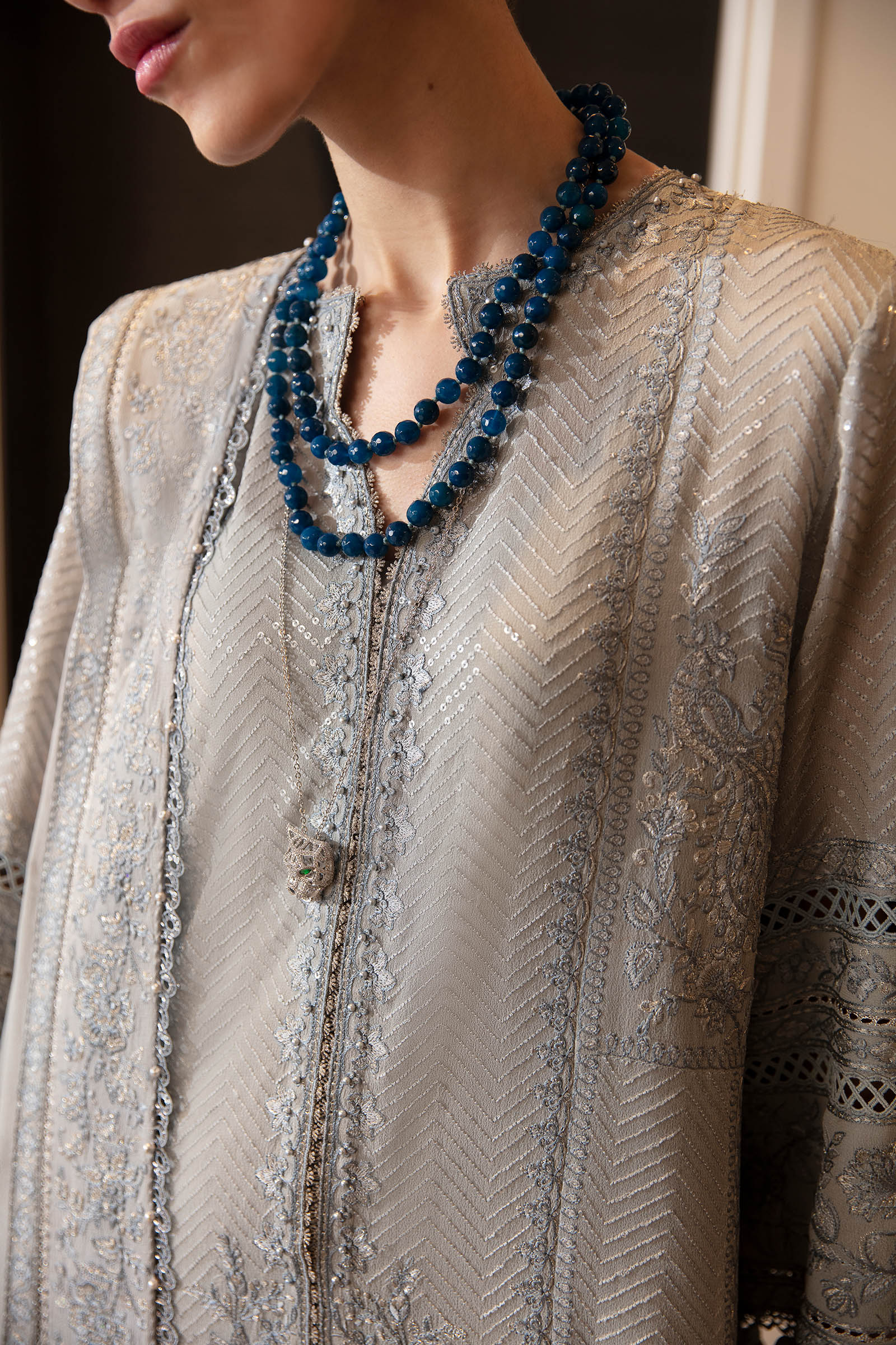 Evoking the quintessence of feminine charm, ‘Éclat Bleu’ captures a timeless silhouette in a mesmerizing azure grey hue. It is lavishly embellished with monochromatic resham embroidery juxtaposed with shimmering sequins strewn across sumptuous grip fabric, crafting an impeccable canvas for the intricate needlework. Complemented by an embroidered dupatta and a tres chic shalwar, it epitomizes a vision of ethereal beauty.