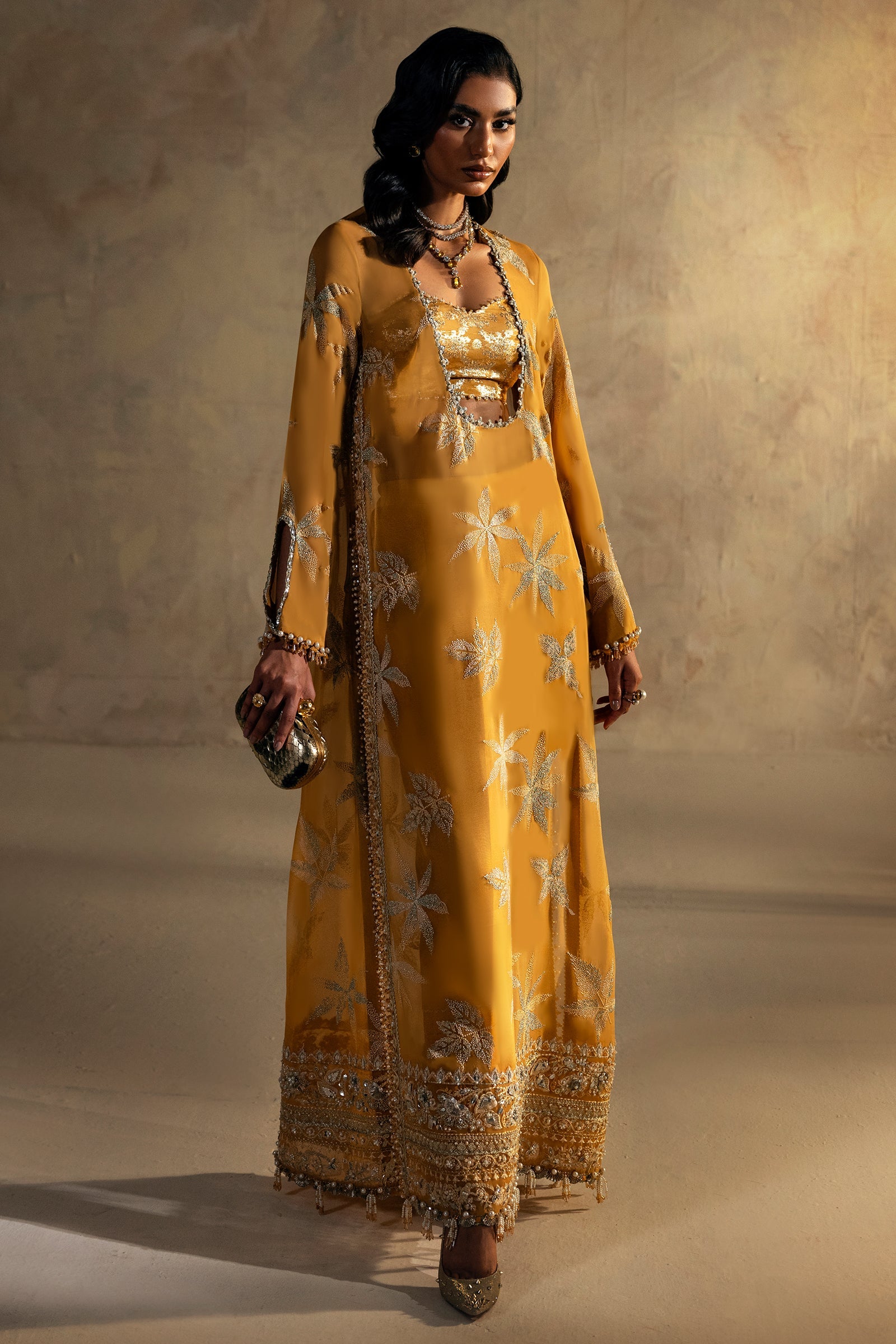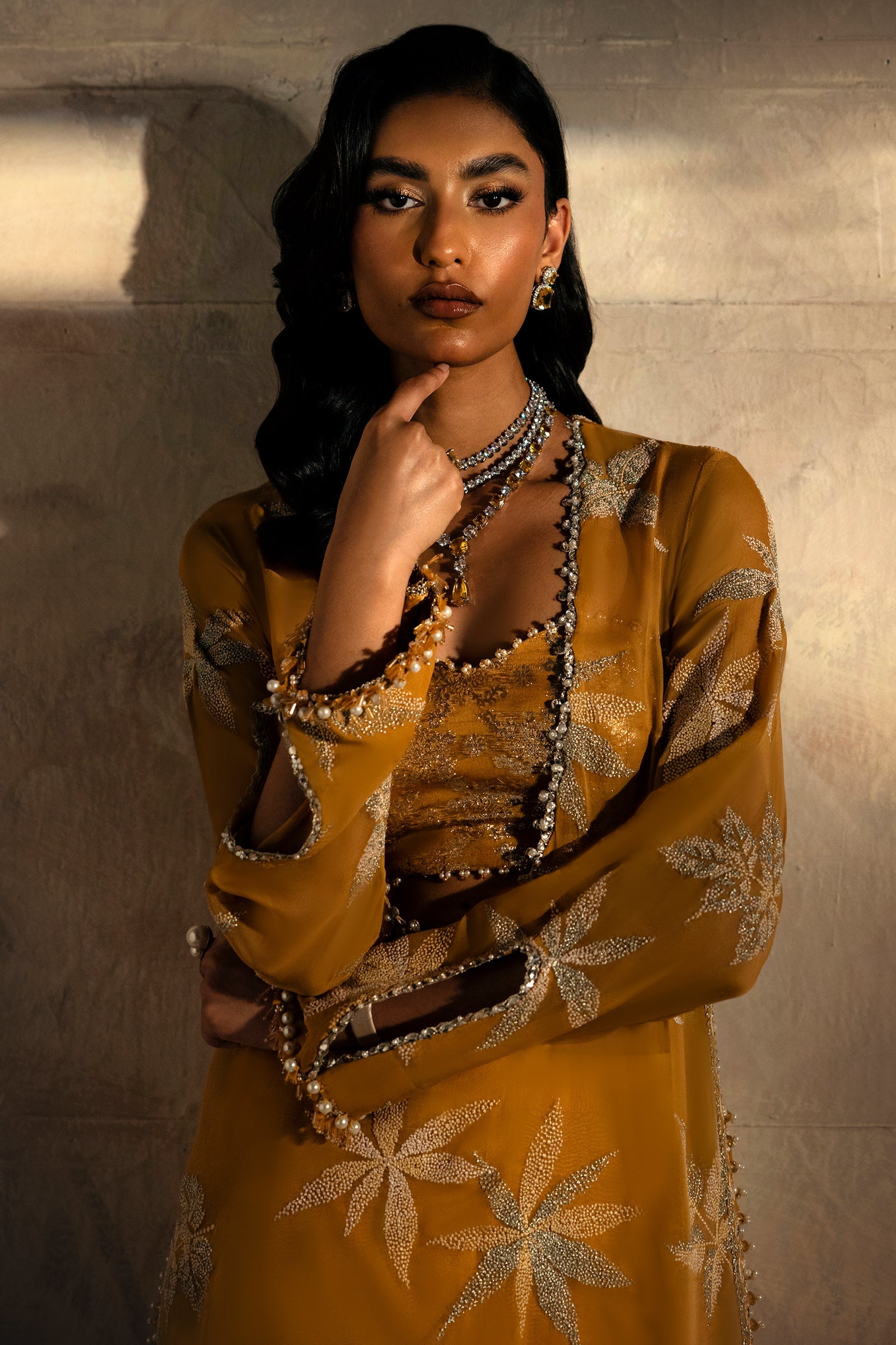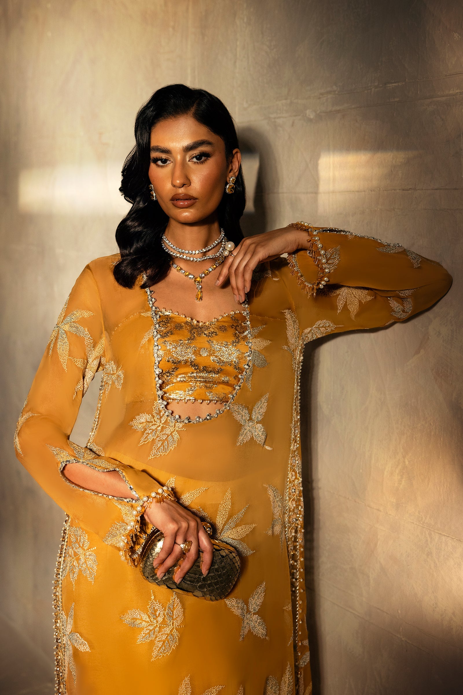 Immerse yourself in the sunlit splendor of 'Éclat du Soleil,' where the warm embrace of Tuscany yellow chiffon sets the stage for breathtaking monotone floral artistry. This sublime fabric unveils endless styling possibilities, allowing you to create a range of opulent looks designed for the most discerning occasions. Revel in the whimsical charm and versatile sophistication of 'Rose D'or,' as you enter any event with unparalleled grace and elegance. Craft this exquisite ensemble to captivate and enchant this wedding season, ideal for making an unforgettable impression at mayos.