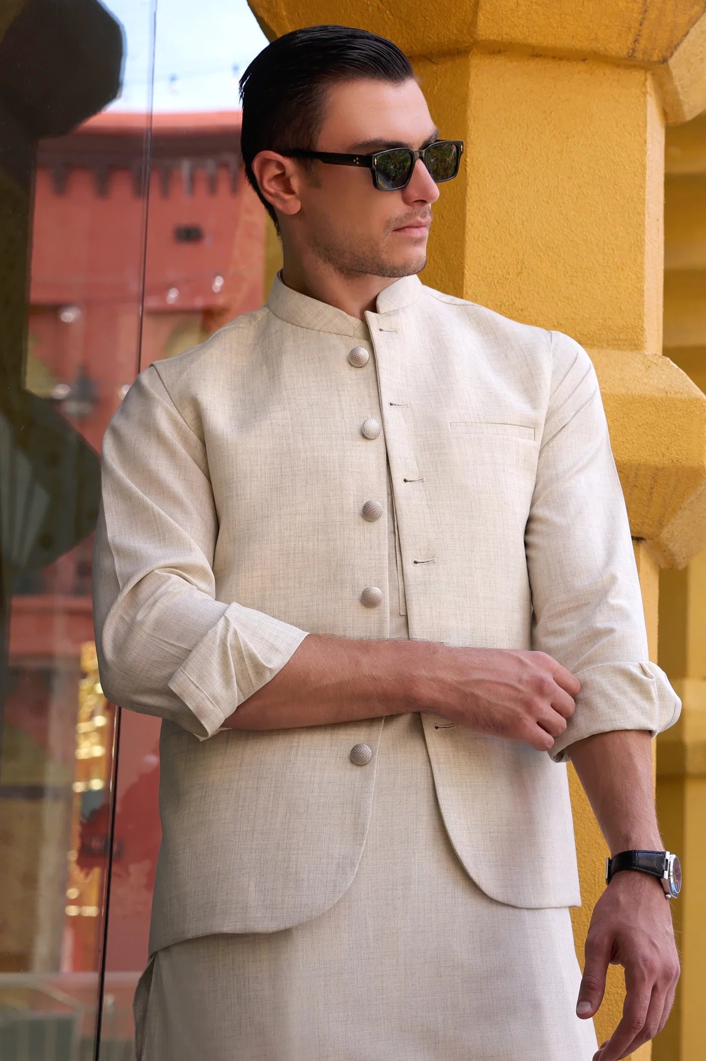 Fawn Shalwar Kameez with Waistcoat