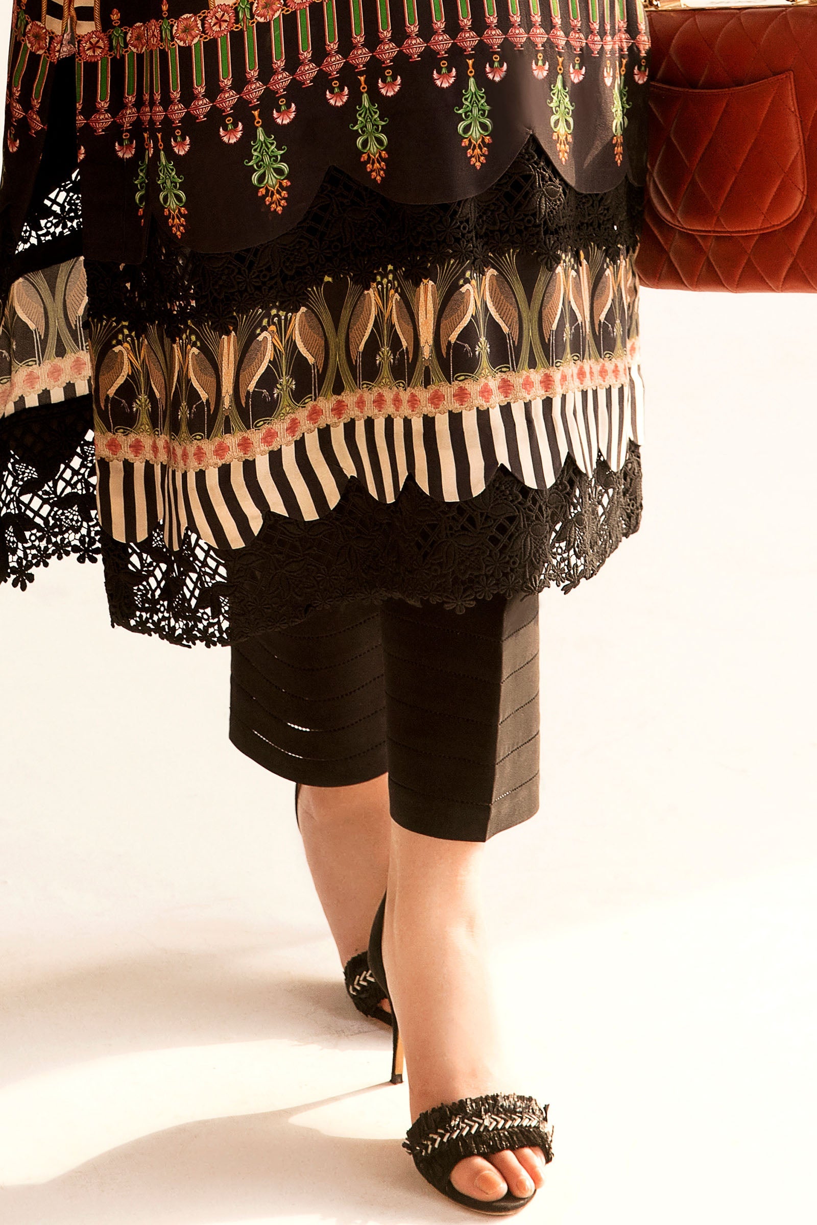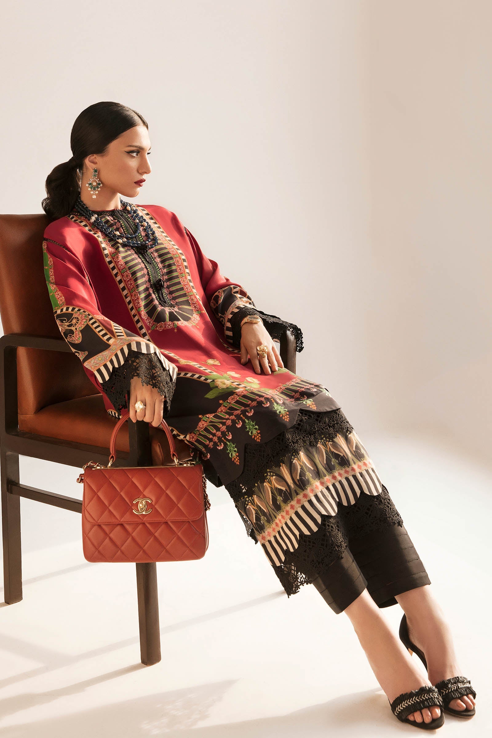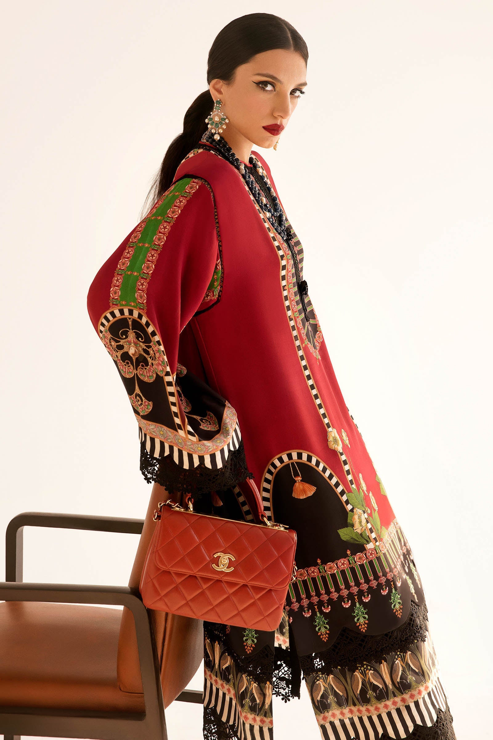 Rendered in the bright hue of scarlet and accents of ebony, ‘Sarv’ is decorated with wild flora juxtaposed with tessellated patterns depicting vivid, contrasting colours of moss, ivory and laguna yellow. This chic silhouette is adorned with delicate lace details in obsidian to curate a look perfect for al fresco affairs and soirées.