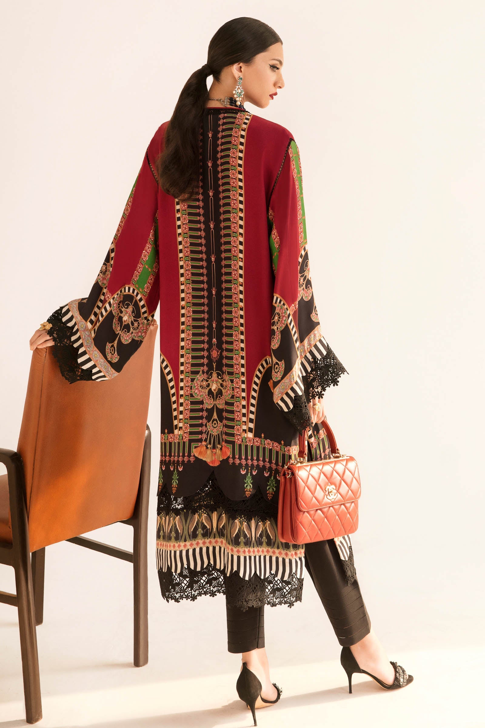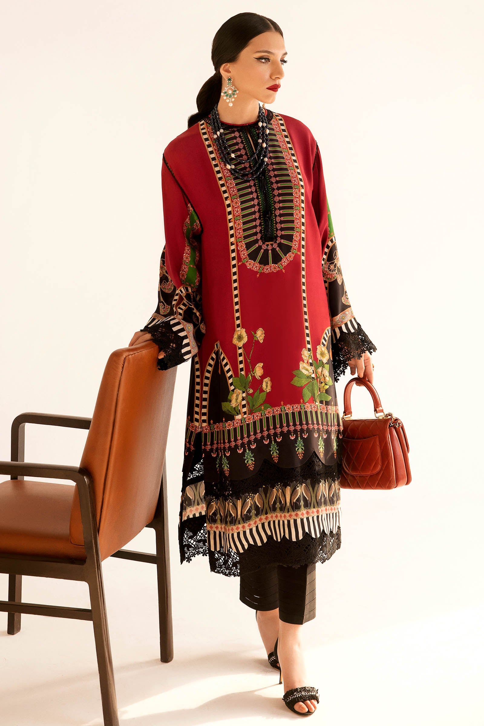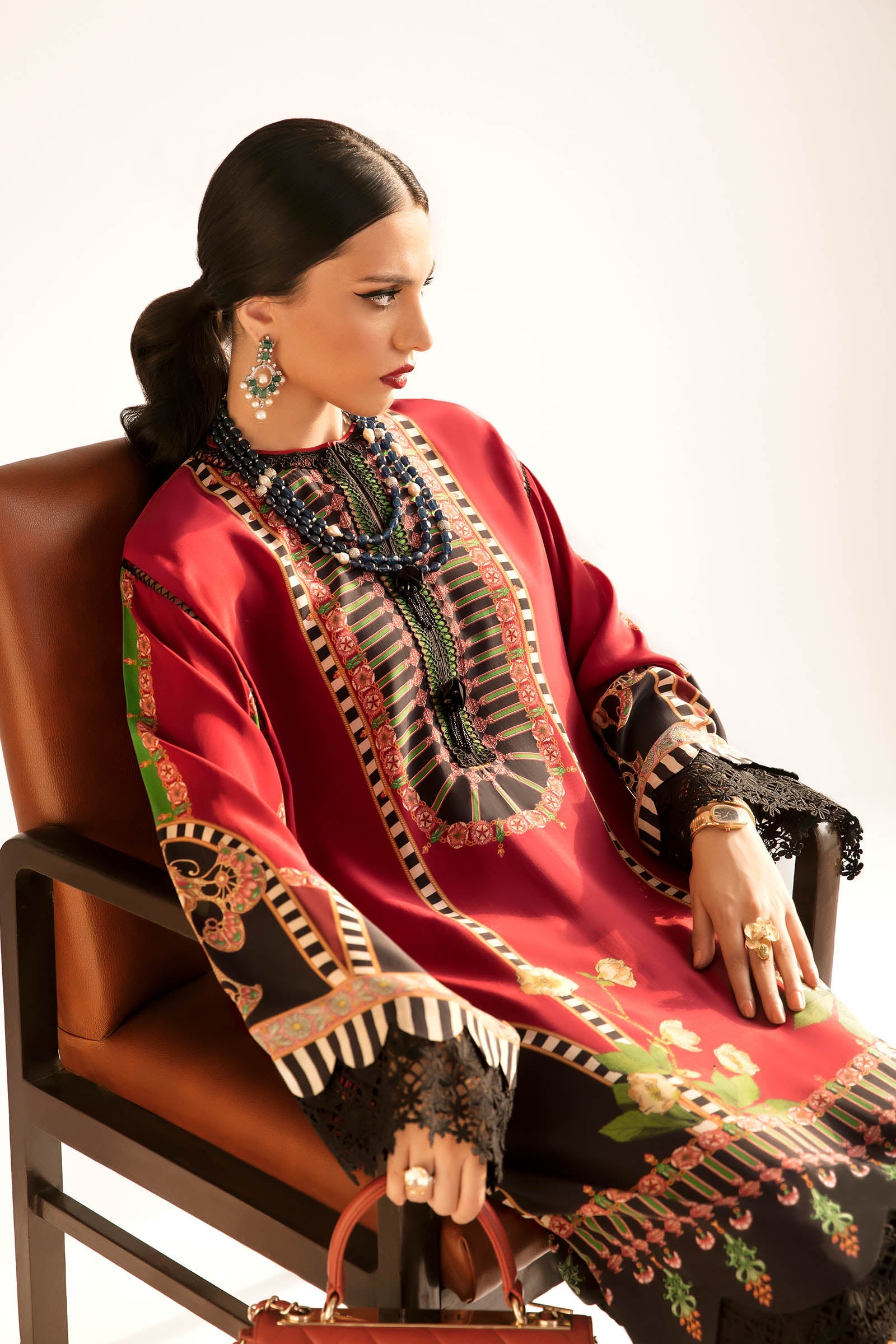 Rendered in the bright hue of scarlet and accents of ebony, ‘Sarv’ is decorated with wild flora juxtaposed with tessellated patterns depicting vivid, contrasting colours of moss, ivory and laguna yellow. This chic silhouette is adorned with delicate lace details in obsidian to curate a look perfect for al fresco affairs and soirées.