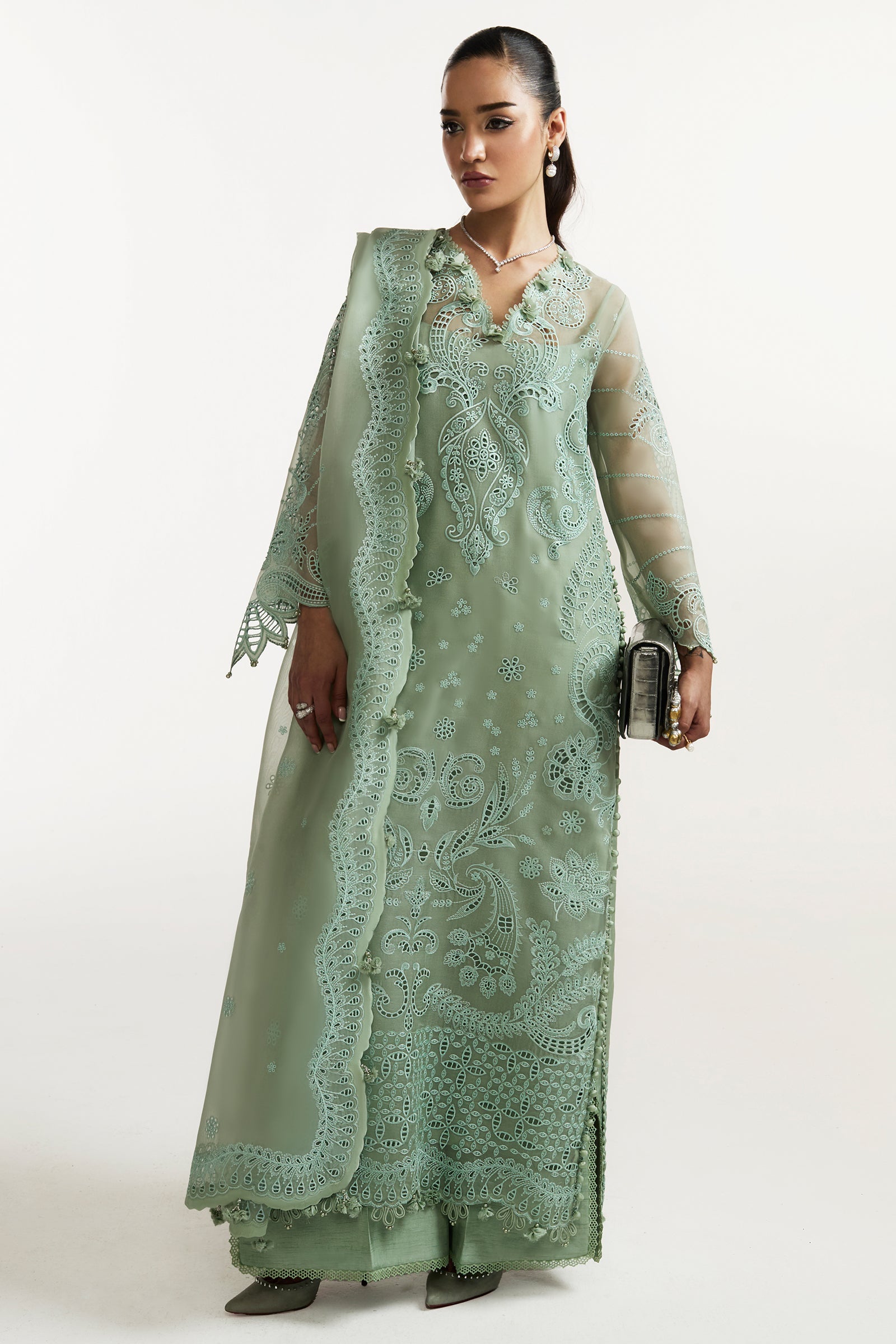 Élysée – A poetic reverie of Parisian elegance and ethereal grandeur, this celestial mint masterpiece embodies the je ne sais quoi of timeless sophistication. Adorned with delicate floral tendrils and exquisite tonal embroidery, each motif is a testament to artisanal precision, evoking the romance of haute couture ateliers.
