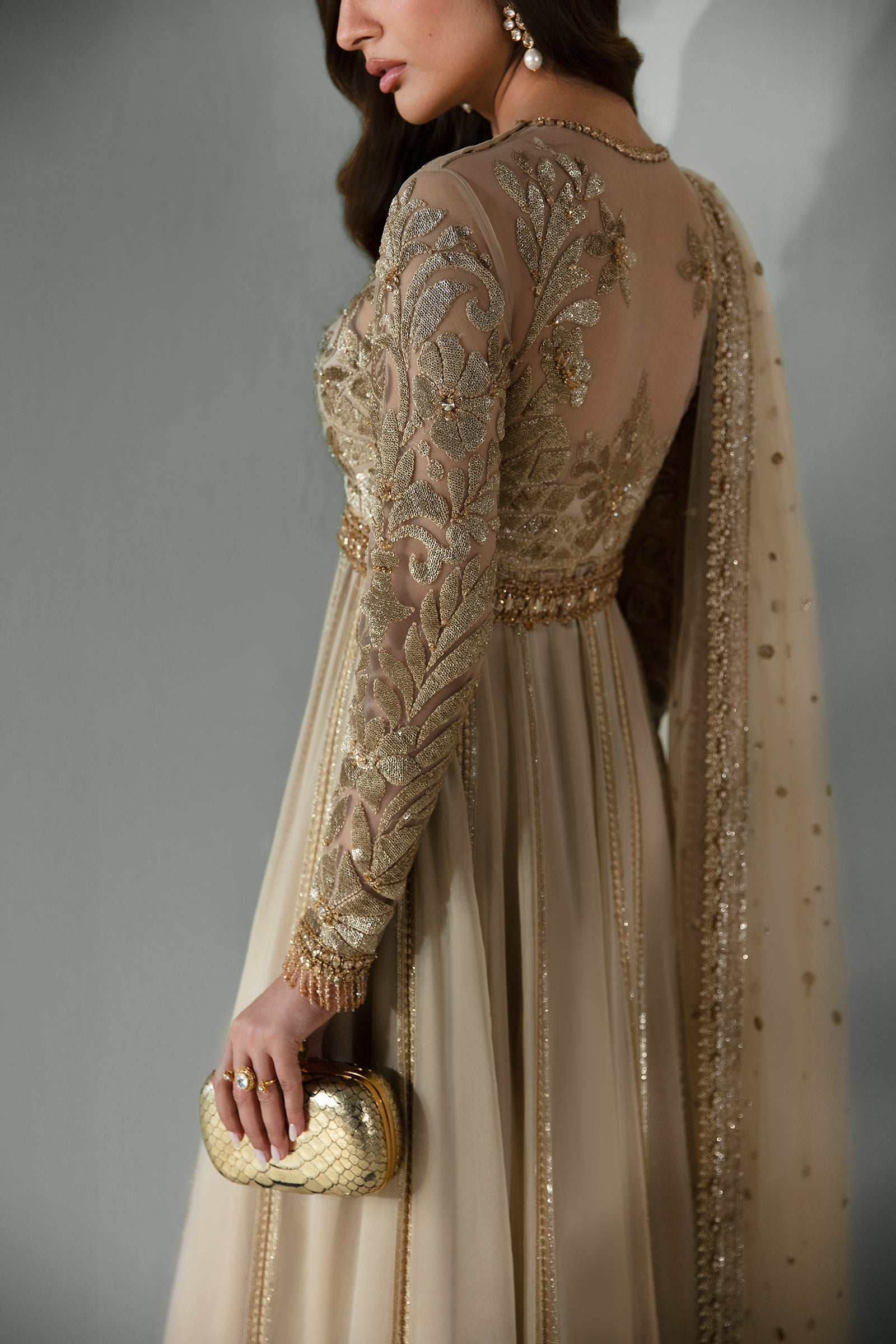 Élan Luxury Prêt presents Nuit Céleste, an exquisite masterpiece bathed in the soft glow of celestial champagne gold. This opulent pishwas is a symphony of luxury and grace, featuring a meticulously hand-embroidered bodice that glistens with intricate detailing, each thread woven to catch and reflect light in the most captivating way. The silhouette flows in a cascade of ethereal layers, creating a mesmerizing, almost otherworldly movement with every step. Enveloped by borders adorned in delicate embellishments, this gown is a testament to fine craftsmanship and elevated elegance. Designed for those who embody timeless sophistication, Nuit Céleste transforms any evening into a grand affair, enveloping the wearer in a golden aura that speaks to the heights of celestial allure and grandeur.