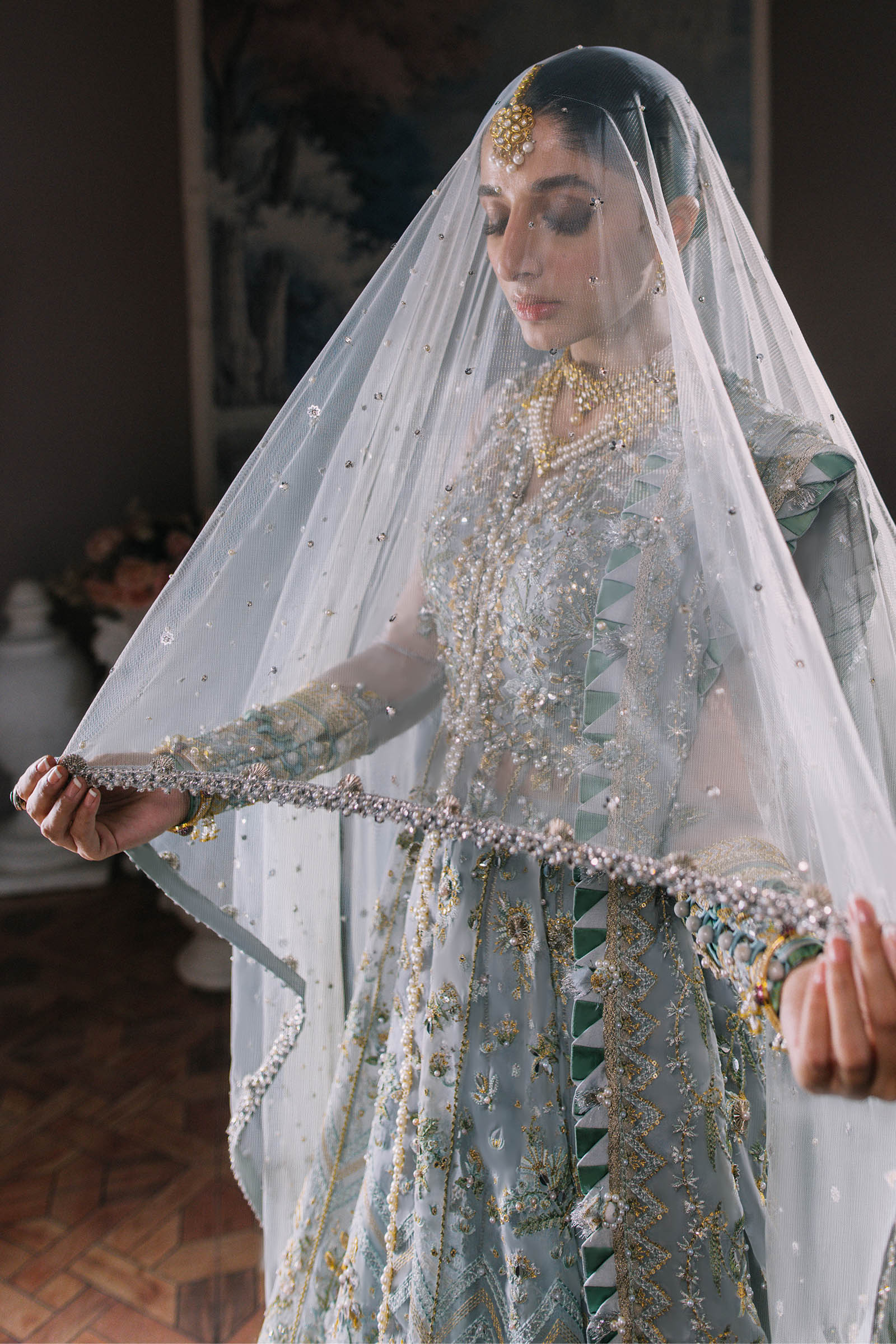 Get ready to sparkle in 'Esme' - an ethereal creation that's a work of art. Ice blue tulle comes alive with scintillating florals, and iridescent details accentuate the overall composition. Hand-placed sequins, crystals, and seed pearls add a touch of glamour to the silver and silk thread-worked blooms. The dreamy organza dupatta features intricately embroidered borders and elaborately worked pallus, making it a showstopper that's sure to captivate. With its classic, elongated silhouette, 'Esme' is a treasure that you'll cherish forever.