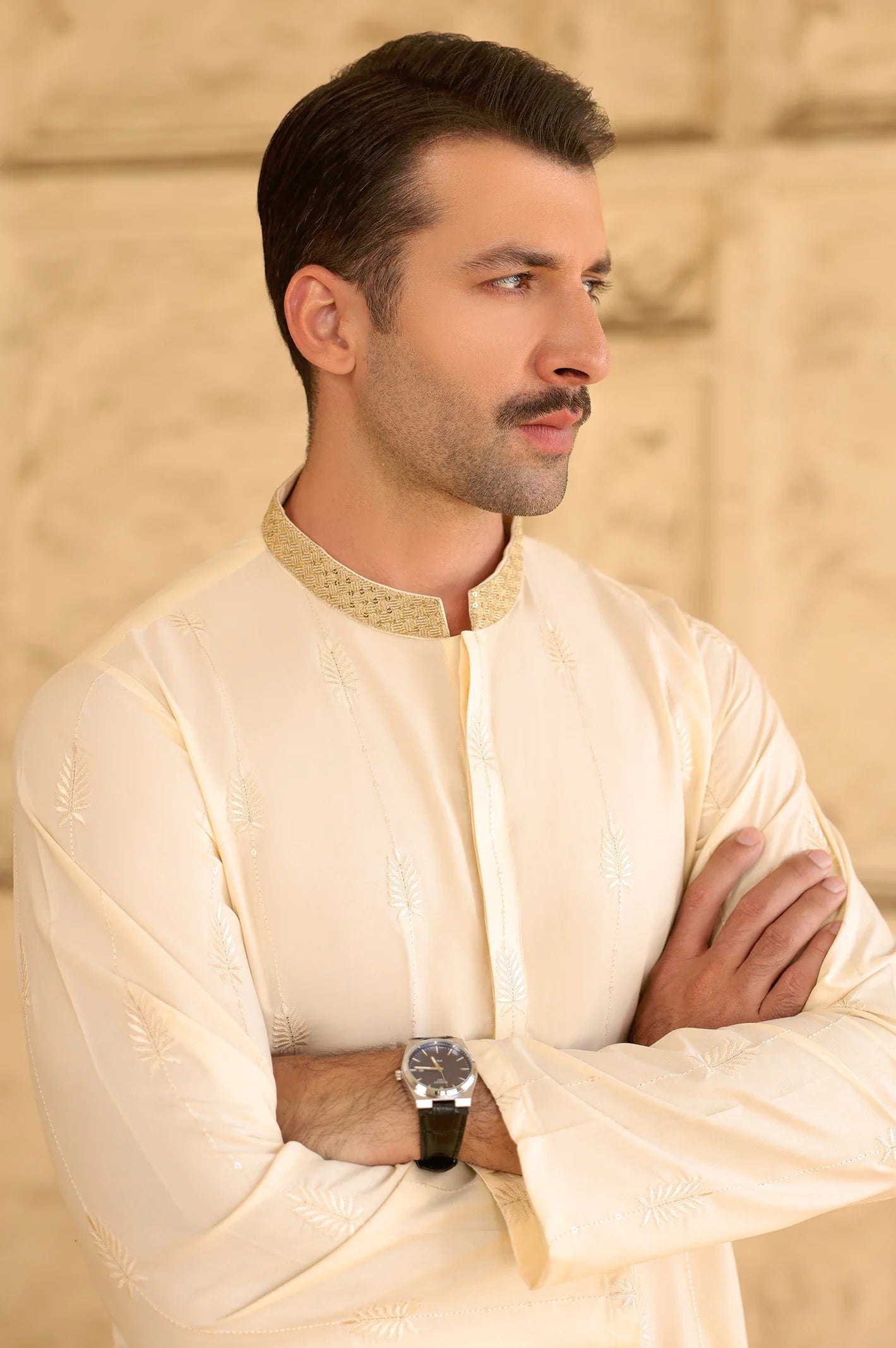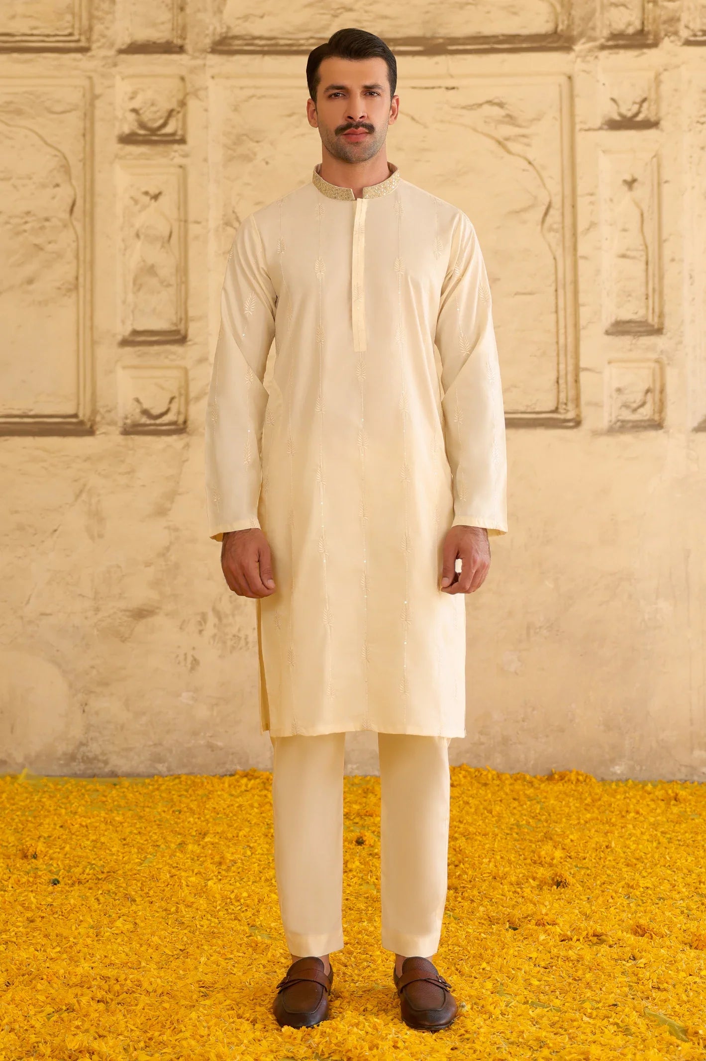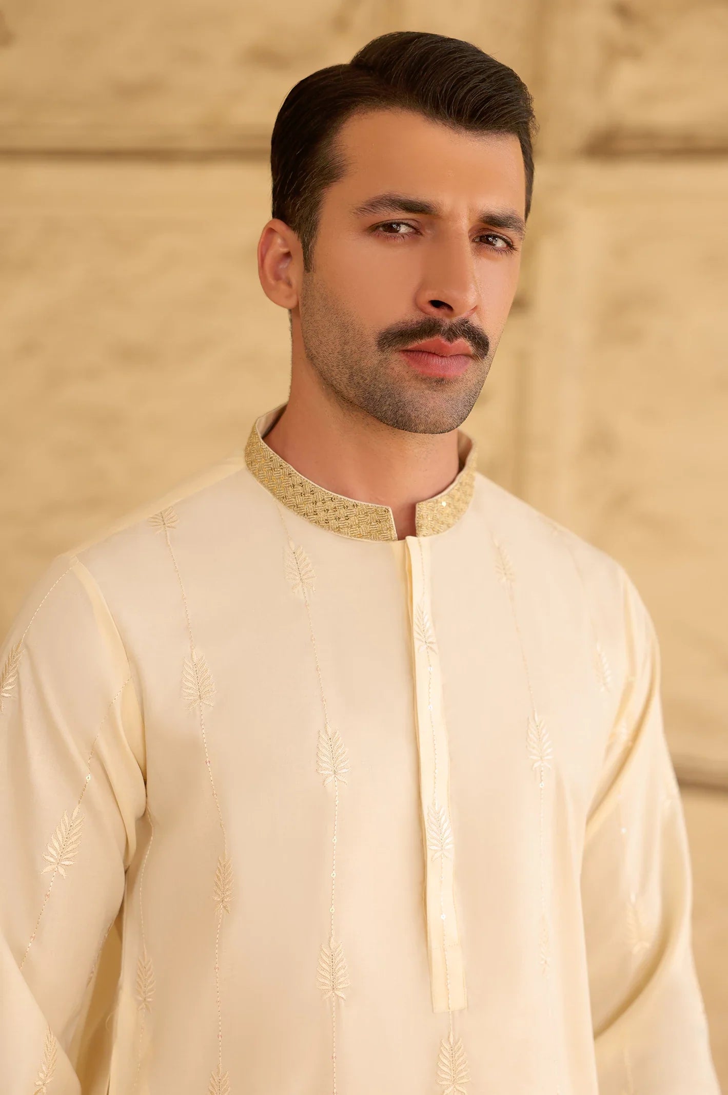 - Collar Type: Embroidered Band Collar