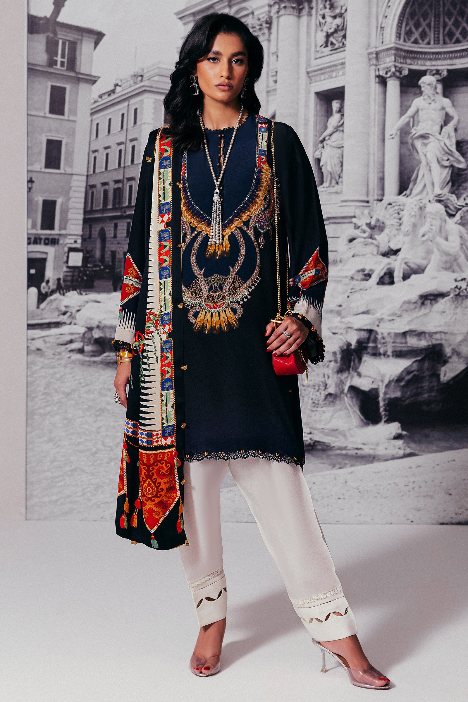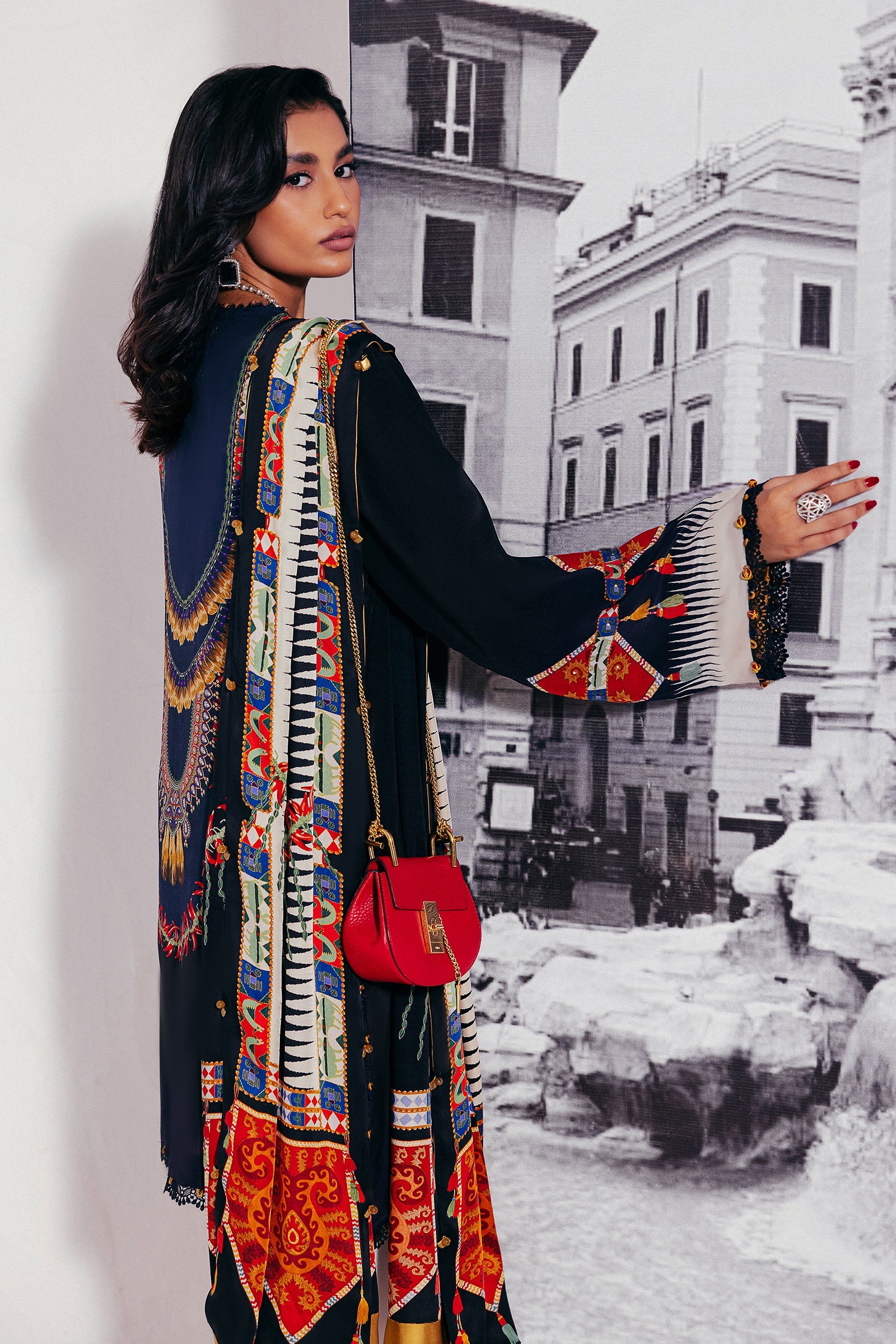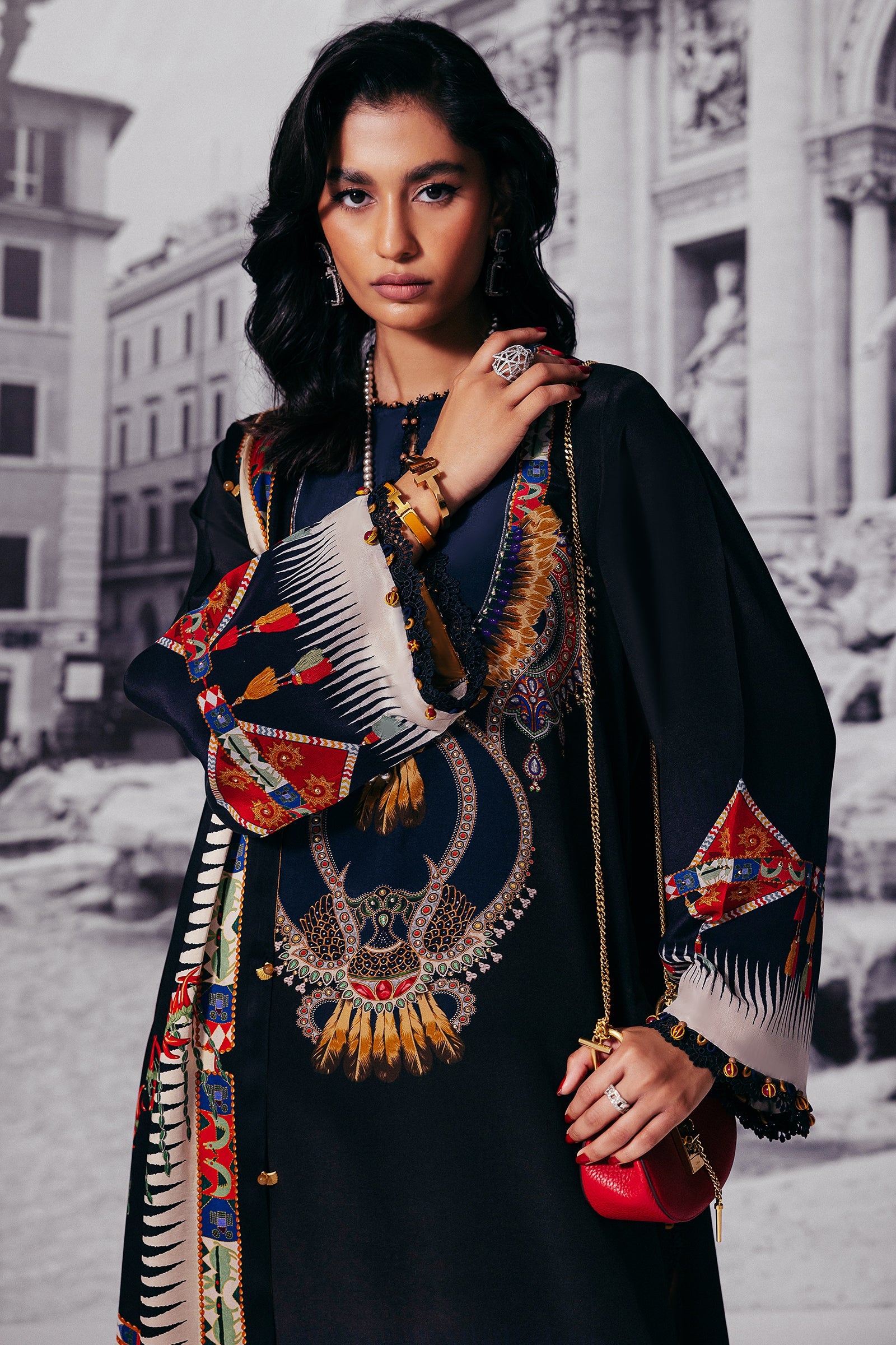Introducing ‘Éliane’: A symphony of sophistication and grandeur, this masterpiece is enveloped in opulent midnight blue, adorned with a mesmerizing blend of wild florals and tessellated patterns in rich scarlet red, pristine ivory, and golden honey. Infused with an Egyptian essence, the design is elevated by a vibrant dupatta showcasing a luxurious spice composition. Delicate obsidian lace details further enhance the ensemble, creating a look of unparalleled elegance. Perfect for upscale al fresco affairs and glamorous soirées.