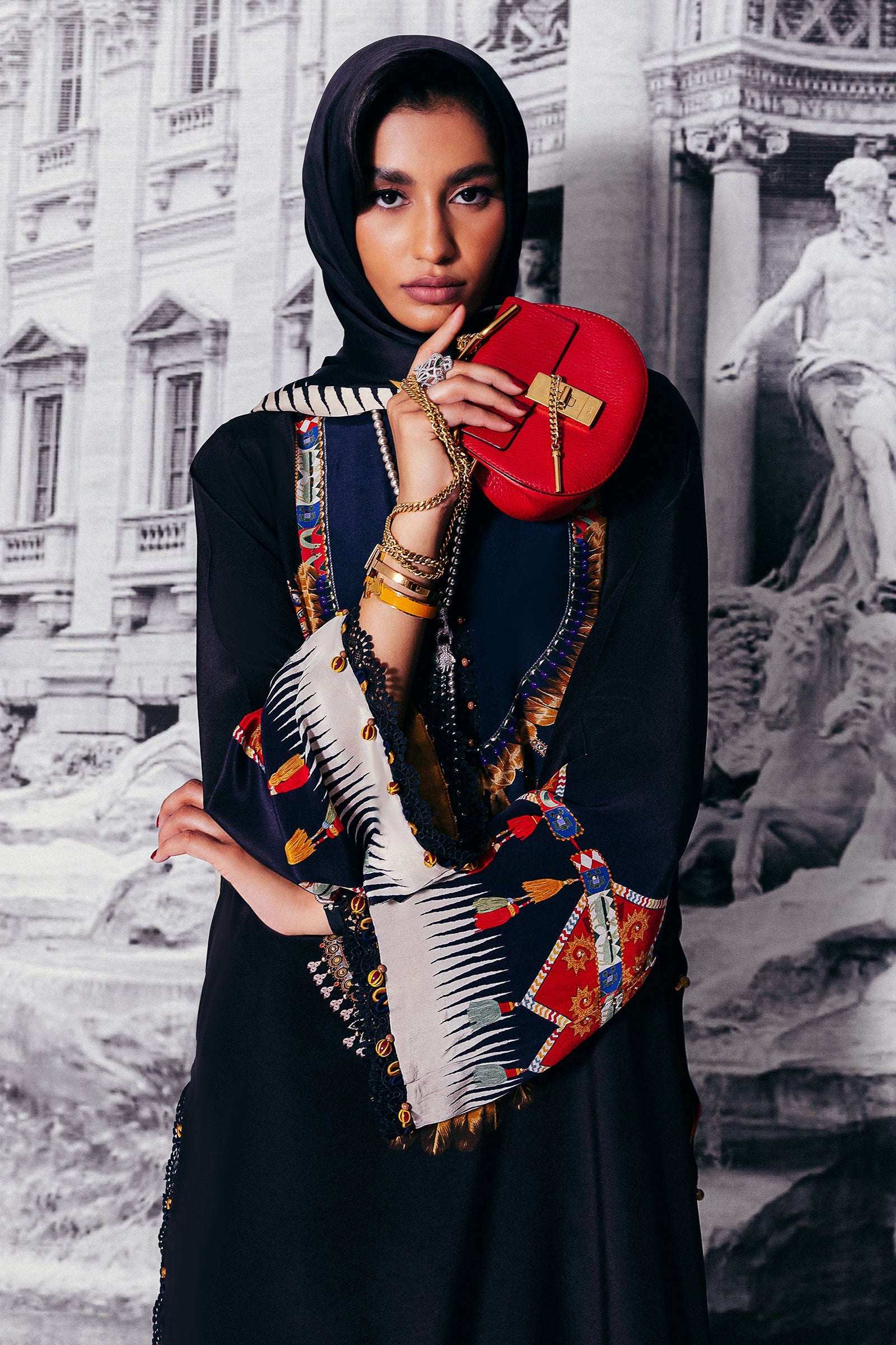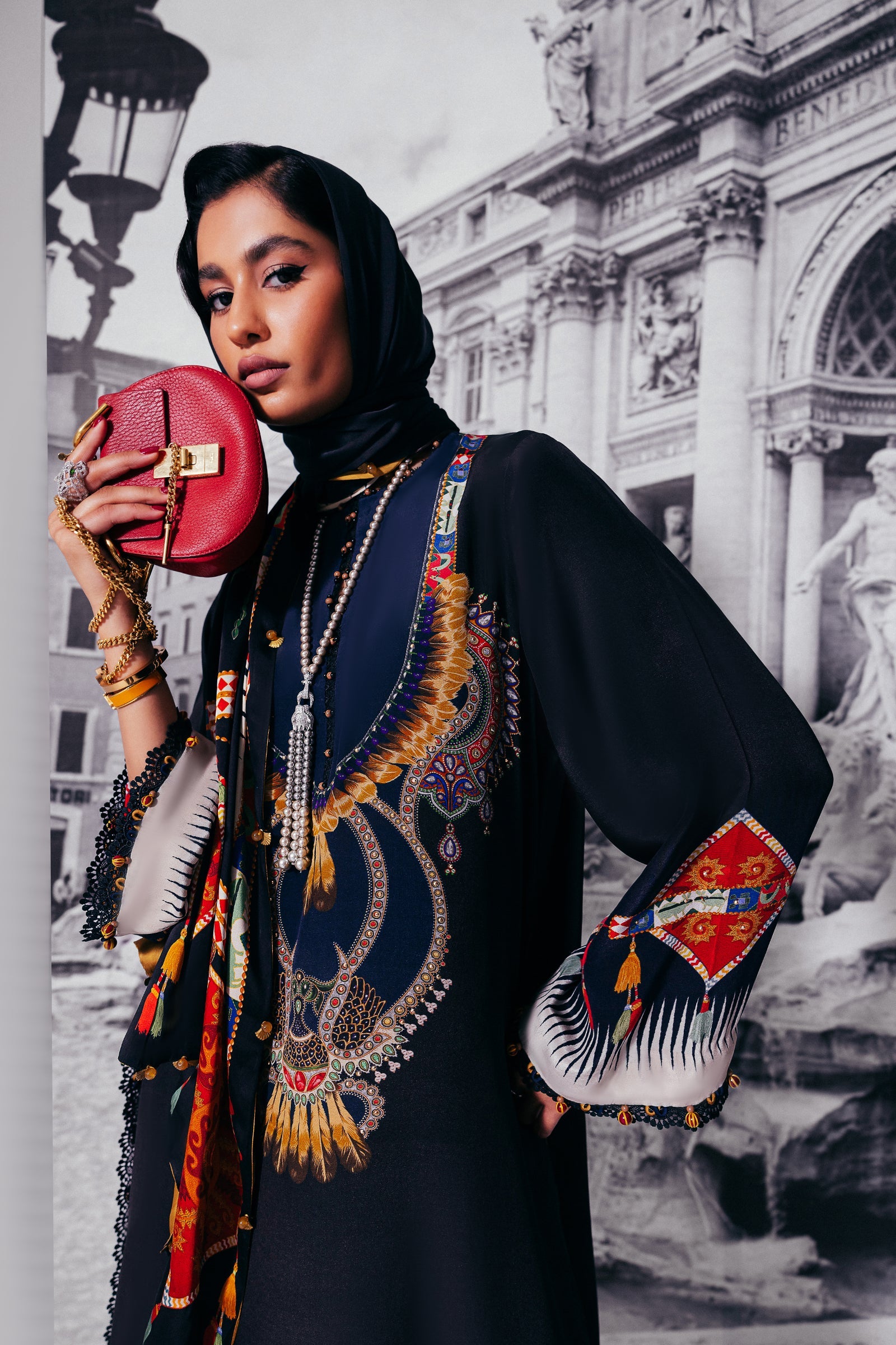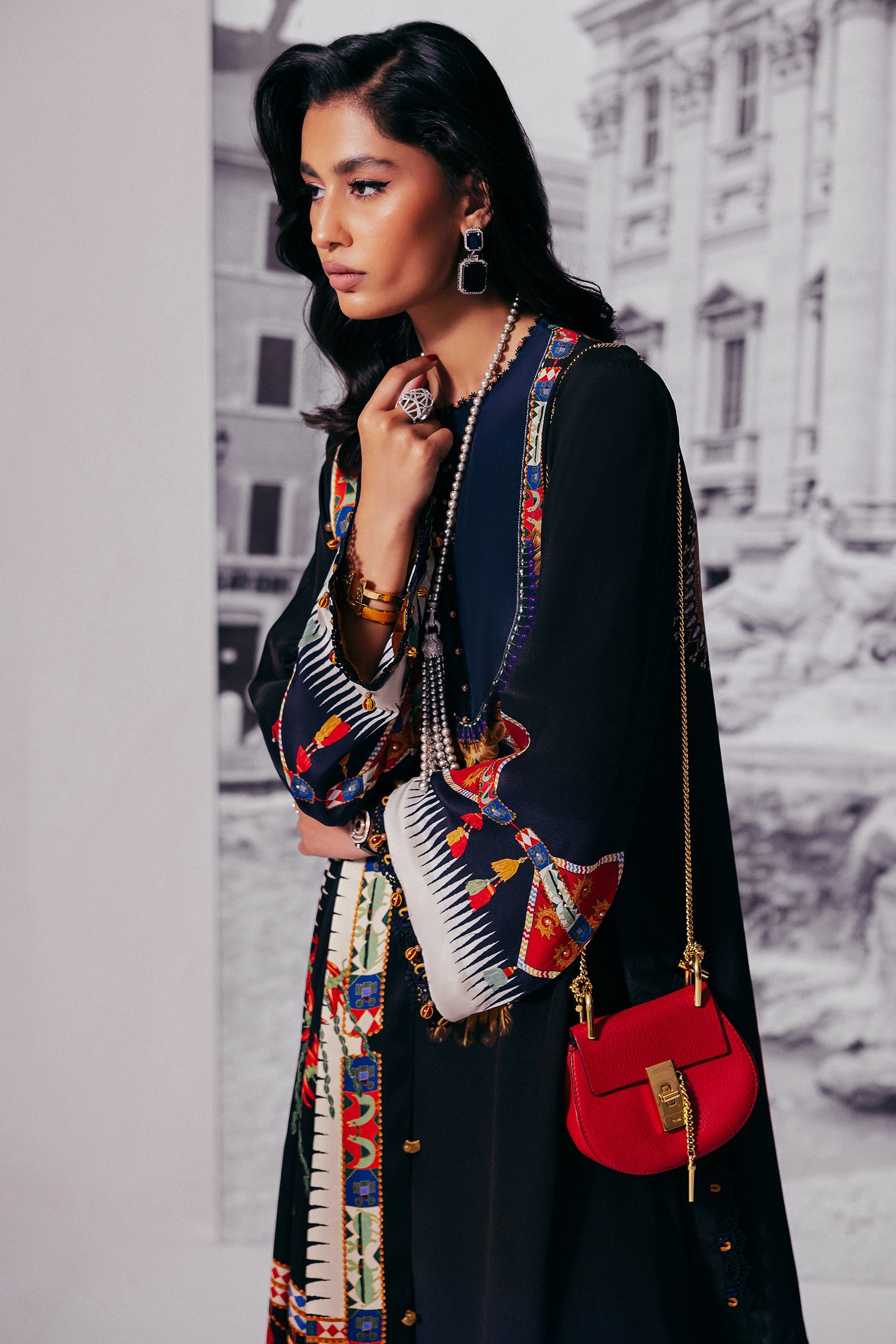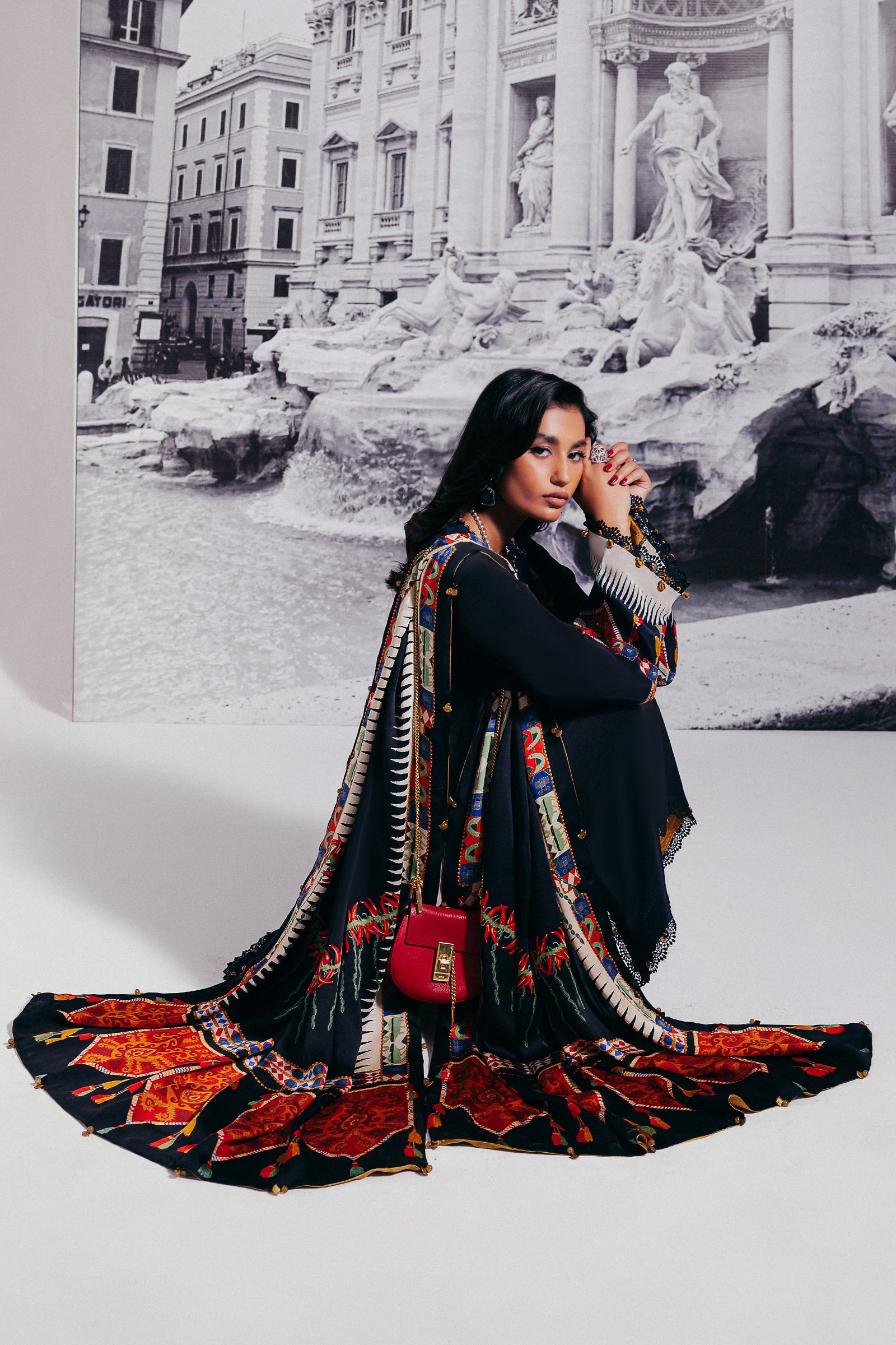Introducing ‘Éliane’: A symphony of sophistication and grandeur, this masterpiece is enveloped in opulent midnight blue, adorned with a mesmerizing blend of wild florals and tessellated patterns in rich scarlet red, pristine ivory, and golden honey. Infused with an Egyptian essence, the design is elevated by a vibrant dupatta showcasing a luxurious spice composition. Delicate obsidian lace details further enhance the ensemble, creating a look of unparalleled elegance. Perfect for upscale al fresco affairs and glamorous soirées.