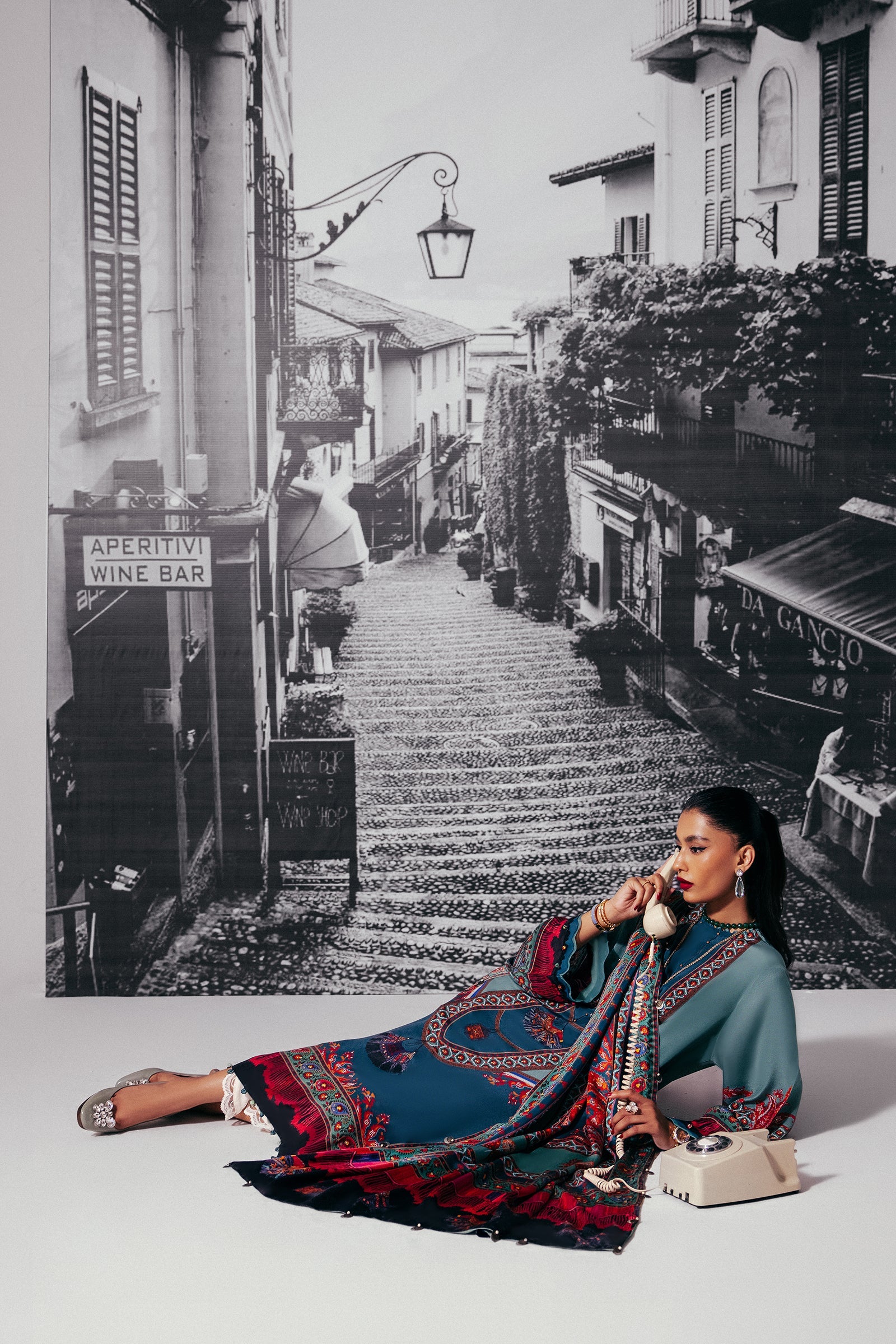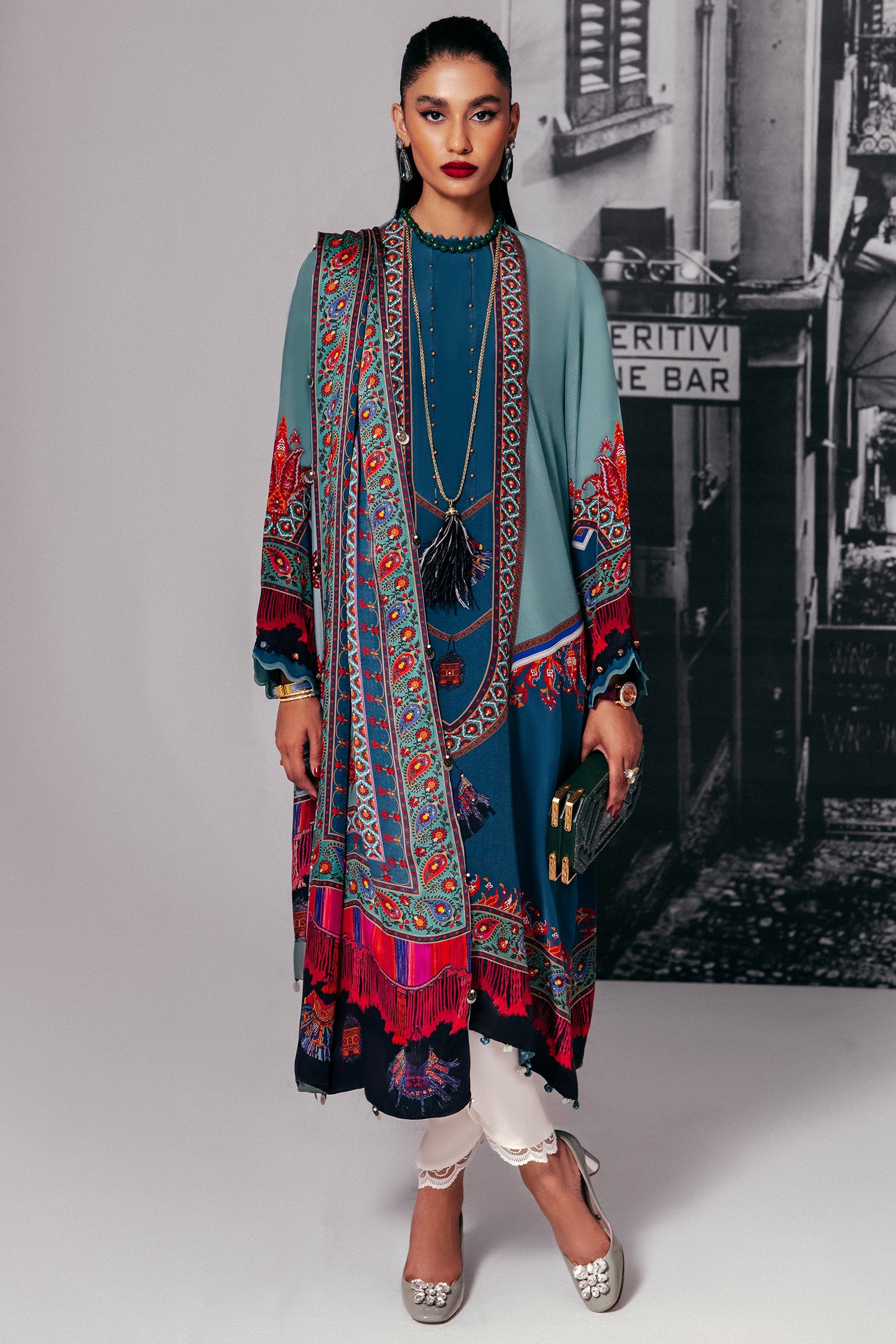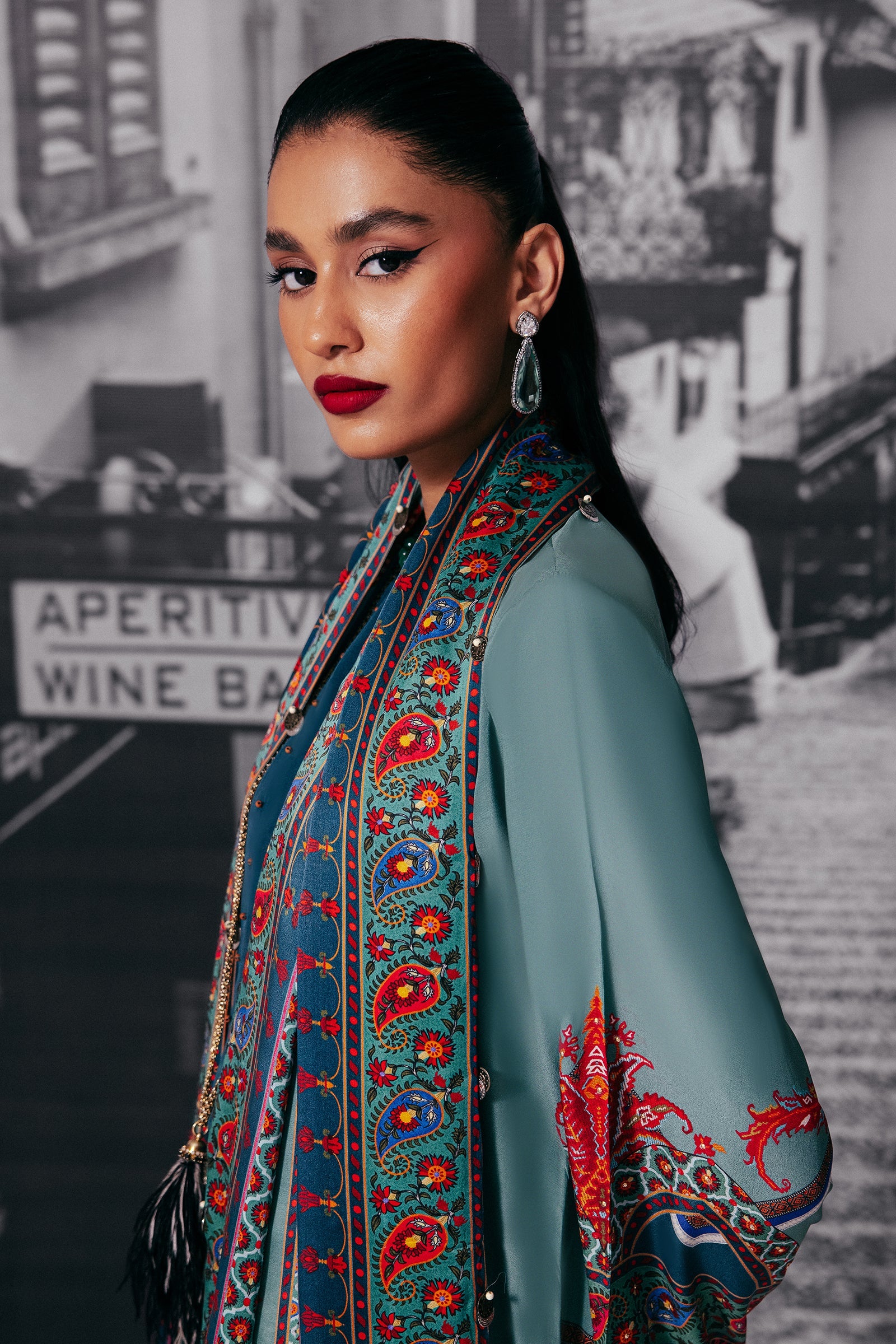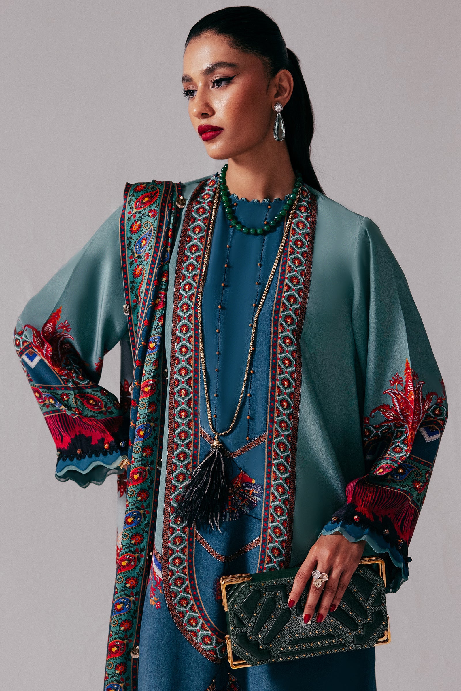 Introducing 'Helene,' a masterpiece of luxury and elegance. Crafted from the finest pure silk in a deep teal hue, this exquisite piece features a chic and boxy silhouette that embodies sophistication. Adorned with ornamental patterns in opulent shades of cerulean, scarlet, and crimson, enhanced by an ebony hem.