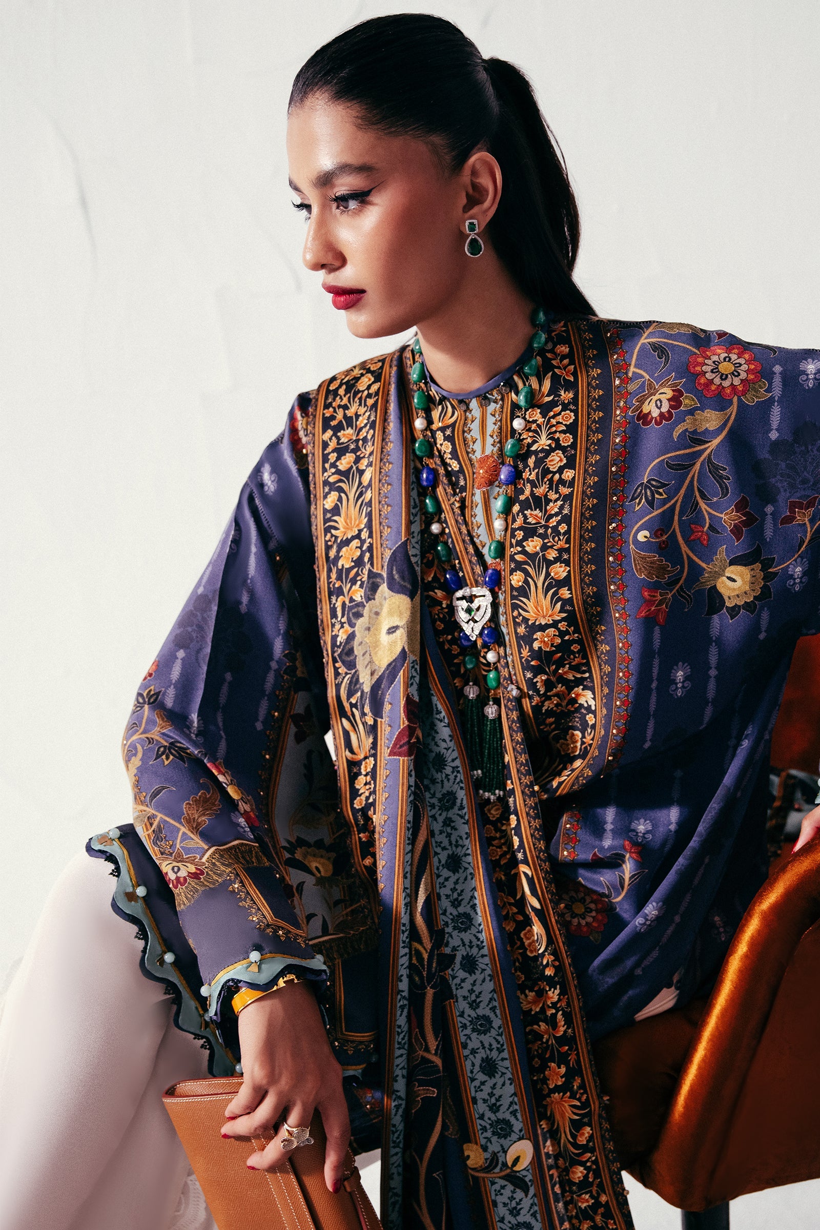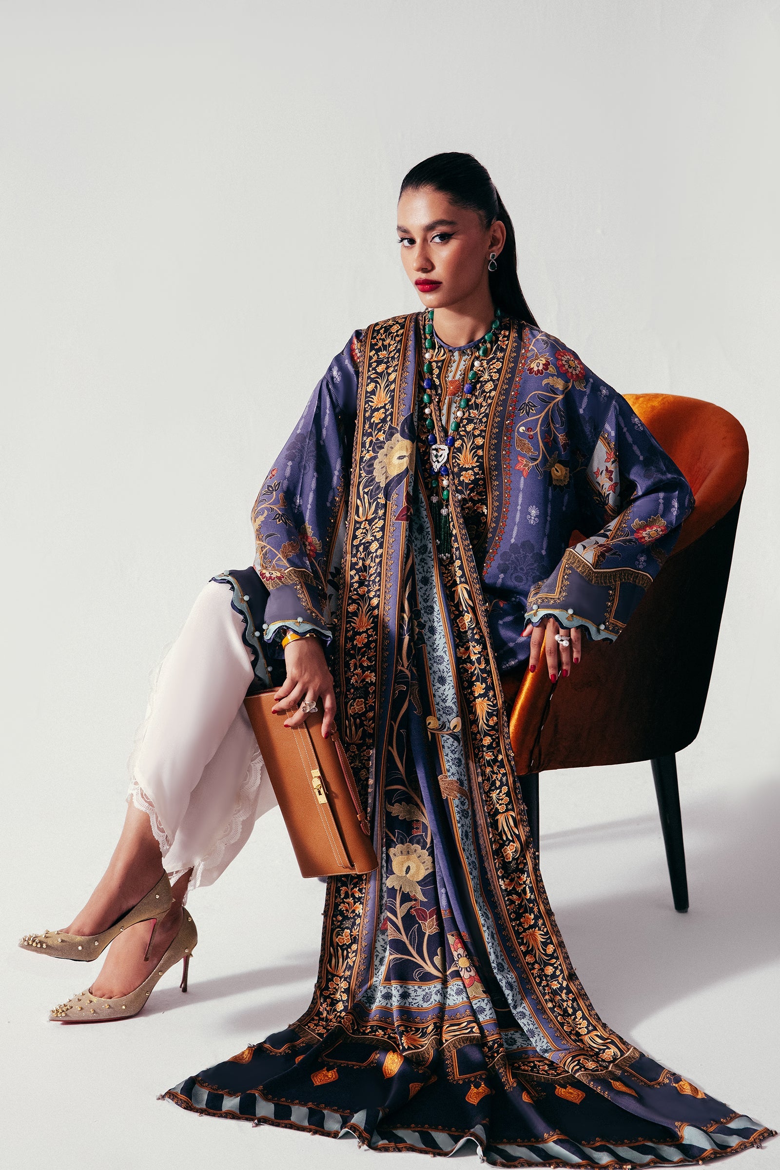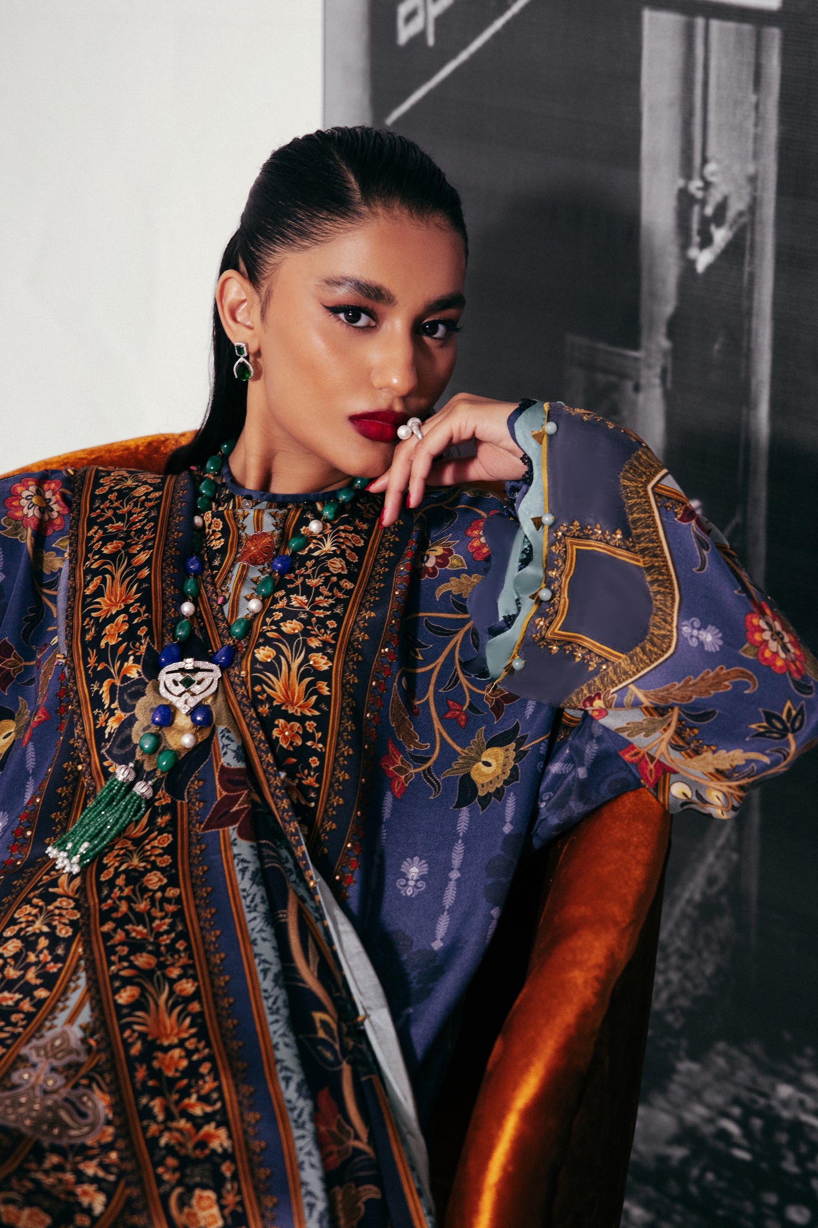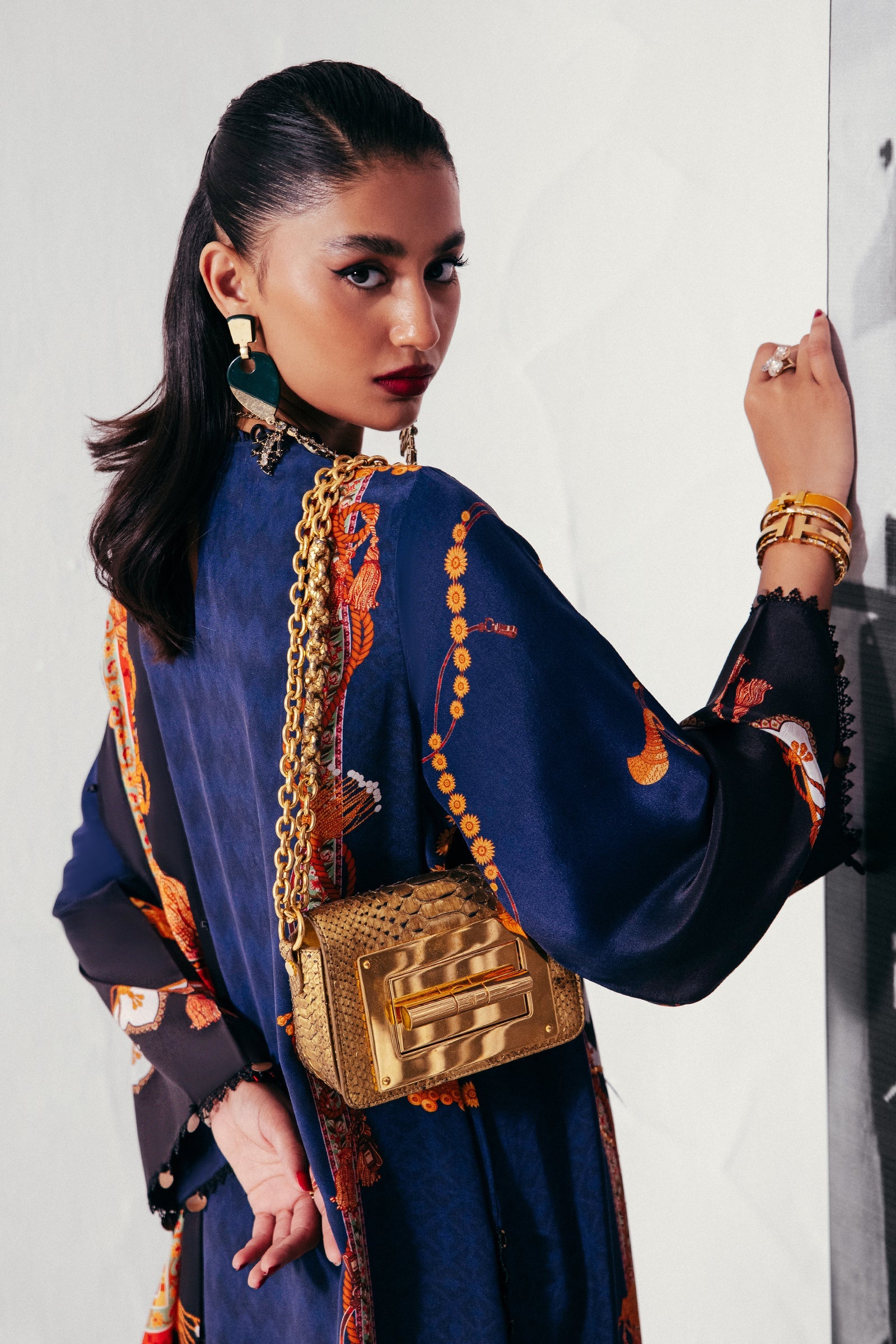 An opulent explosion of color and pattern, 'Noemie' is rendered in resplendent shades of crimson, juniper, and ebony, accented with touches of gold. This vibrant creation blends ornamental prints with geometric elements in a harmonious yet striking composition. Adorned with delicate lace insets and scalloped borders, this sumptuous silk ensemble transforms every soirée into a grand affair.
