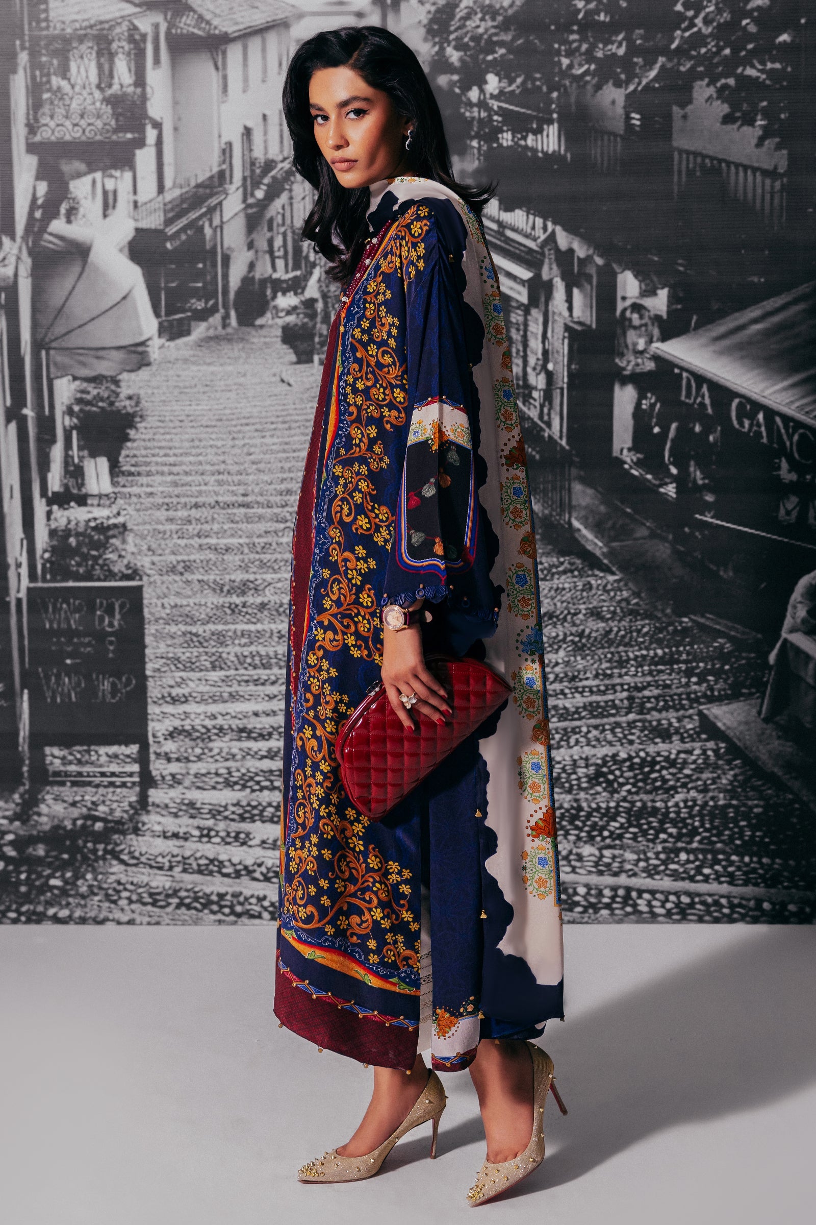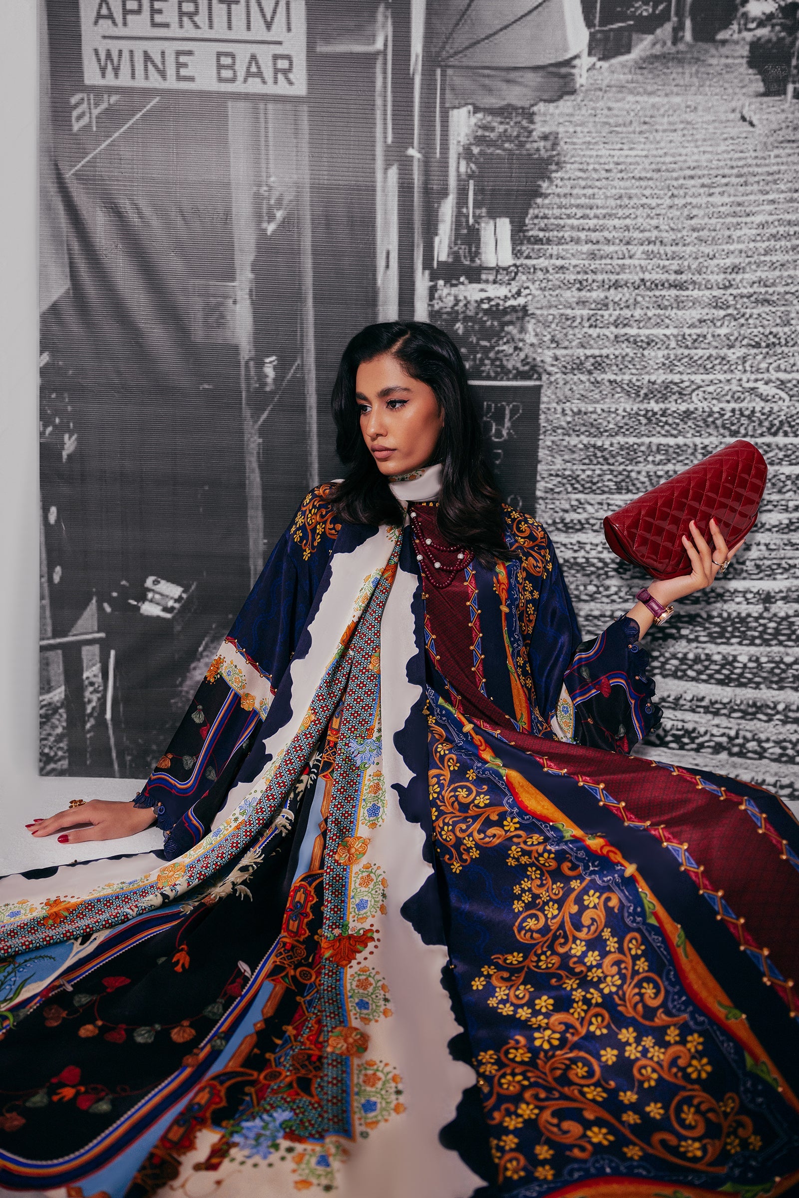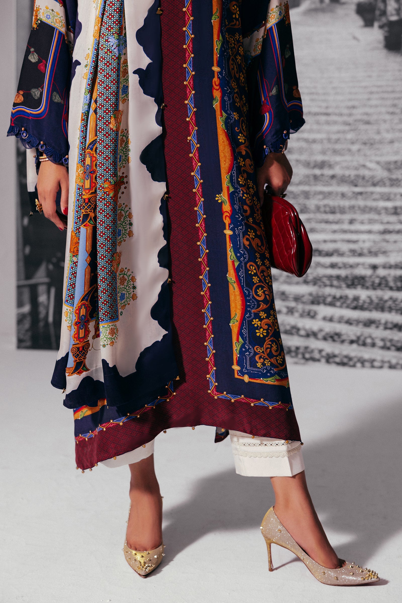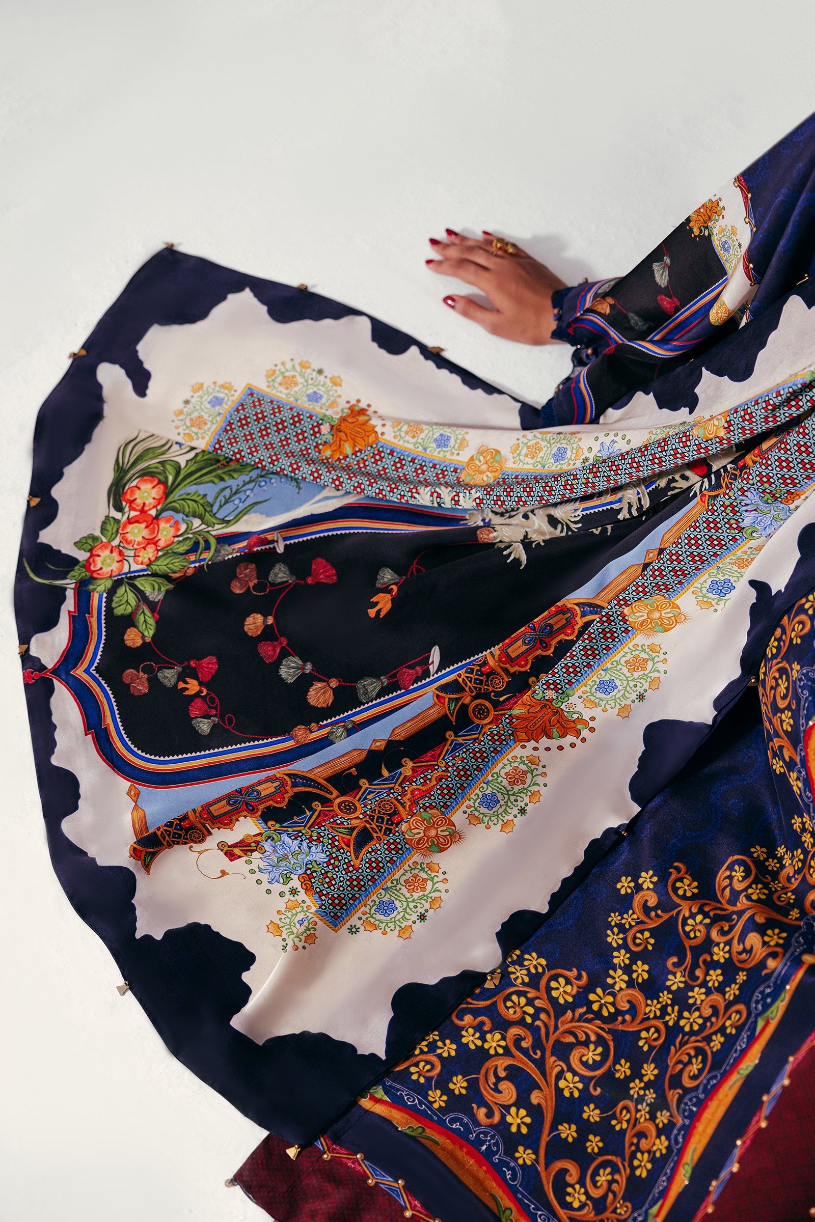 Behold 'Étoile': a testament to exquisite artistry and refined taste. This exceptional shirt is crafted from opulent obsidian silk, showcasing meticulous color blocking in shades of indigo, deep red, and ivory. The intricate pattern, reminiscent of golden honey and pumpkin, adds a rich, ornamental touch. Paired with an artfully designed dupatta, this ensemble is the epitome of luxury and sophistication, This is a perfectly apt look for a woman who wants to make all heads turn!