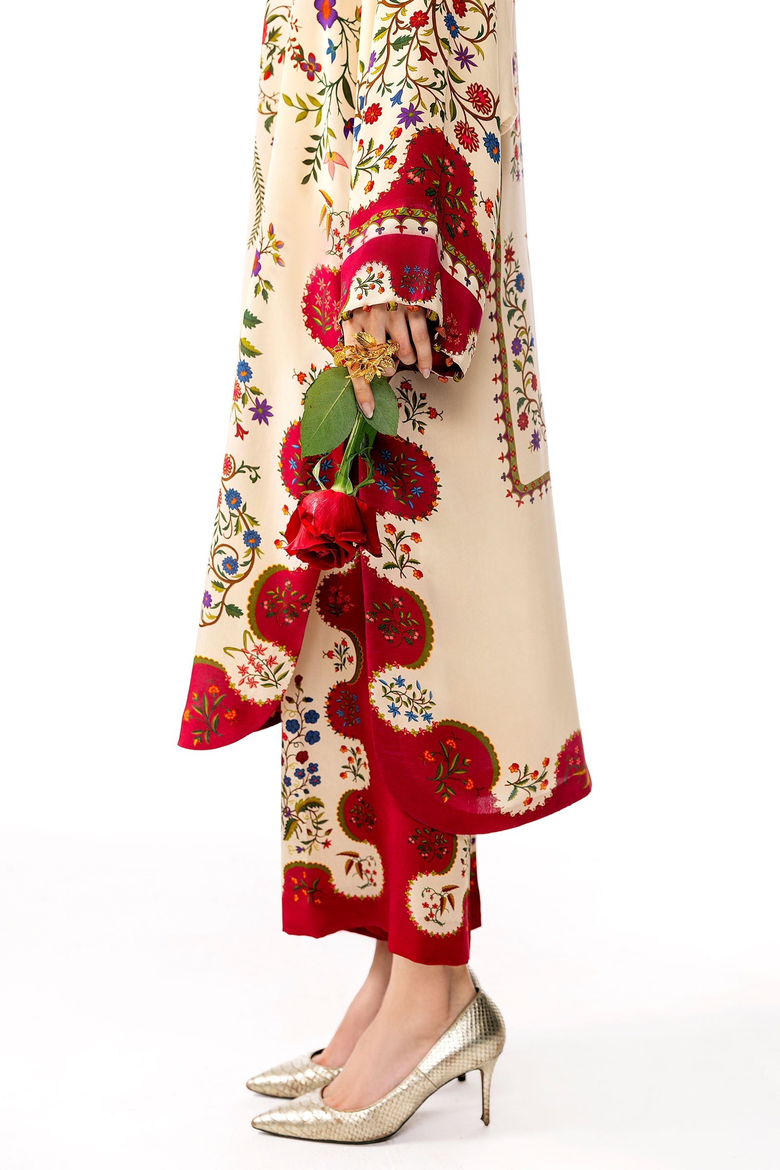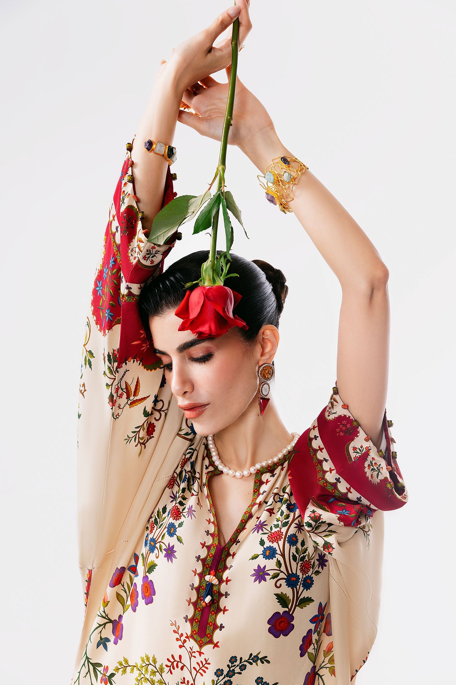 Gracefully imagined for sun-drenched summer brunches, Évolet is a silk tunic that captures the essence of effortless sophistication and poetic charm. Rendered on an airy cream-beige canvas, its delicate rosewood motifs unfurl like soft florals at dawn — serene, refined, and impossibly elegant.