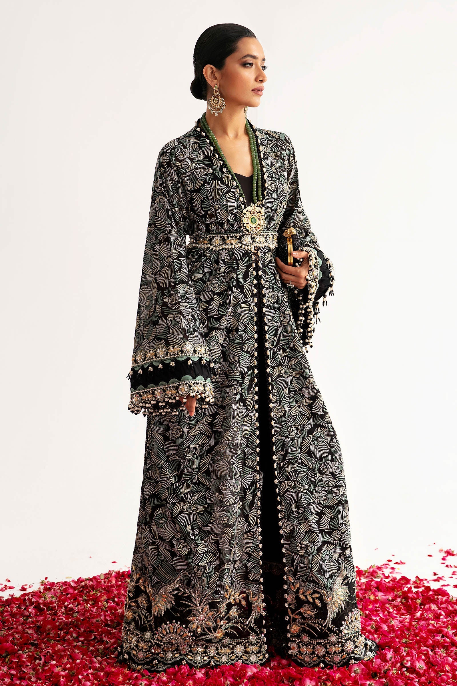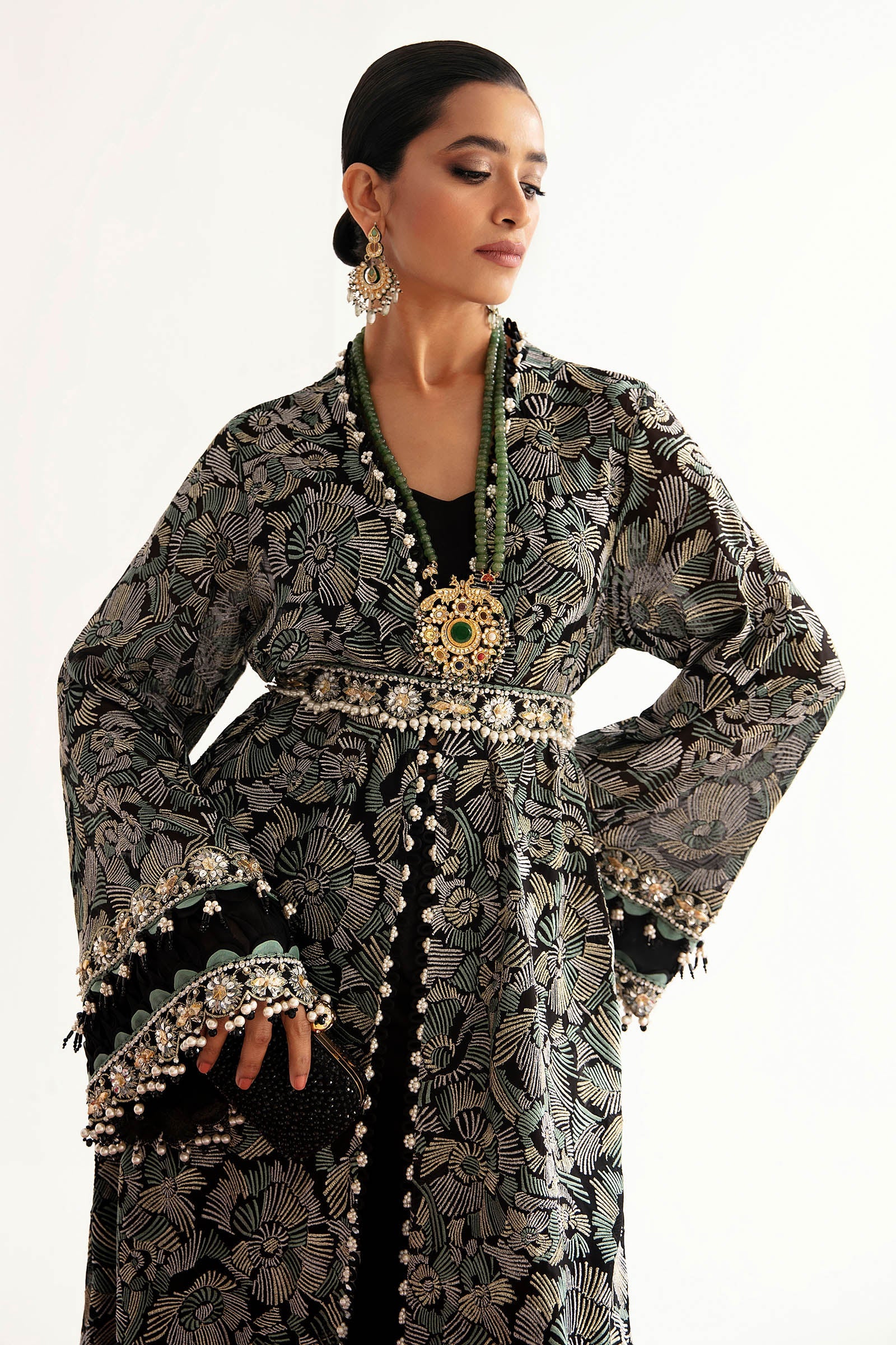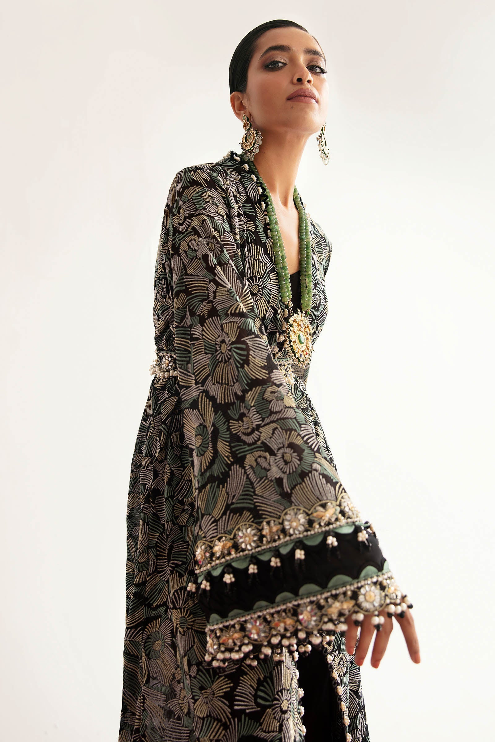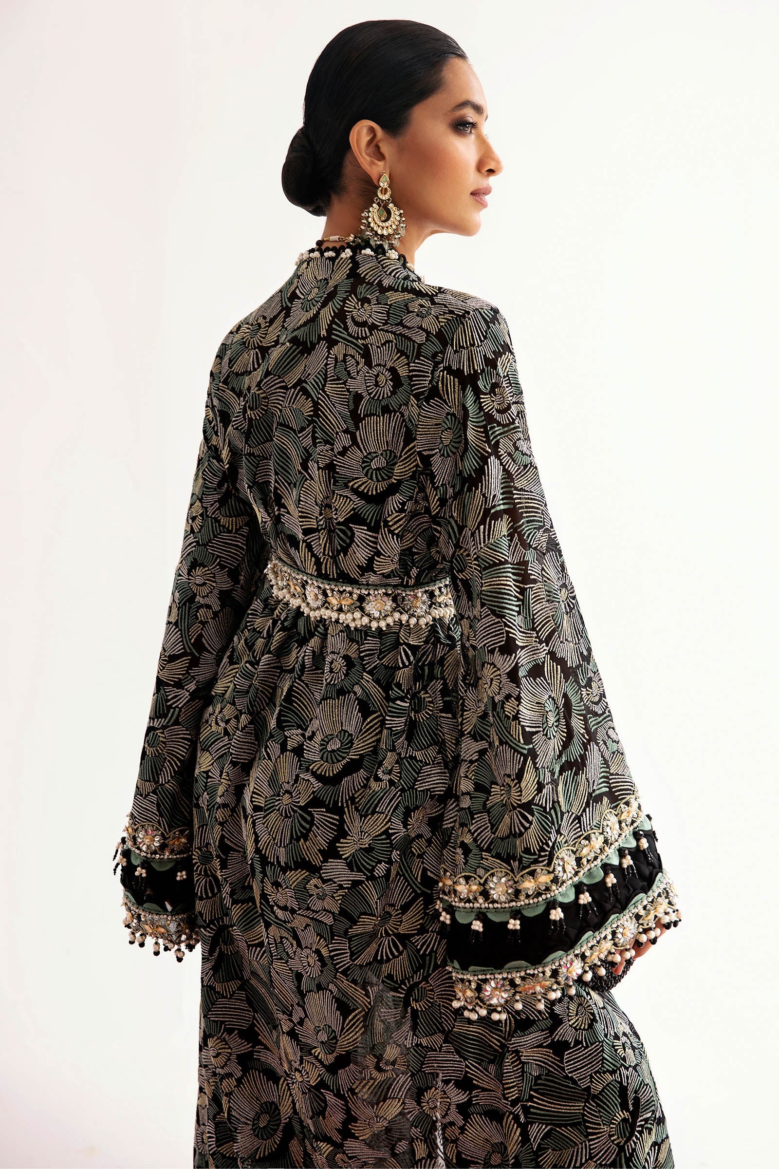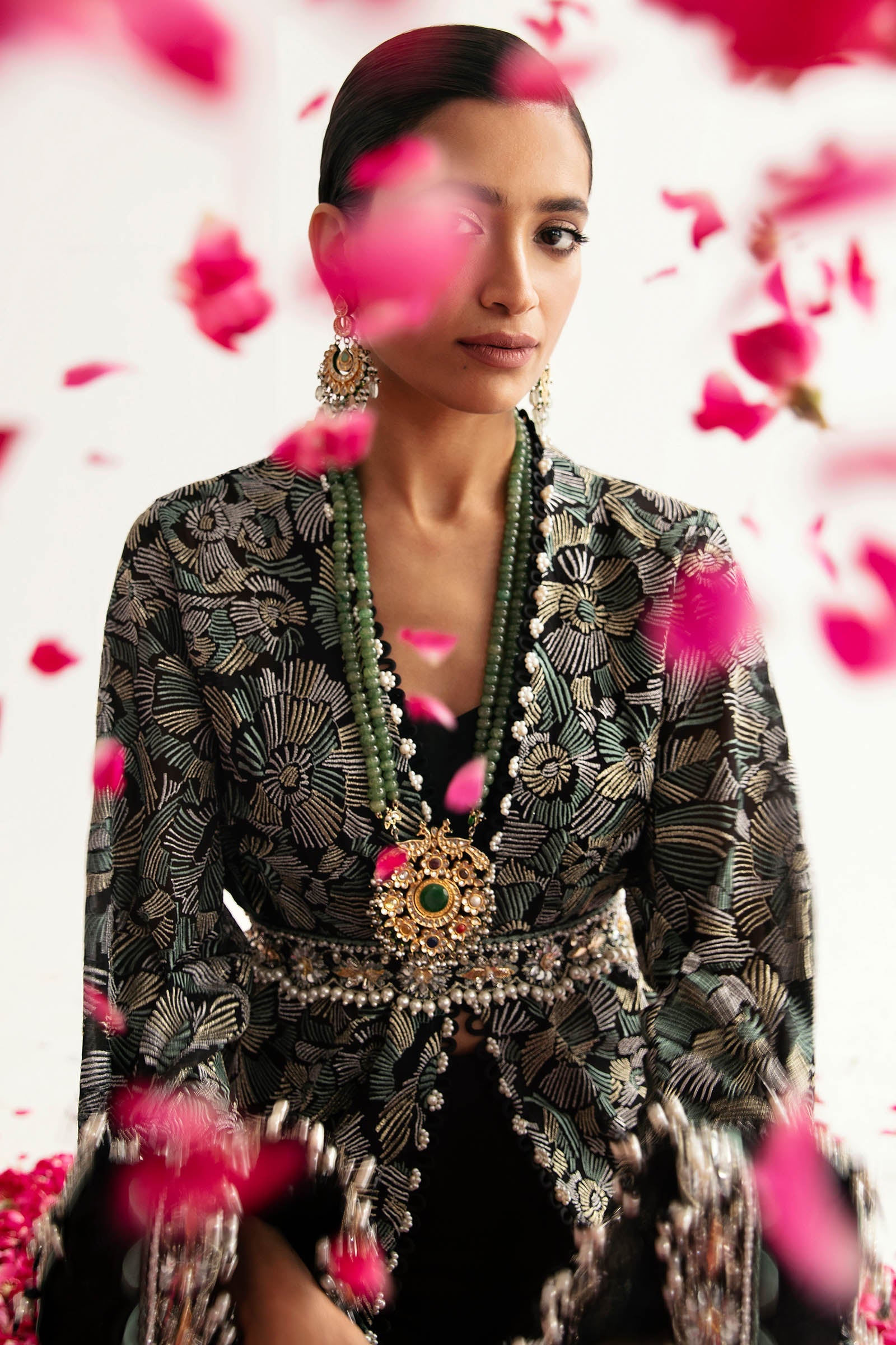 Witness the breathtaking artistry as a mesmerizing composition emerges on a sooty charcoal canvas, intricately etched with finesse and meticulous detail. Bathed in tawny brown and caramel hues, 'Fleur Noir' captivates with a touch of opulence, adorned by glistening gold tinsel threads. Prepare to make a statement at every formal and festive occasion with this extraordinary masterpiece.