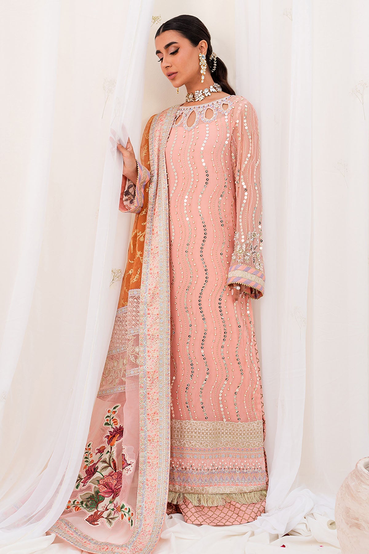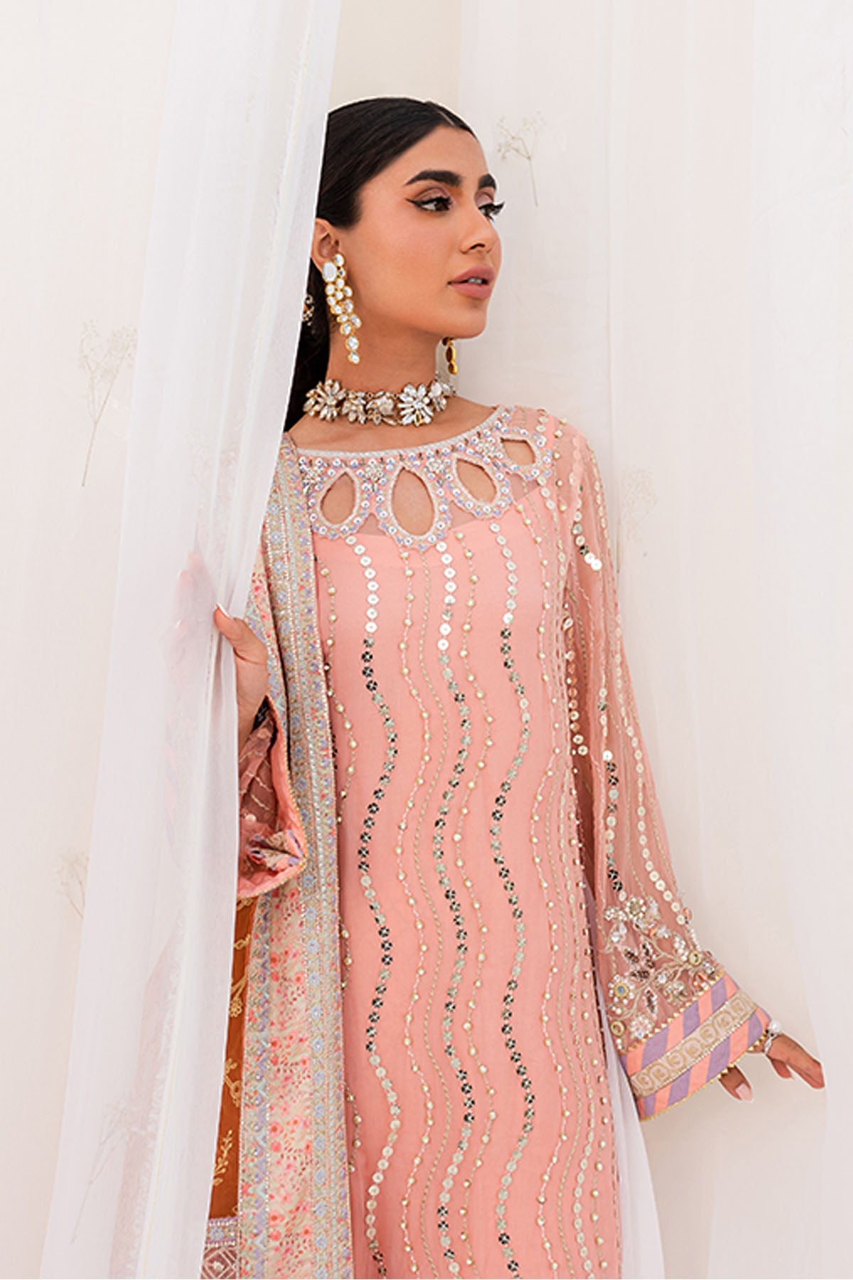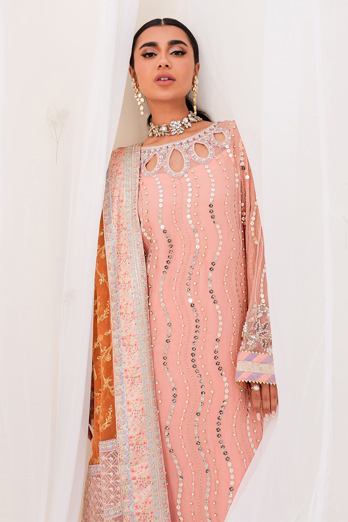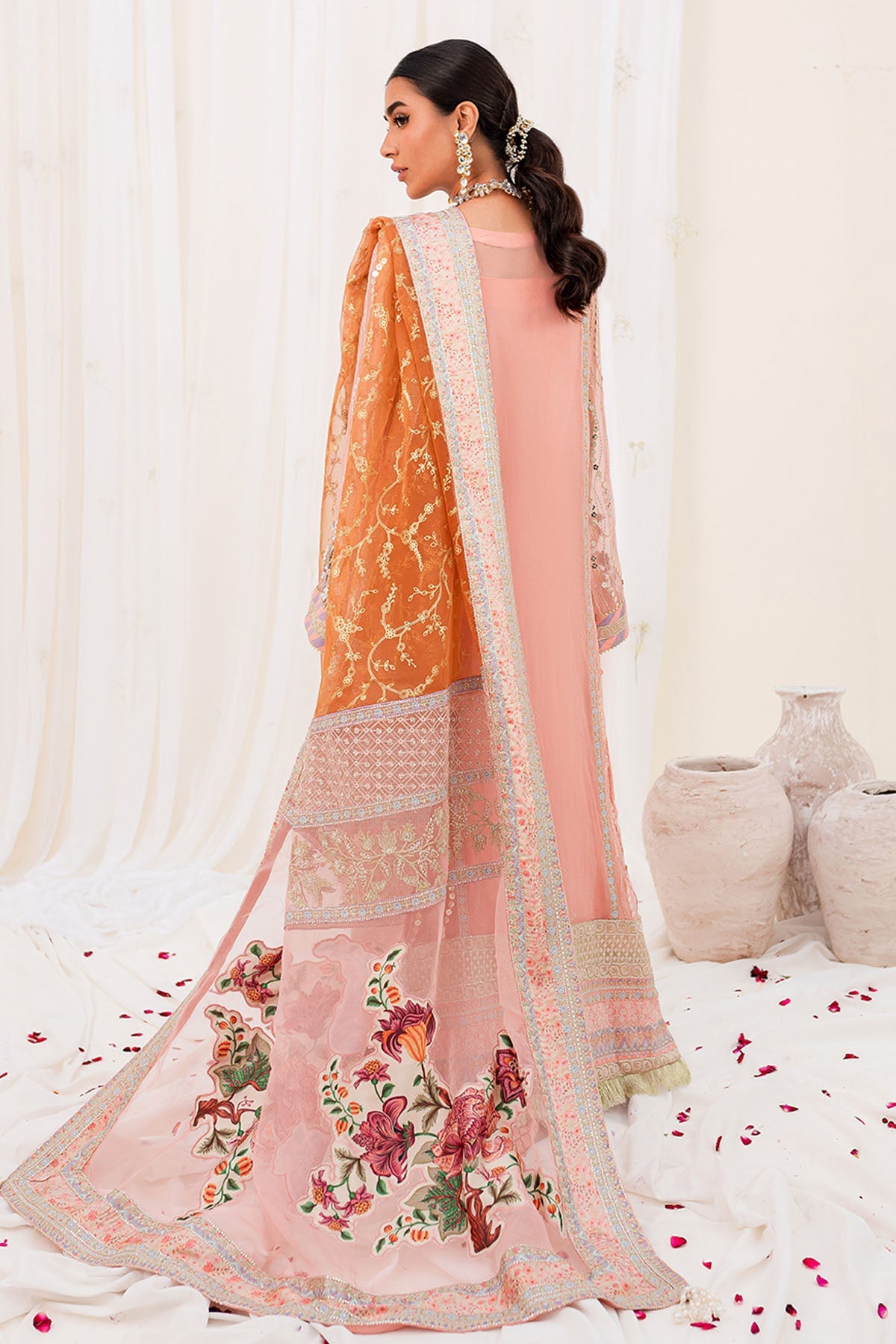 - 4 Piece Ready-To-Wear Embroidered & Hand-Embellished Chiffon Shirt With Inner Lining And Screen Printed Raw Silk Trouser Paired With Embroidered Foil Printed Organza Dupatta & Printed Patch Work.