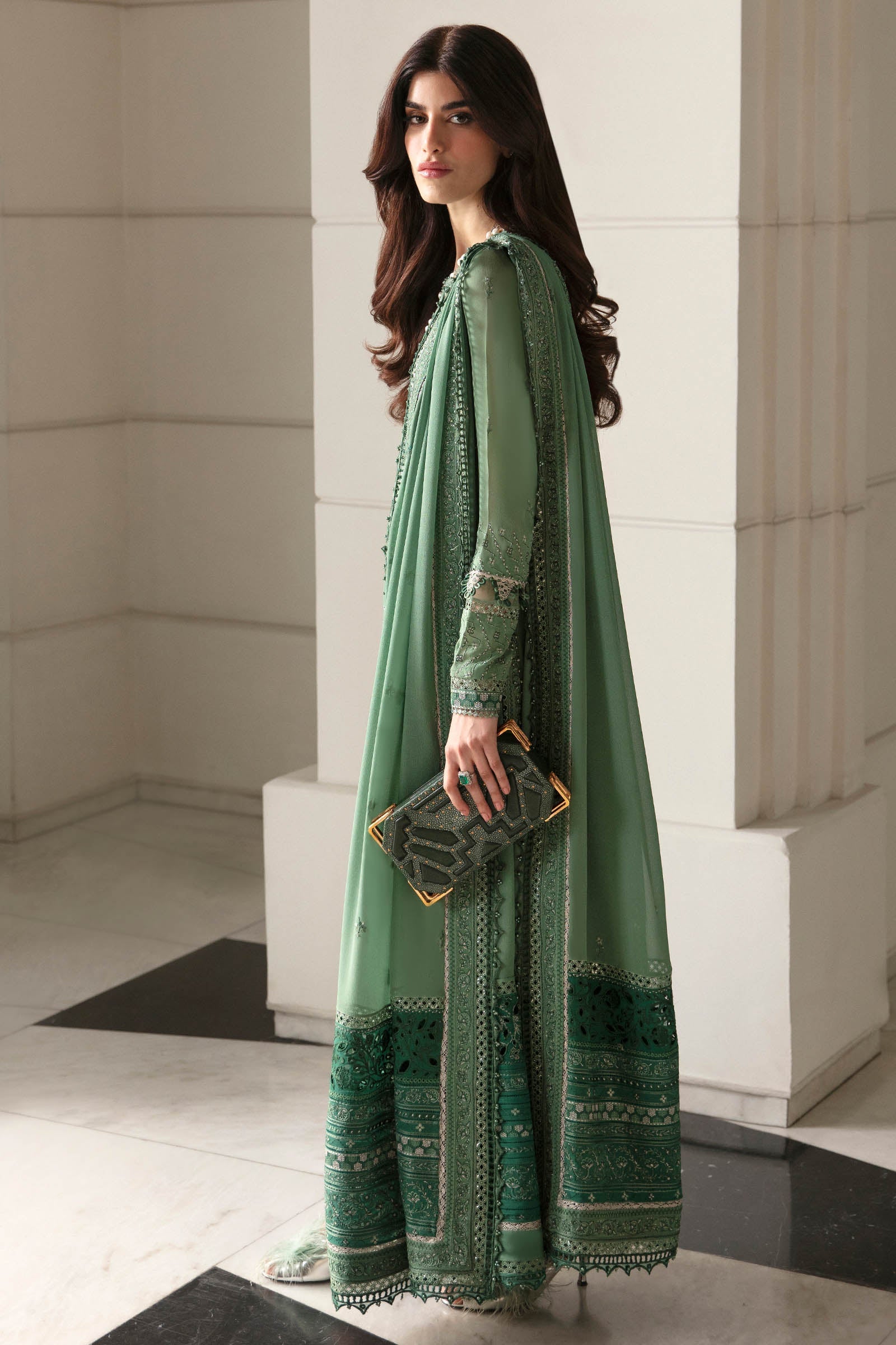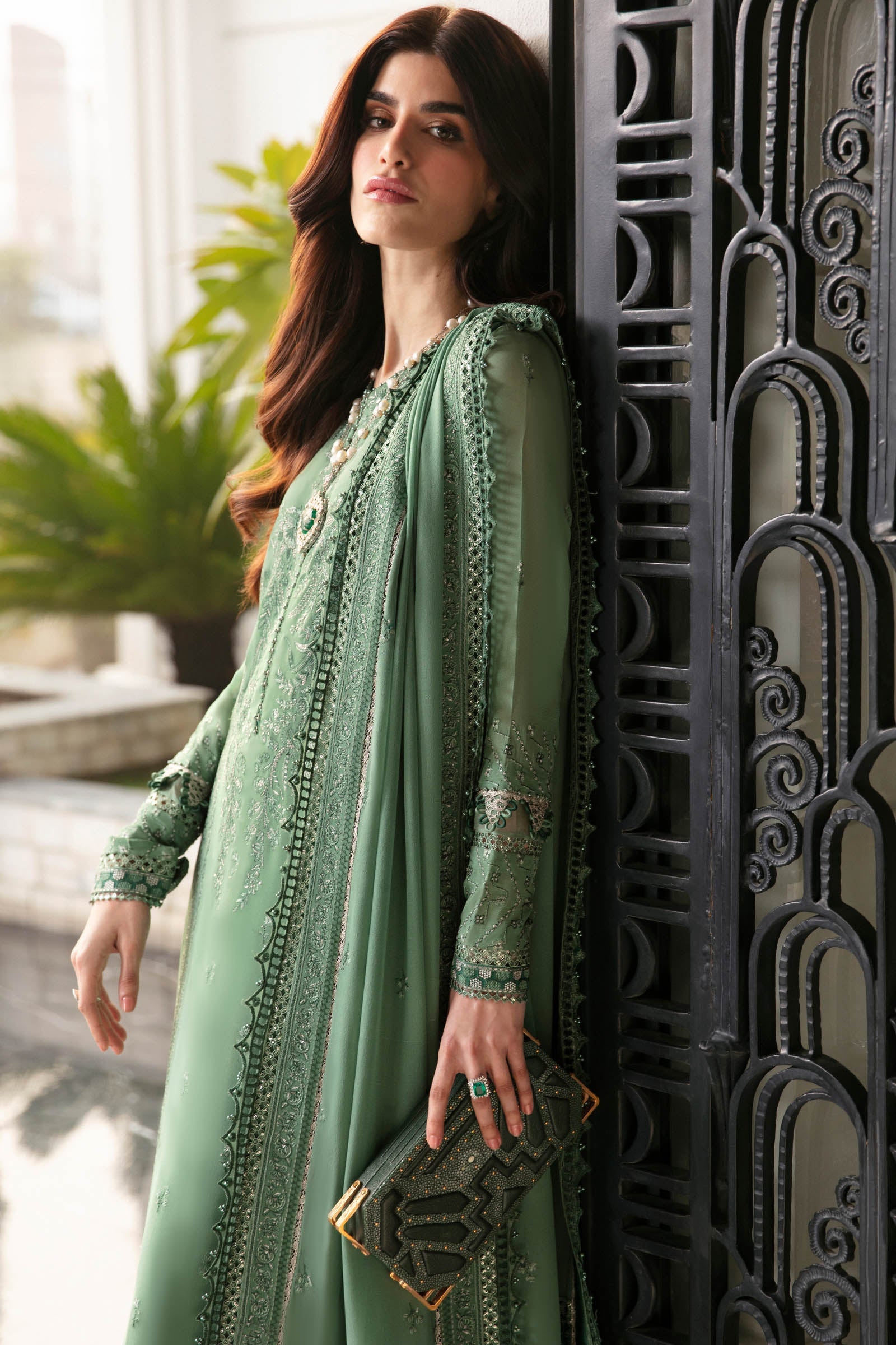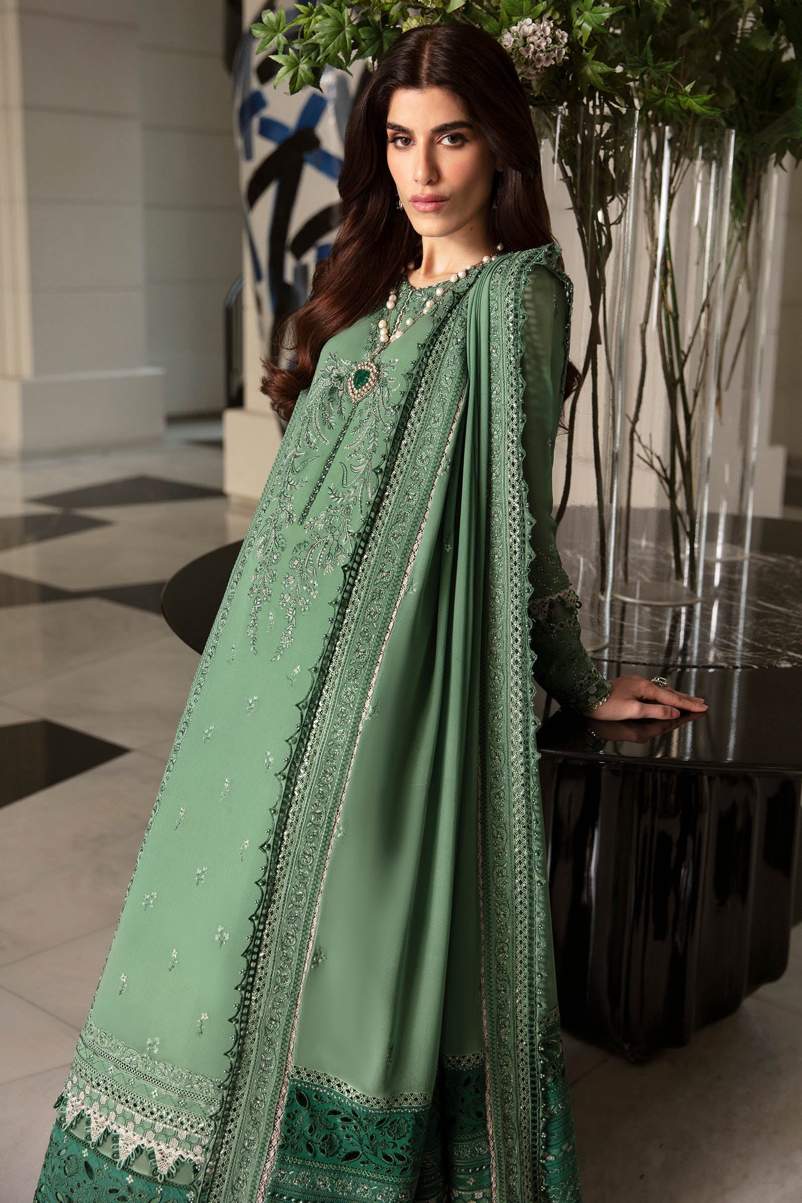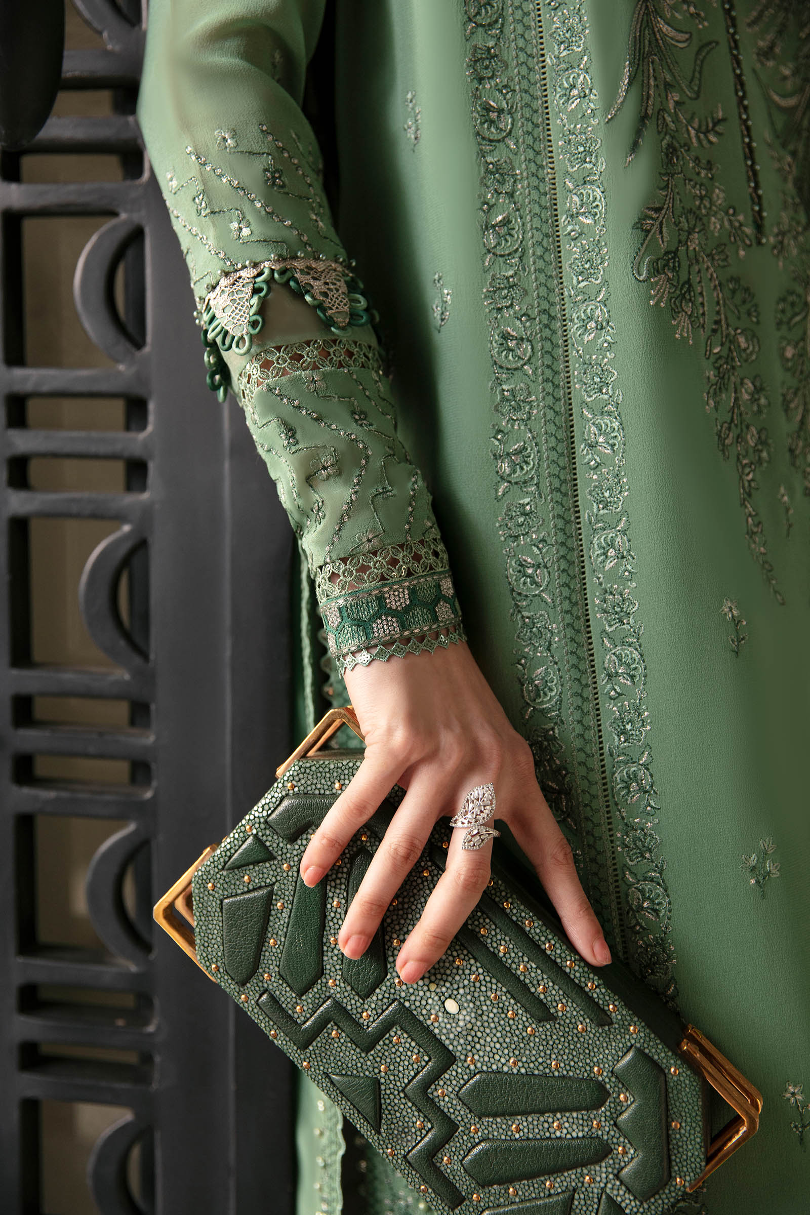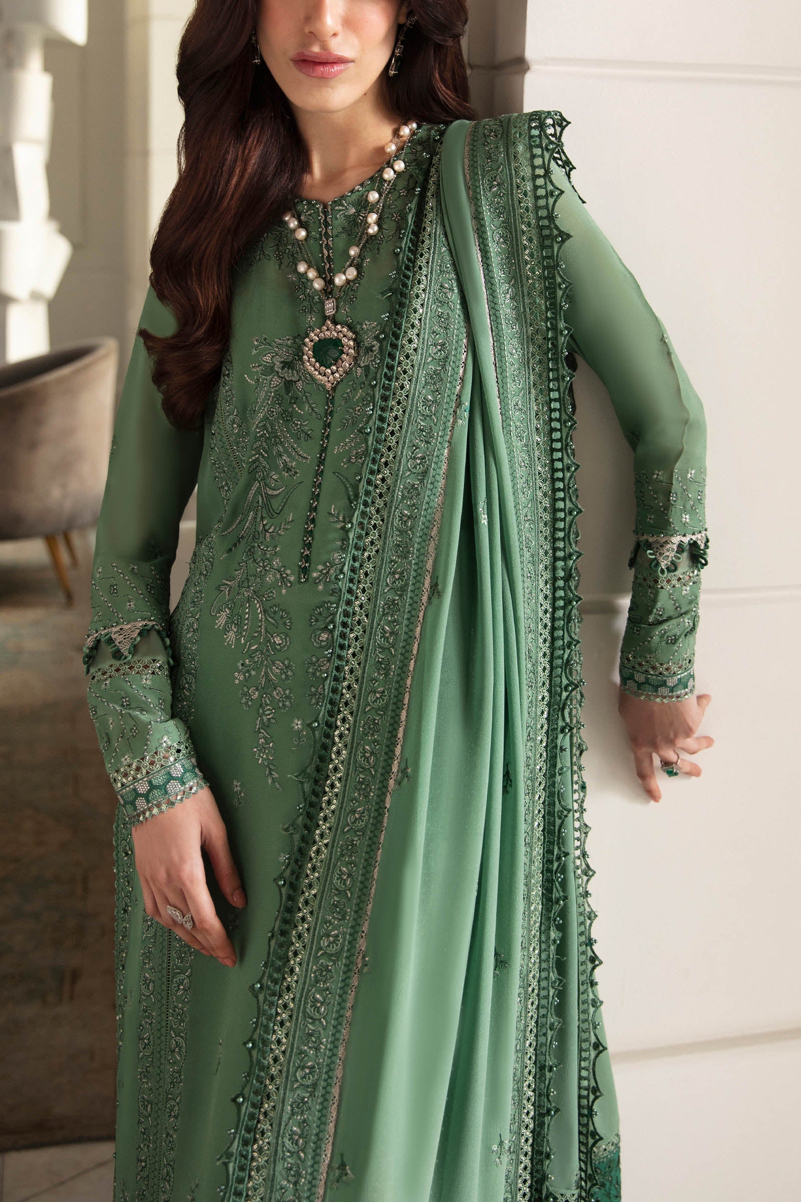 An epitome of timeless sophistication, 'Frais Sage' unveils a classically elegant aesthetic, showcasing a distinctive color palette. Intricate monochrome floral embroideries grace a canvas of soft, romantic sage green. Complemented by a resplendent embroidered dupatta and straight trousers adorned with lace detailing on the cuffs, this refined ensemble seamlessly transitions from the diurnal grace to the nocturnal allure, ensuring a sartorial journey that transcends the confines of day and night.