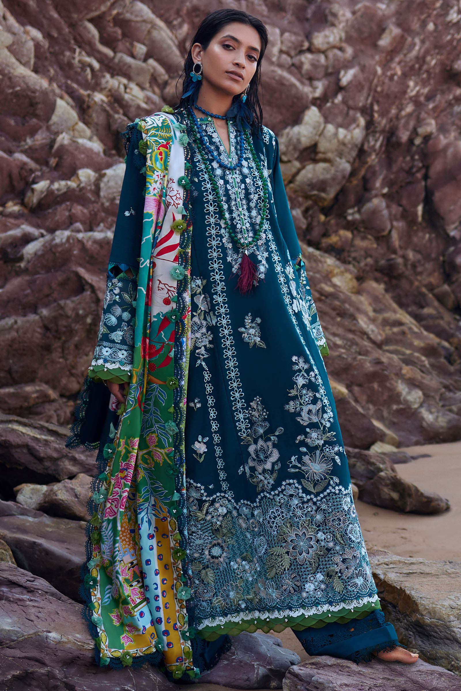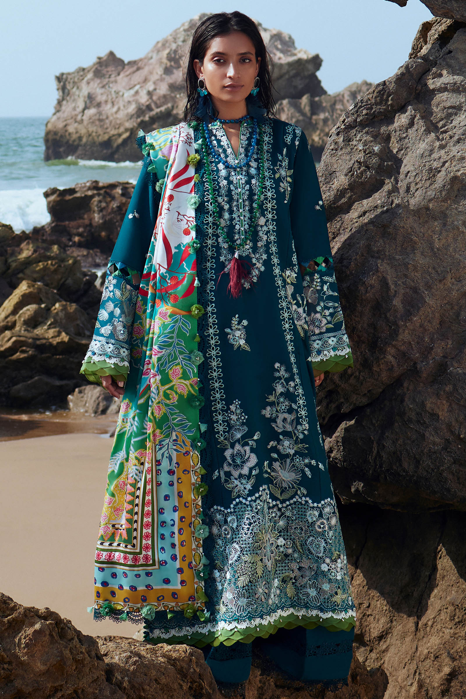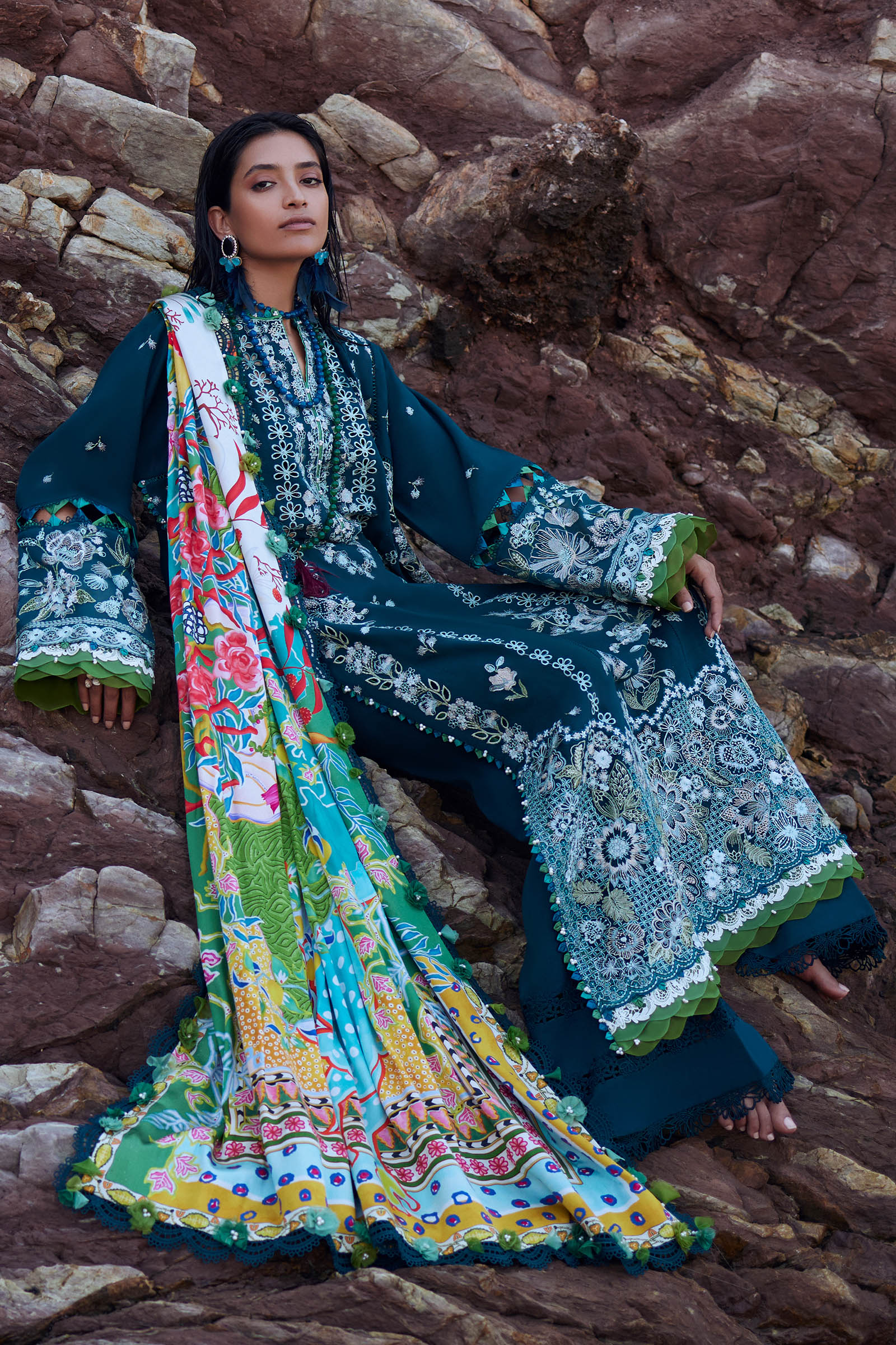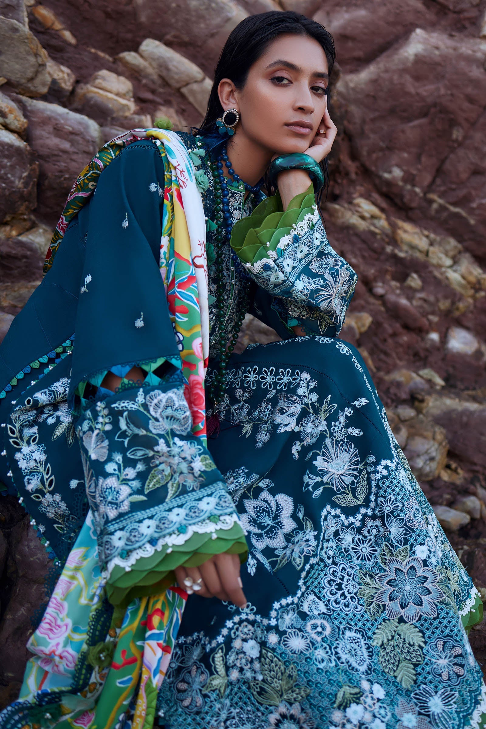 Behold the mesmerizing allure of 'Freya,' where an obsidian canvas weaves a midnight symphony. Delicate threads dance in shades of sage, cerulean, stone, and moss, crafting an intricate tale of opulence. Borders adorned with fine embroideries cascade, creating an absolute spectacle of luxury. Accompanied by a pure medium silk dupatta, this ensemble unveils a vivid panorama of scarlet, azure, yellow, and green. 'Freya' epitomizes sophistication, embracing a design sensibility that transcends time.
