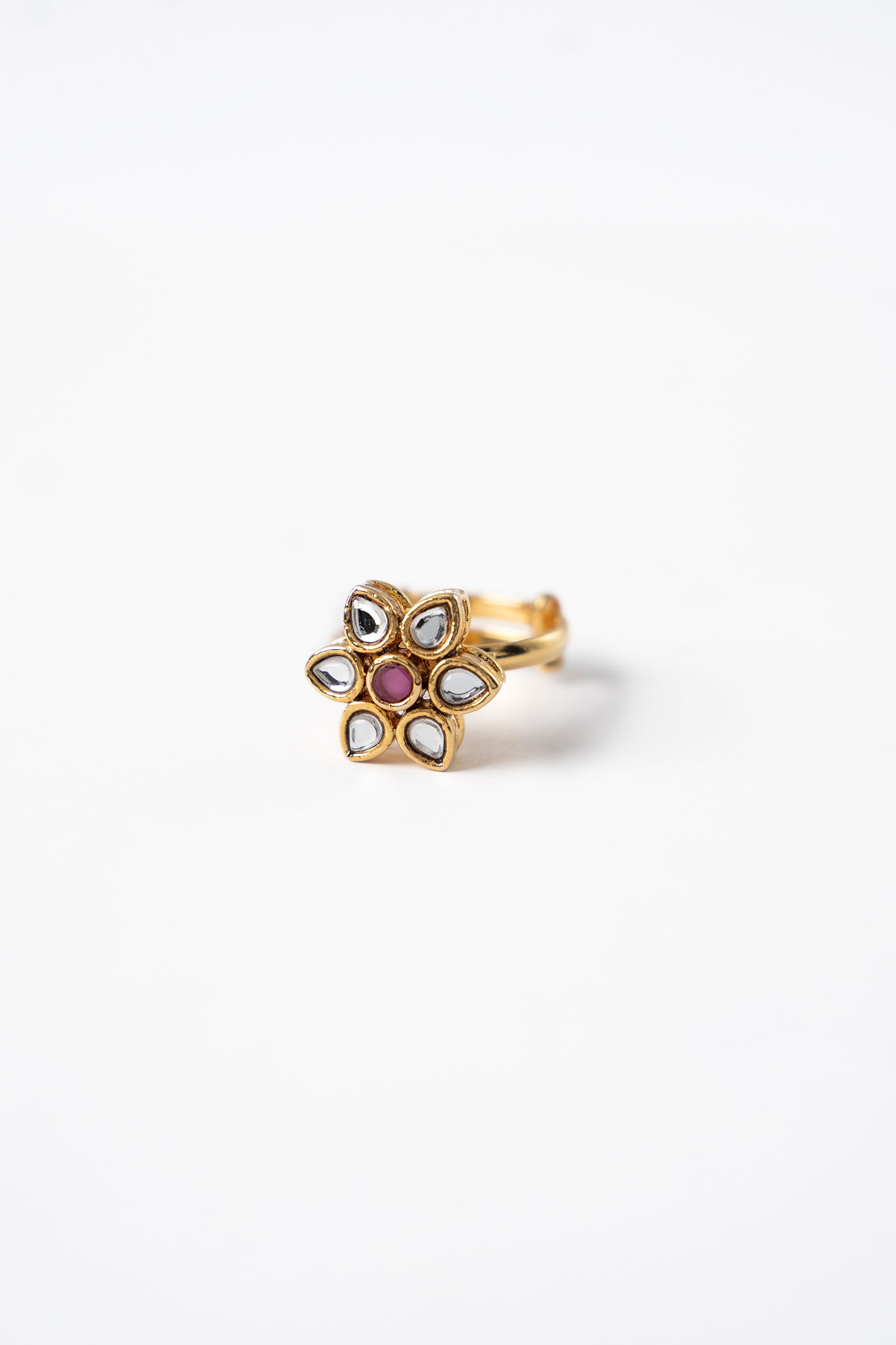 Adorn our traditional Gehna Bridal Set, featuring handcut glass stone artisanship finished with glistening pink chatham and white zircons. The set includes a majestic necklace, a pair of earrings, and a ring that make your big day special.