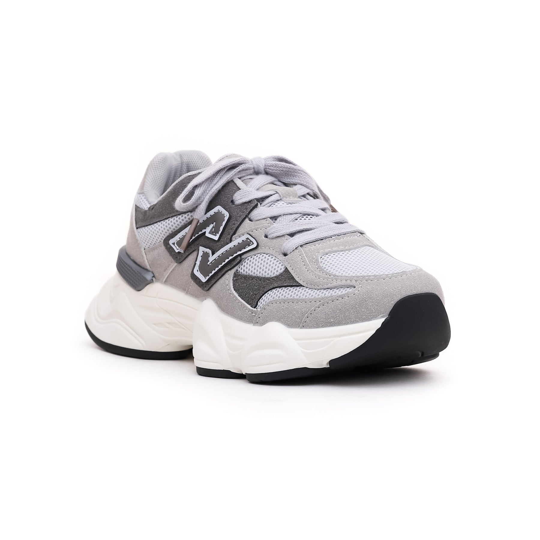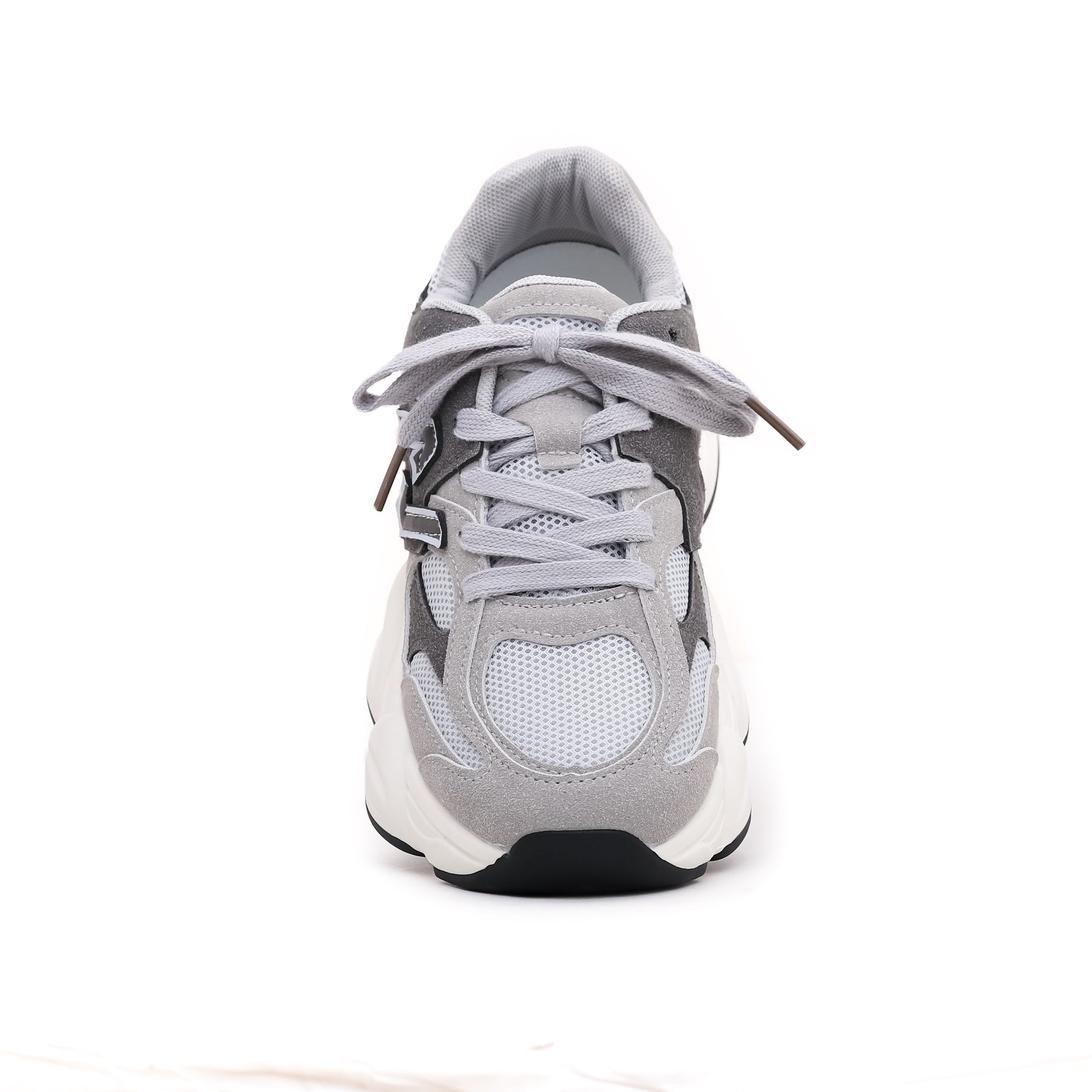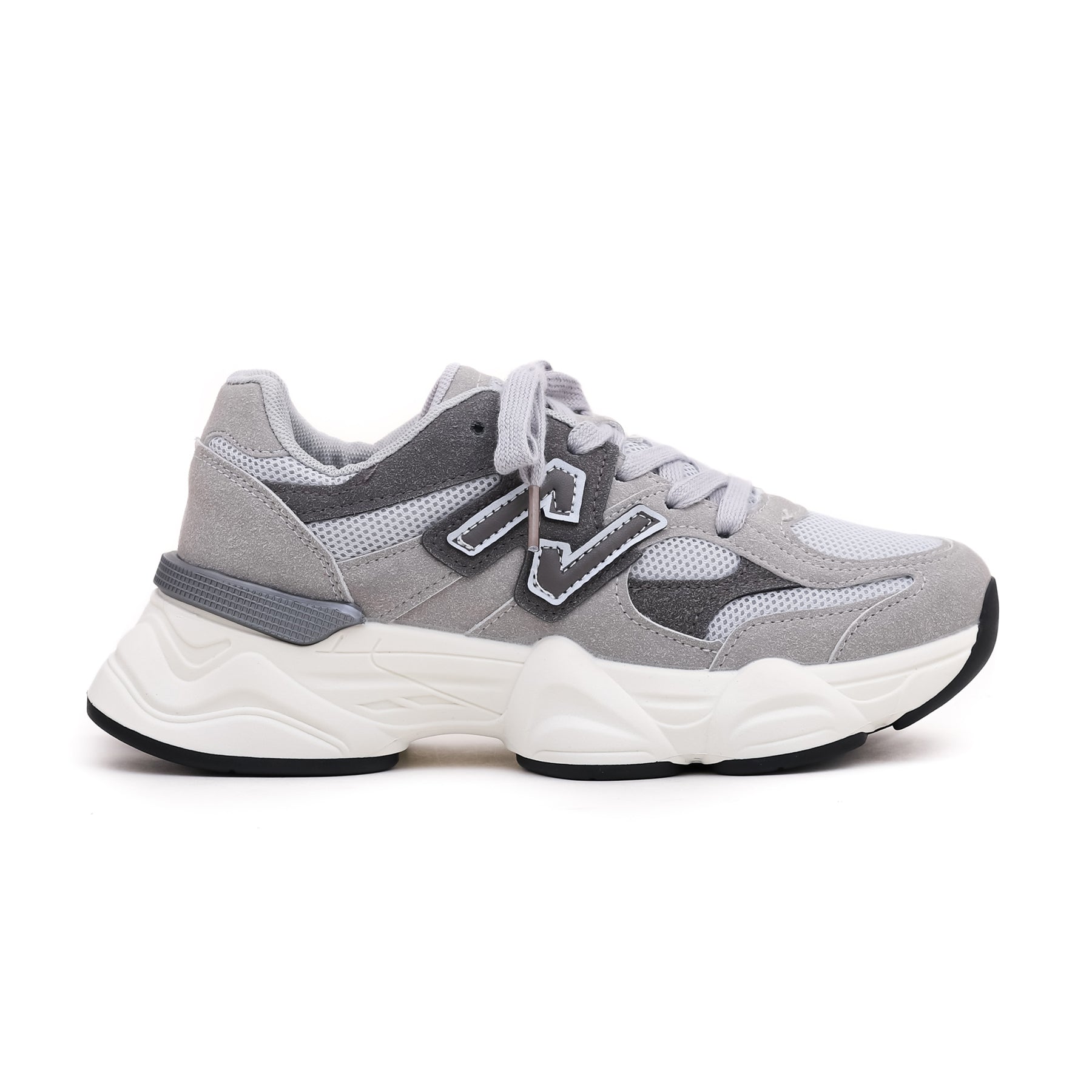 Trendy grey sneakers provide both style and comfort, perfect for a sporty and fashionable look.
