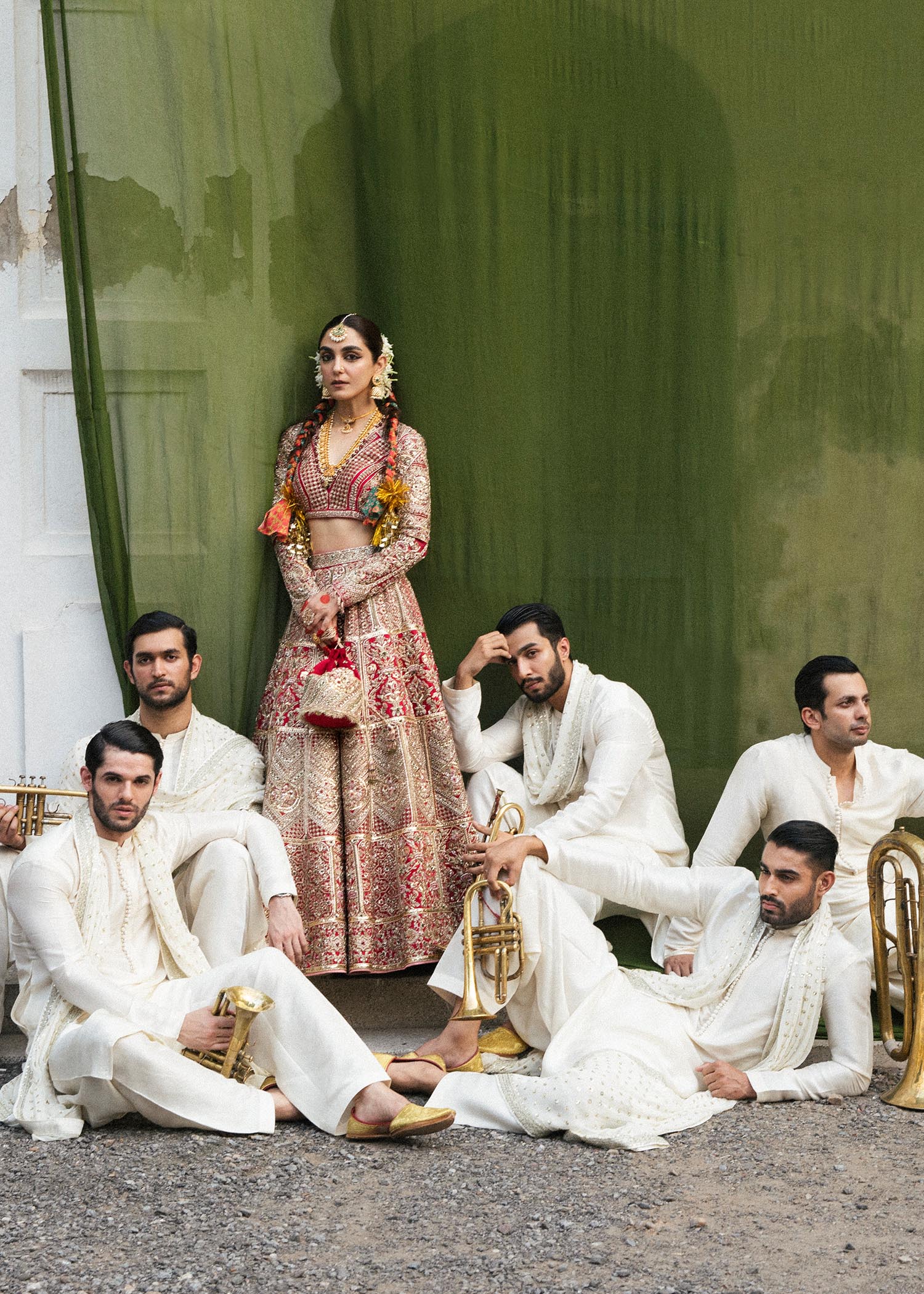 An exquisite rosy red satin silk lehenga with panels full of labyrinth of amalgamated with gilt adda work of naqshi, dabka, muqash, sequins and cutdana. It is paired with a gorgeous organza choli heavily enhanced with pretty scintillating details of aureate adda work of dabka, naqshi, muqash, sequins and cutdana. It comes with an organza dupatta of 4 yards with wide borders deeply finished with gold adda work and chatta of gold motifs. This magnificent outfit can be further enhanced with an additional organza dupatta of 4 yards enhanced with light gota Patti and Kiran in gold on all borders.
