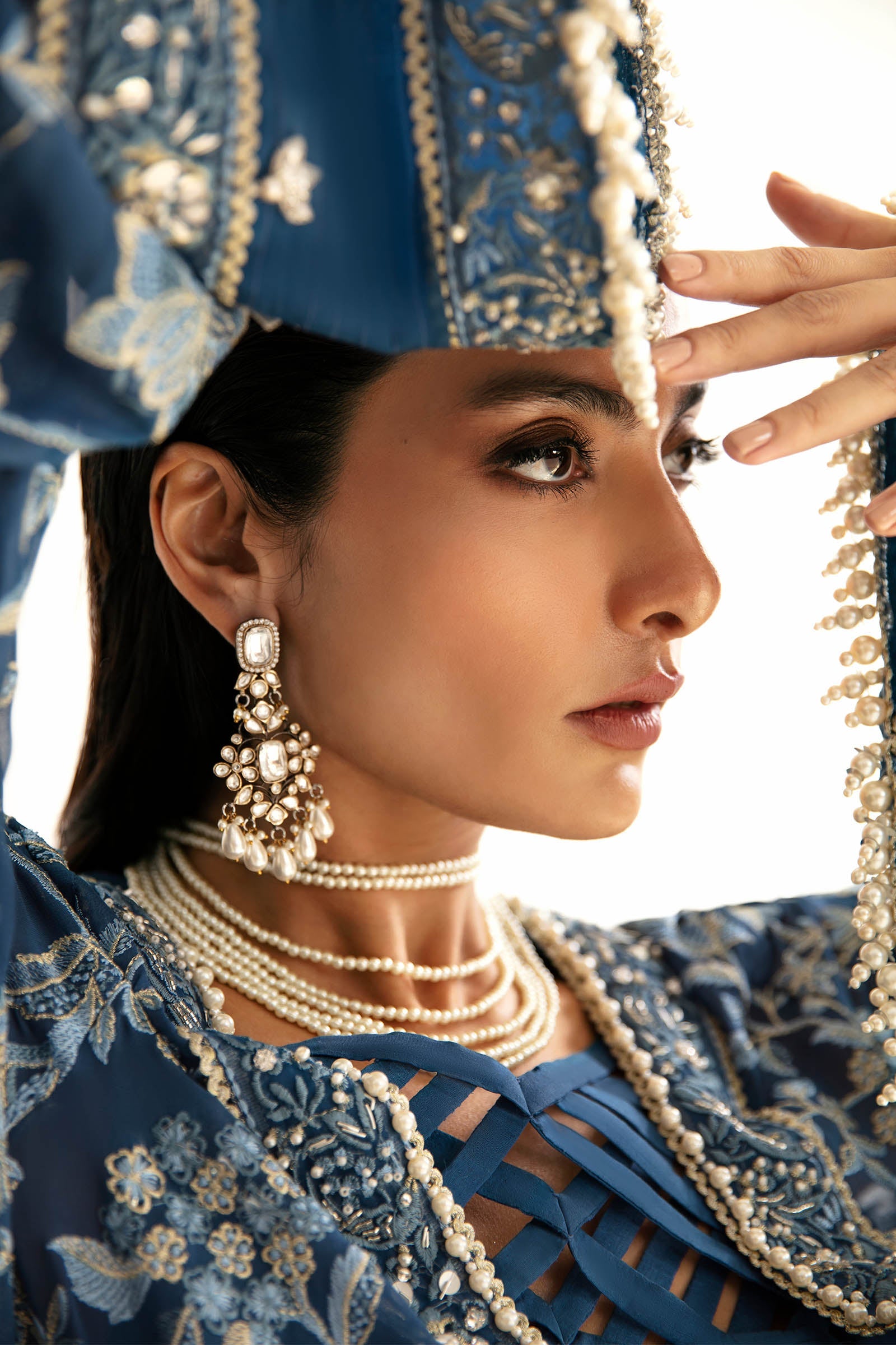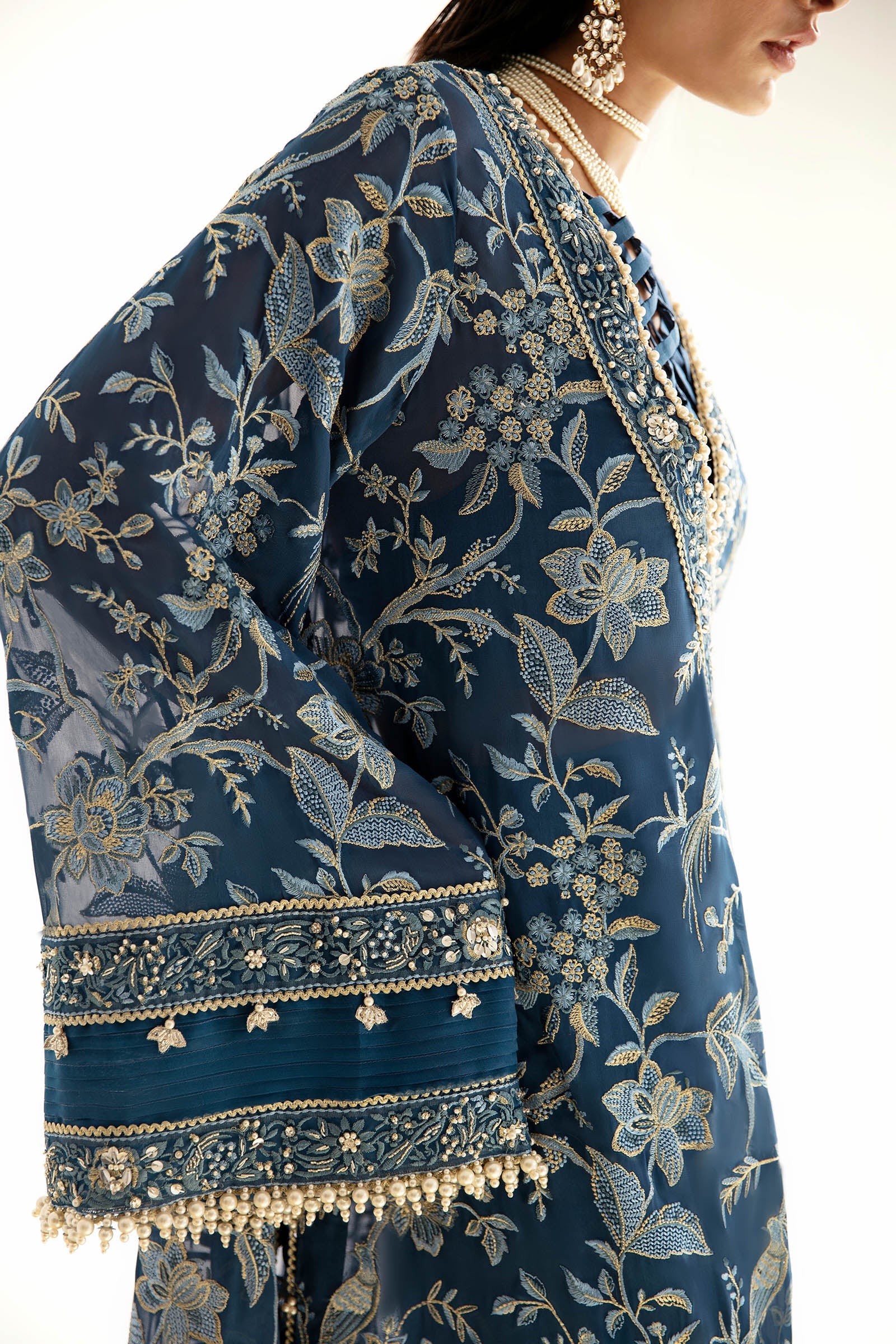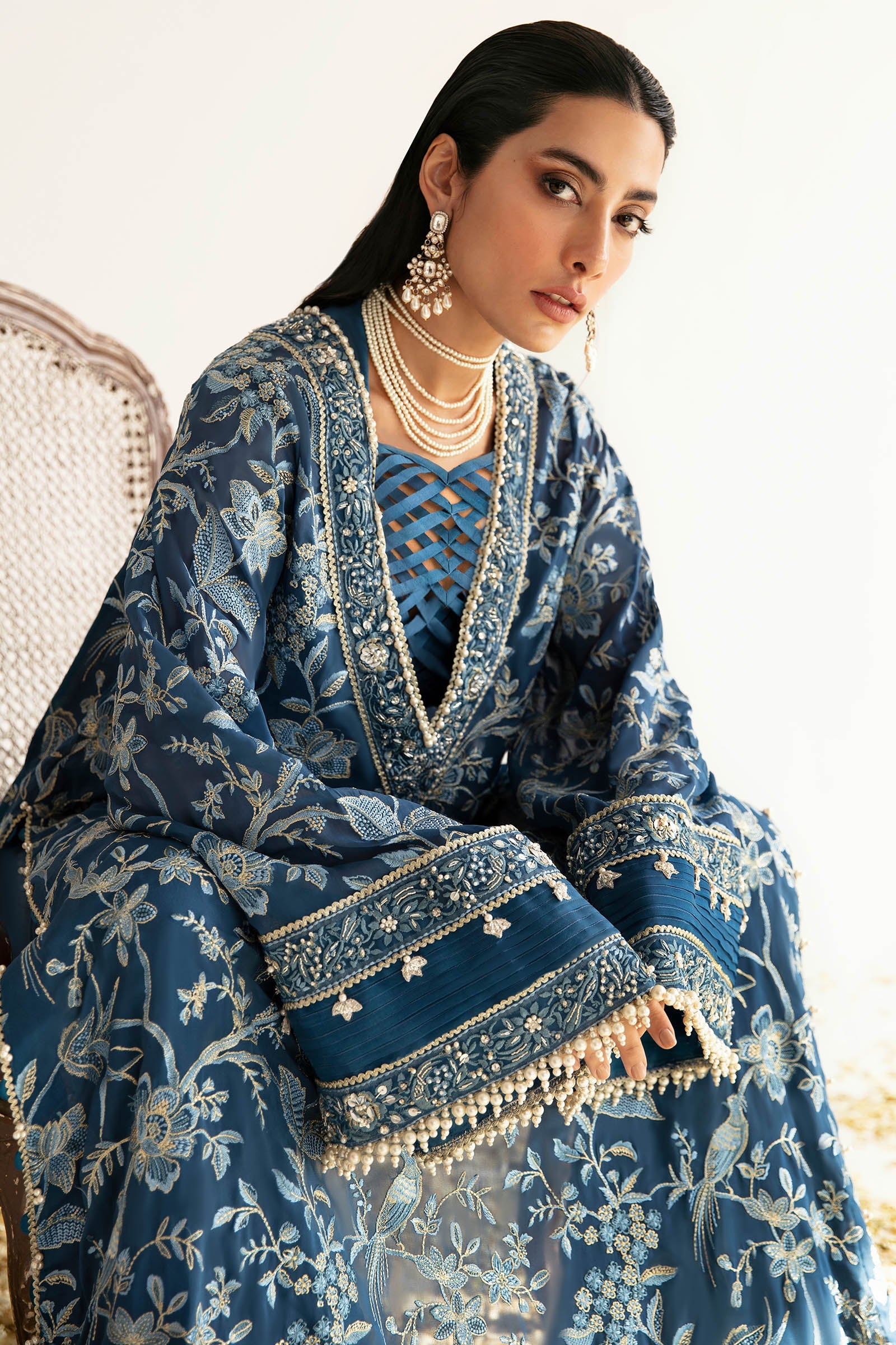 Indulge in the allure of 'Hélène', where a sublime, midnight blue canvas becomes a captivating masterpiece. Tilla embroidery breathes life into blooming birds and florals, adorning every inch with grace. The detailed border, etched with intricate embroideries, bestows a uniquely exquisite dimension. Let this elegant design be your stylish statement, embracing the essence of refined sophistication for any formal affair or joyous celebration.