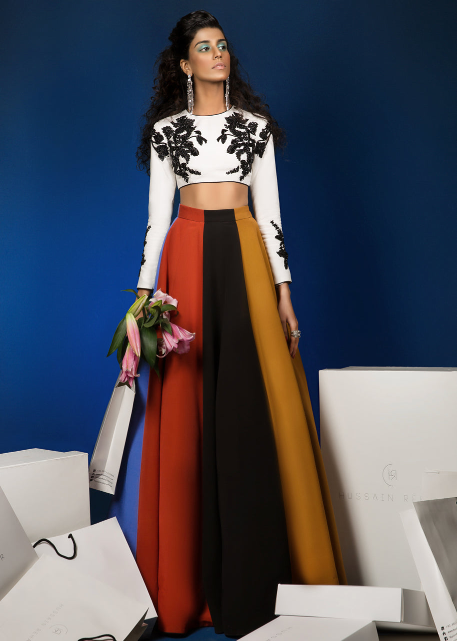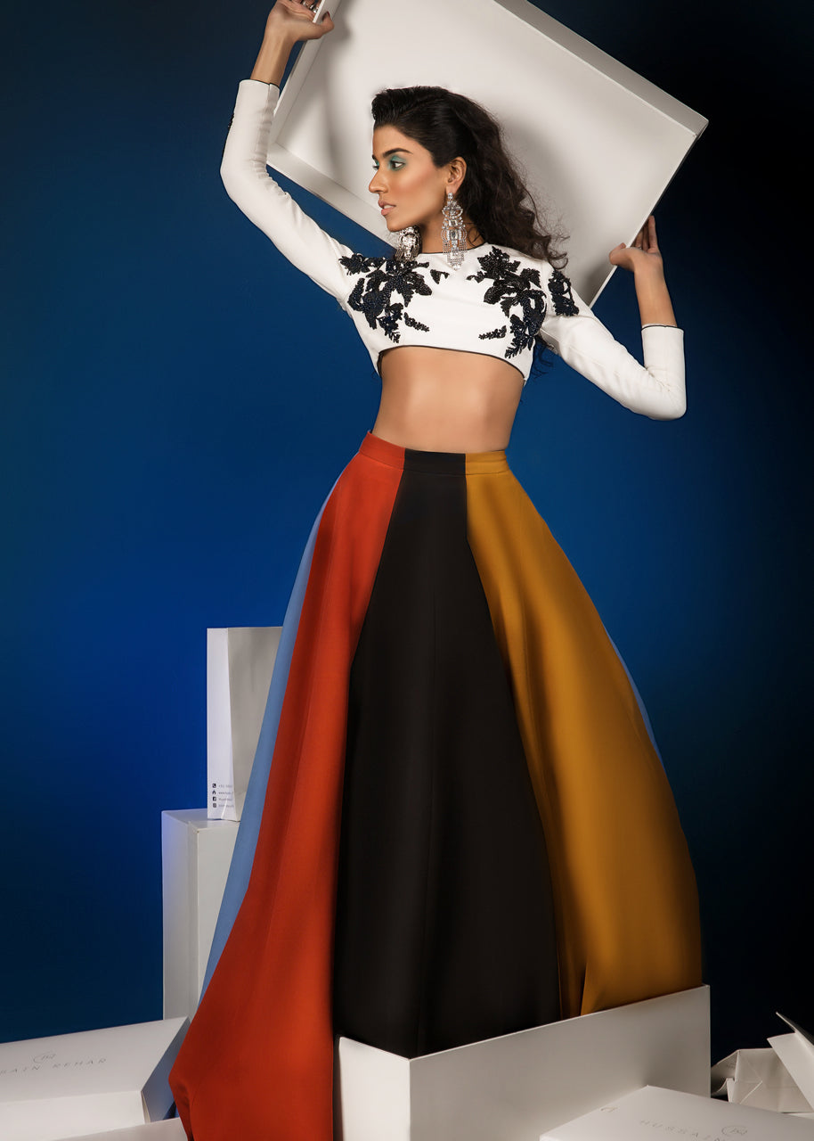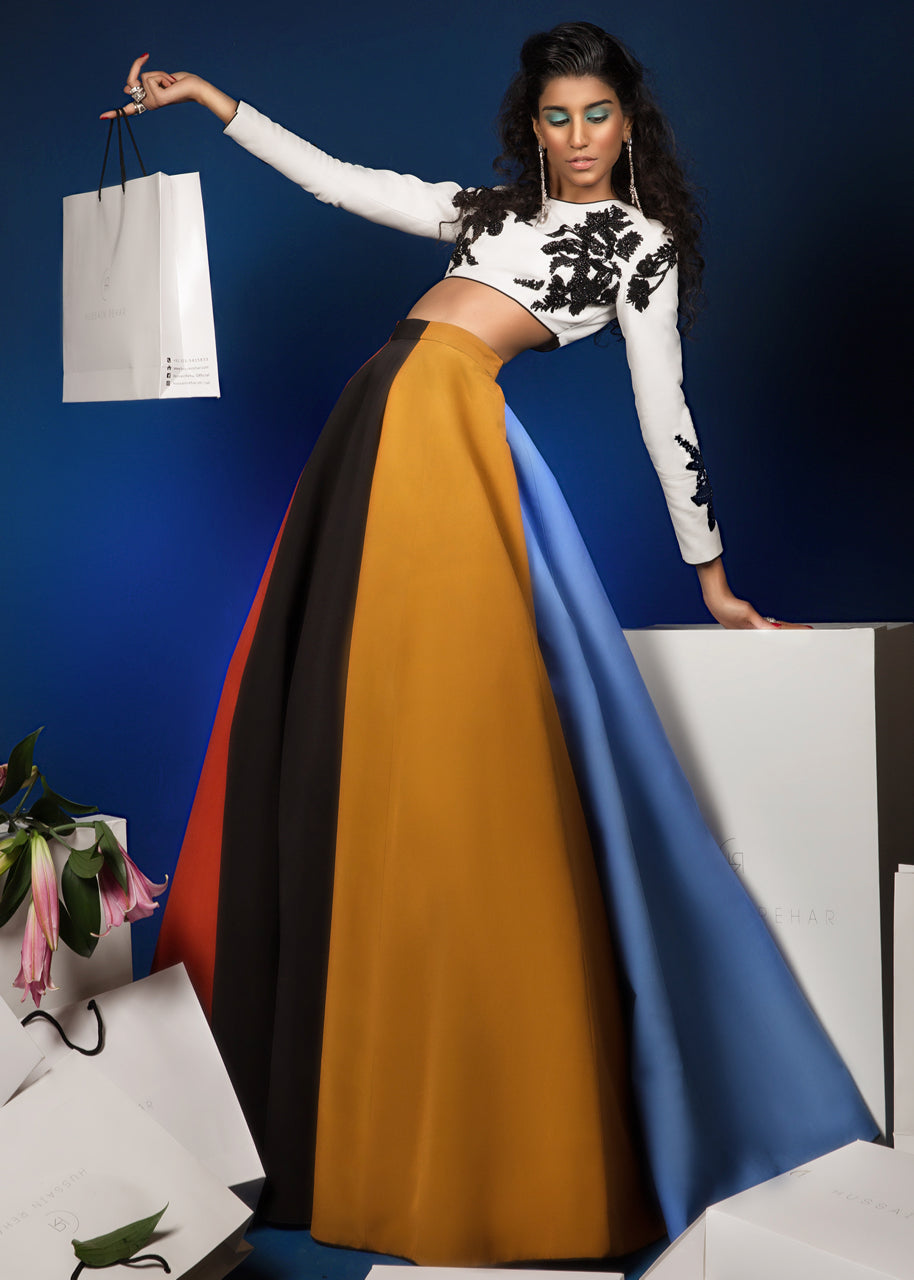The white grip blouse has a round neck and full sleeves. Two black floral motifs extend from the torso and onto the shoulders. The sleeves are also embellished with black floral motifs. The blouse is lined with medium silk. The grip skirt comprises of panels divided into four colors; red, mustard, blue and black. The garment is finished with black piping.