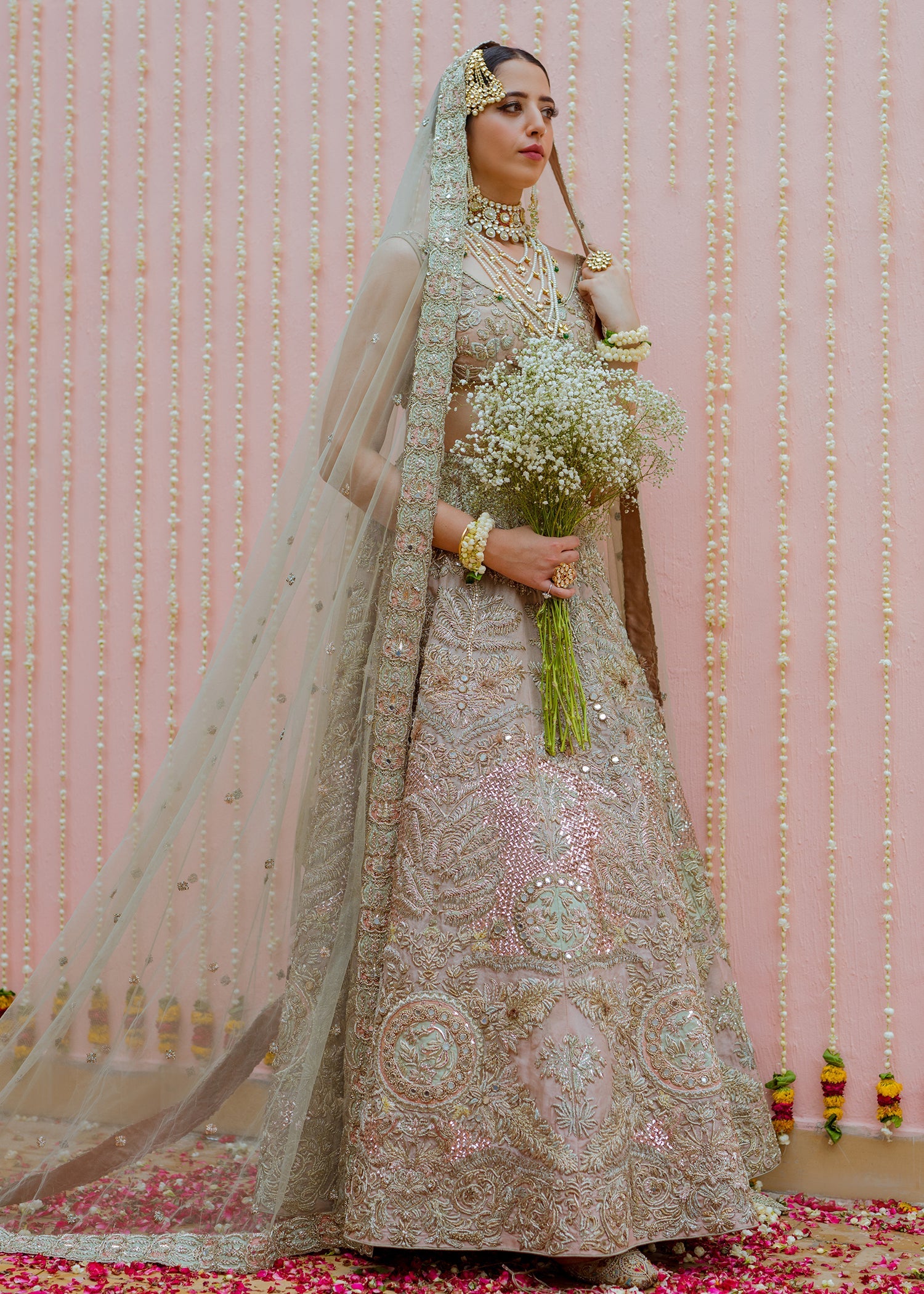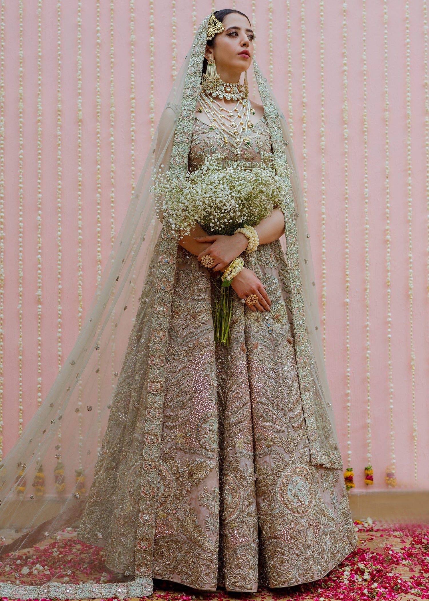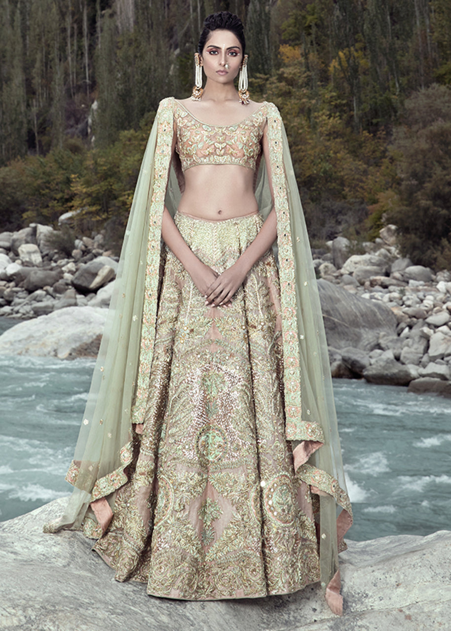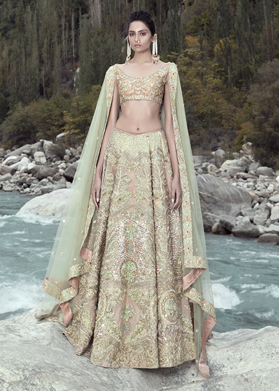 This rose gold organza blouse has a broad round neck with half sleeves. The blouse has an arrangement of embellished butterflies with thread work details. The raw silk rose gold skirt has large motifs of florals running across with larger motifs at the border and gradually shrinking to the waist line with ice blue satin silk patch work. The net dupatta has a spray of embellishments running across with a detailed border on all four sides with rose gold and ice blue satin silk patchwork. The garment is finished with rose gold piping and is lined with medium silk.