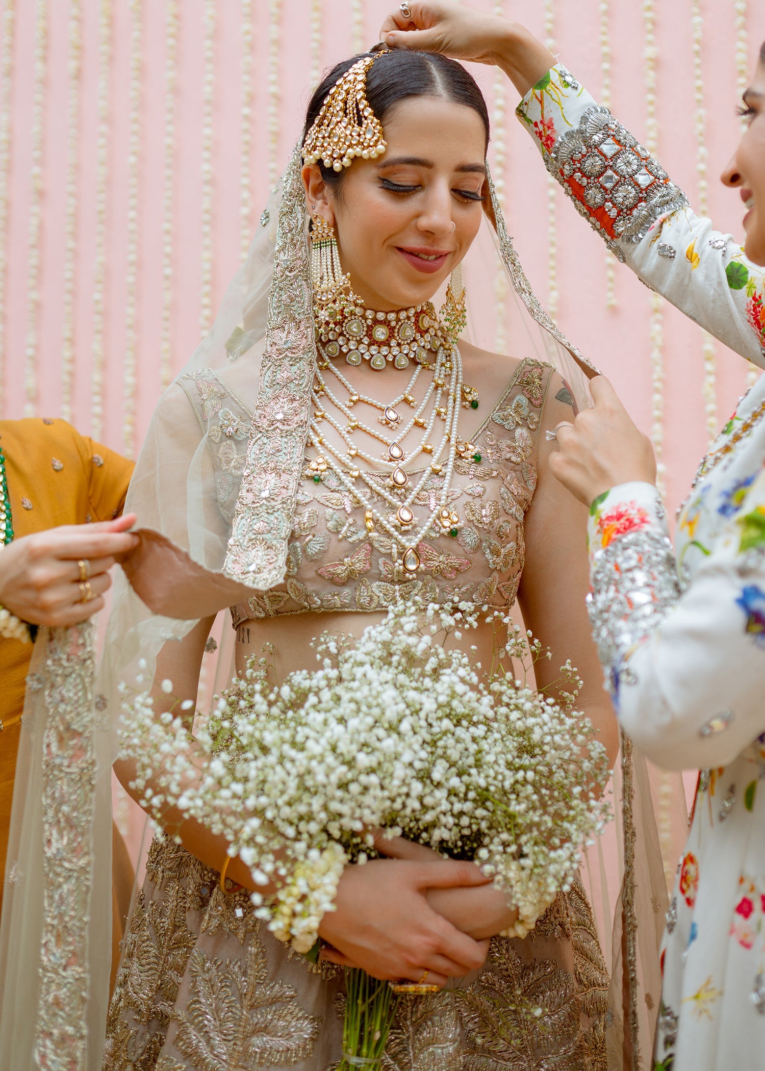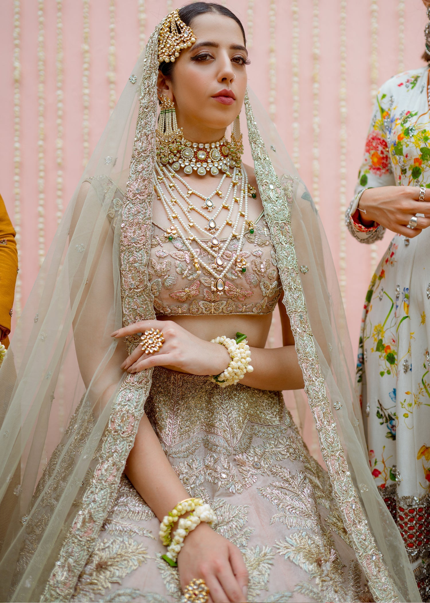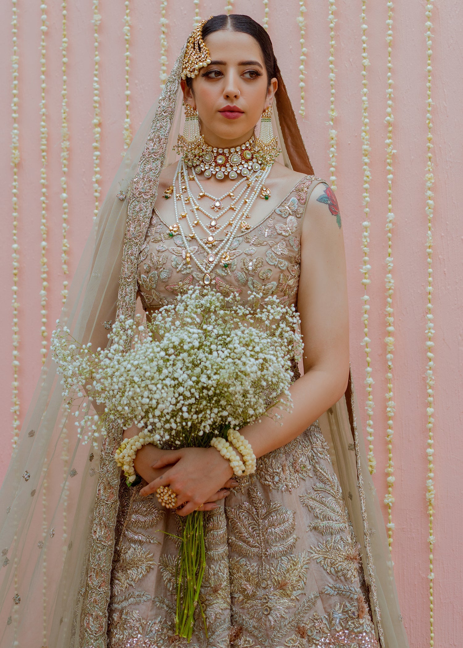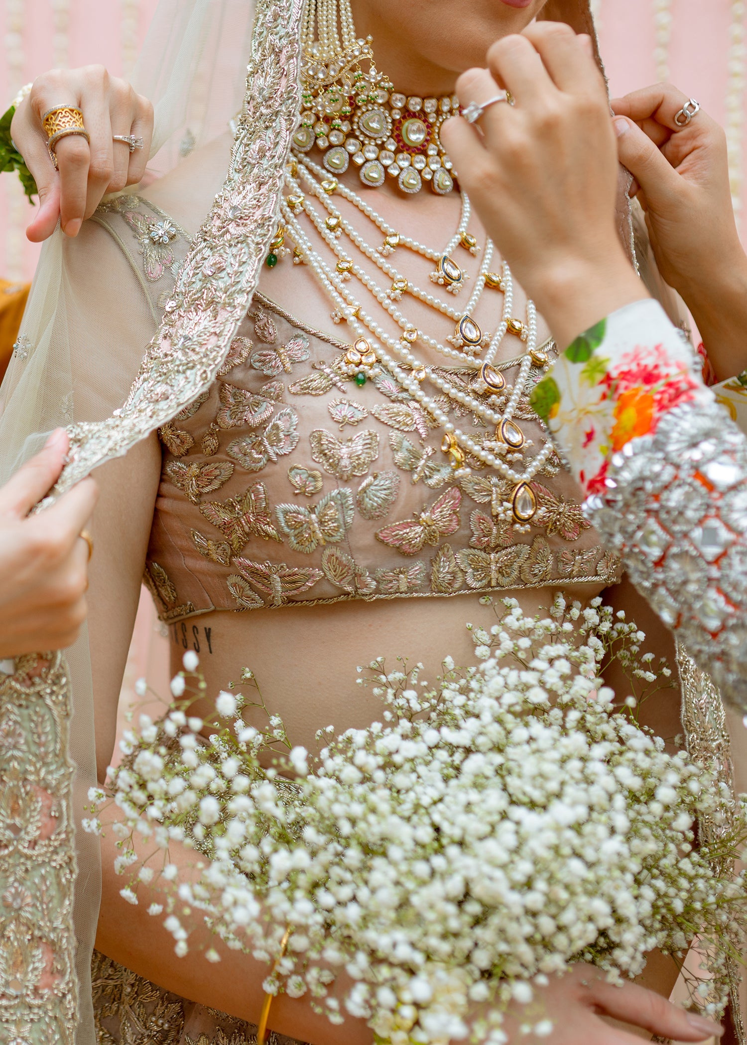 This rose gold organza blouse has a broad round neck with half sleeves. The blouse has an arrangement of embellished butterflies with thread work details. The raw silk rose gold skirt has large motifs of florals running across with larger motifs at the border and gradually shrinking to the waist line with ice blue satin silk patch work. The net dupatta has a spray of embellishments running across with a detailed border on all four sides with rose gold and ice blue satin silk patchwork. The garment is finished with rose gold piping and is lined with medium silk.