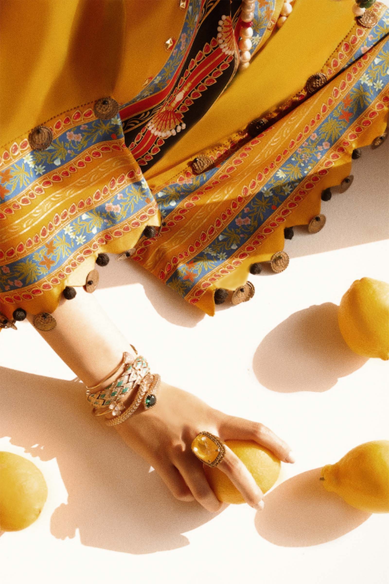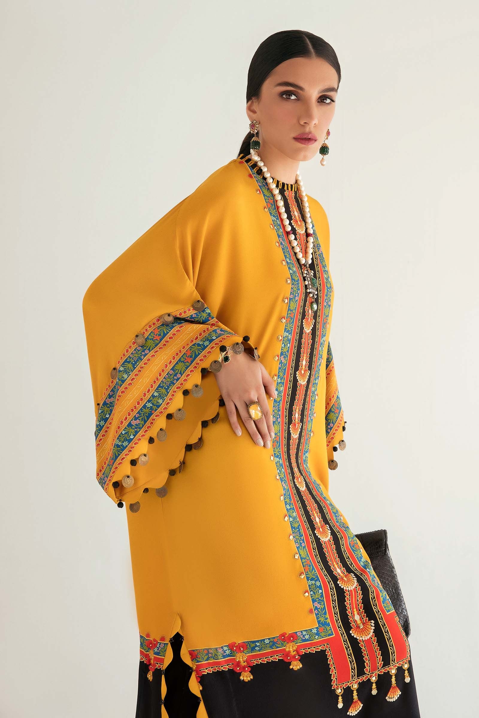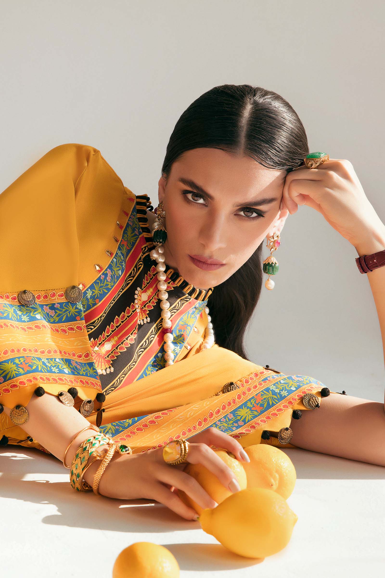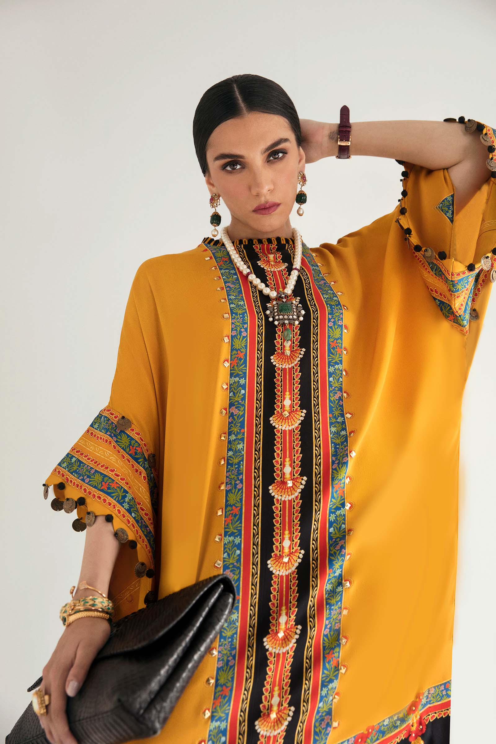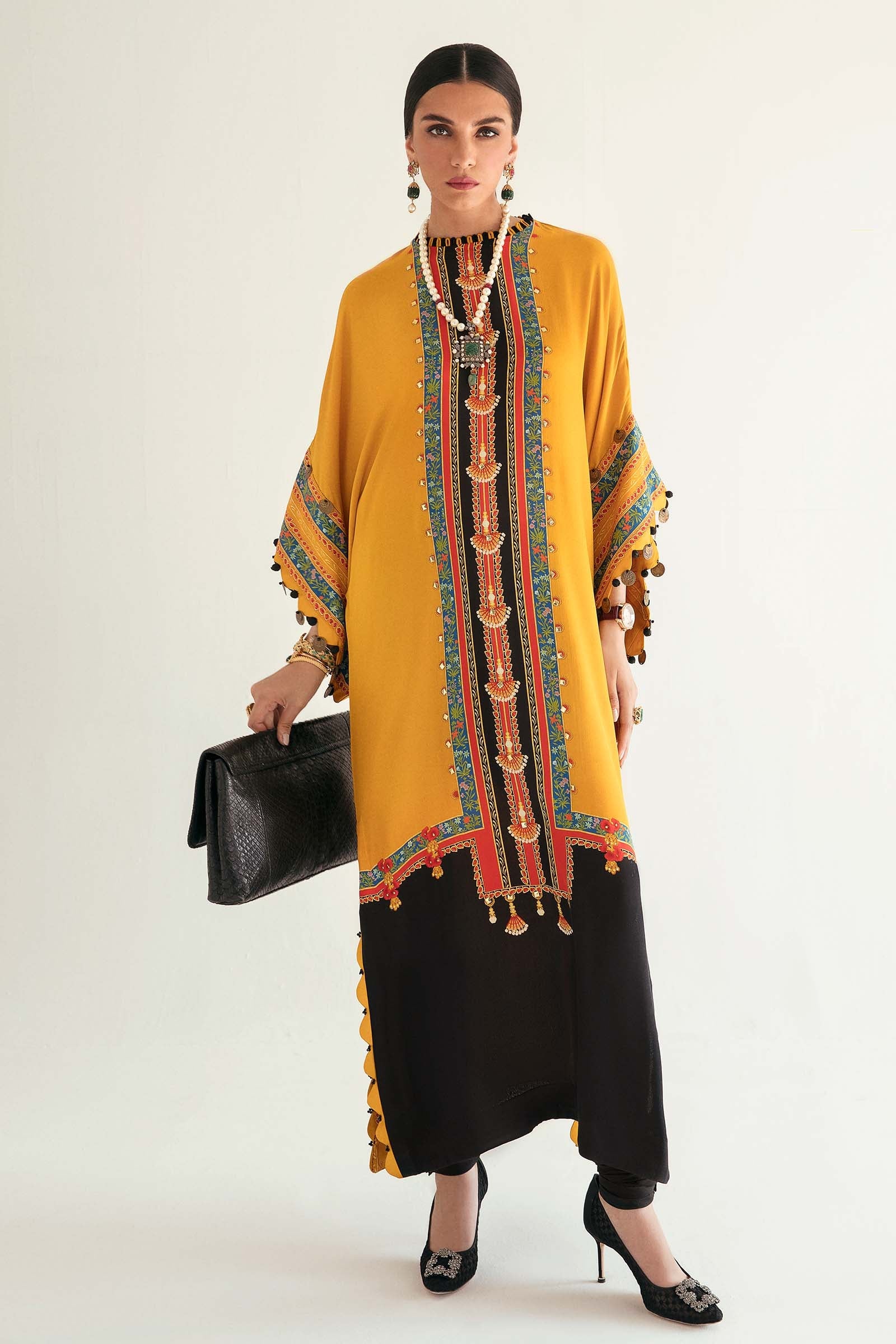 'Iva' - an iconic, flowing kaftan makes an instant statement. The bright tuscany yellow shirt is crafted from premium silk and patterned with an ebony crimson and azure composition. The design boasts versatility and is made to fit the modern ethos of the fashion forward Élan woman.