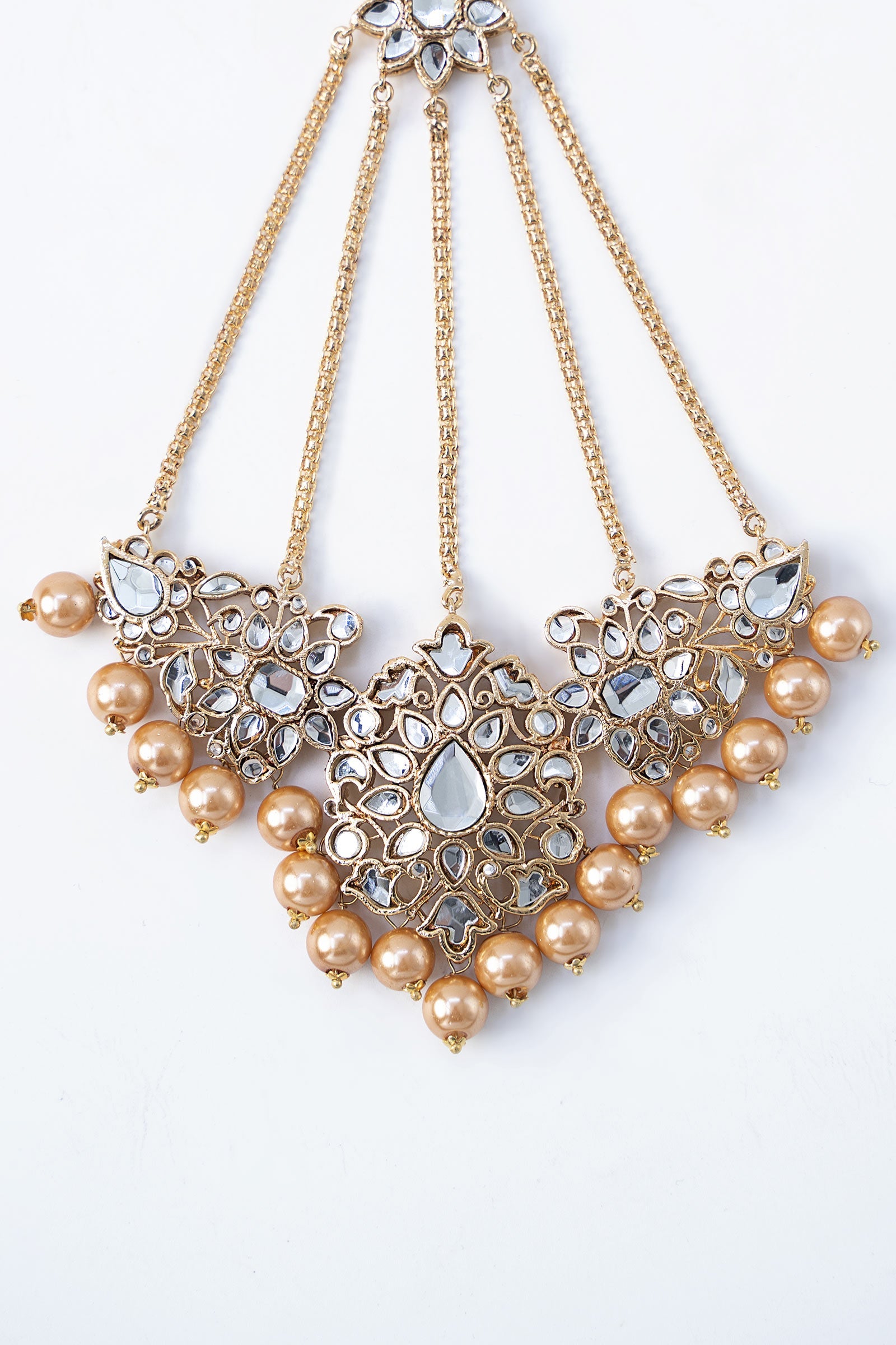 Our Mahraani Bridal Jhoomar makes the perfect pair to your bridalwear and complements it perfectly with the shine of handcut glass stones finished with round golden pearls and gold plating. It is a specimen of excellent craftsmanship with its intricately curated design.