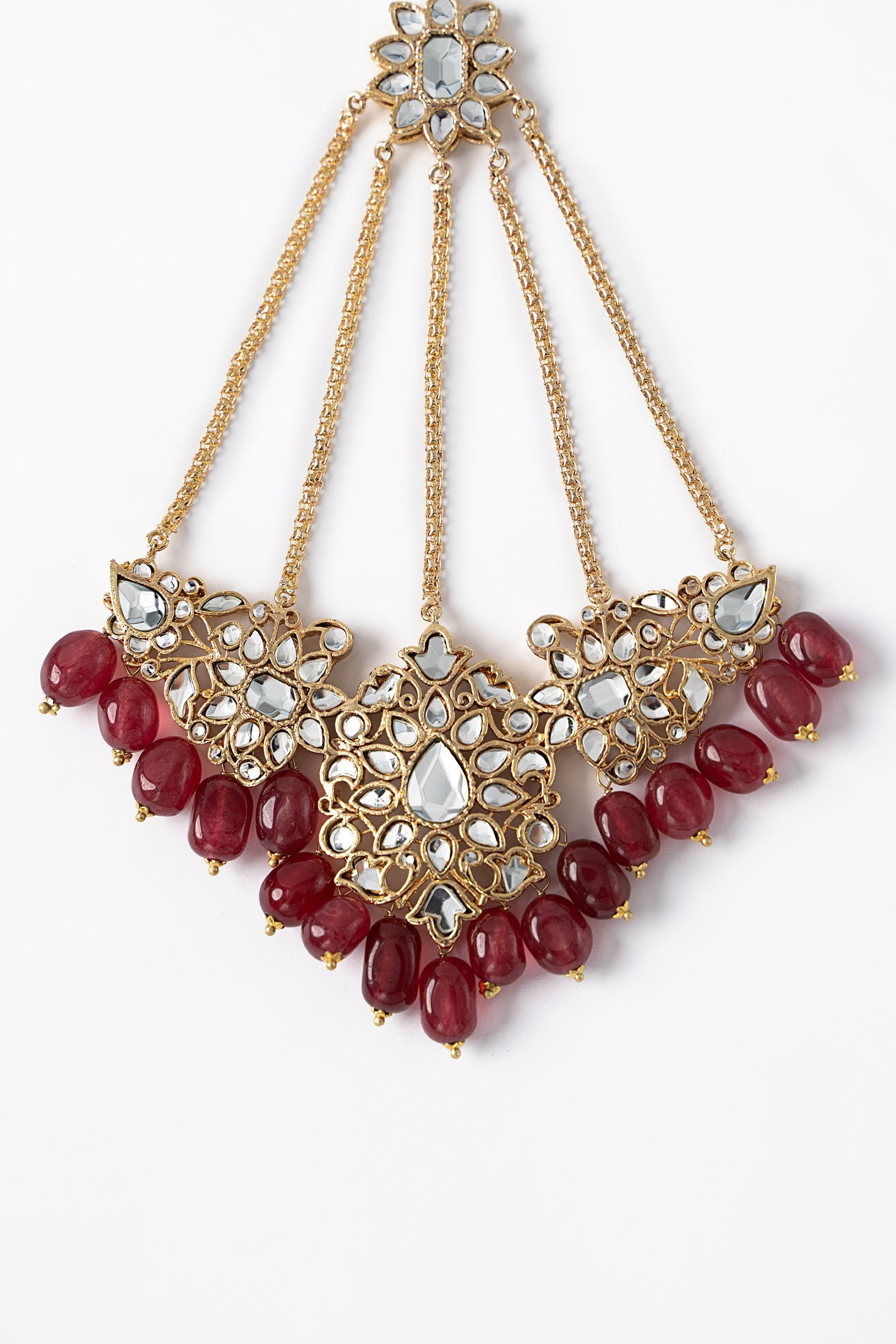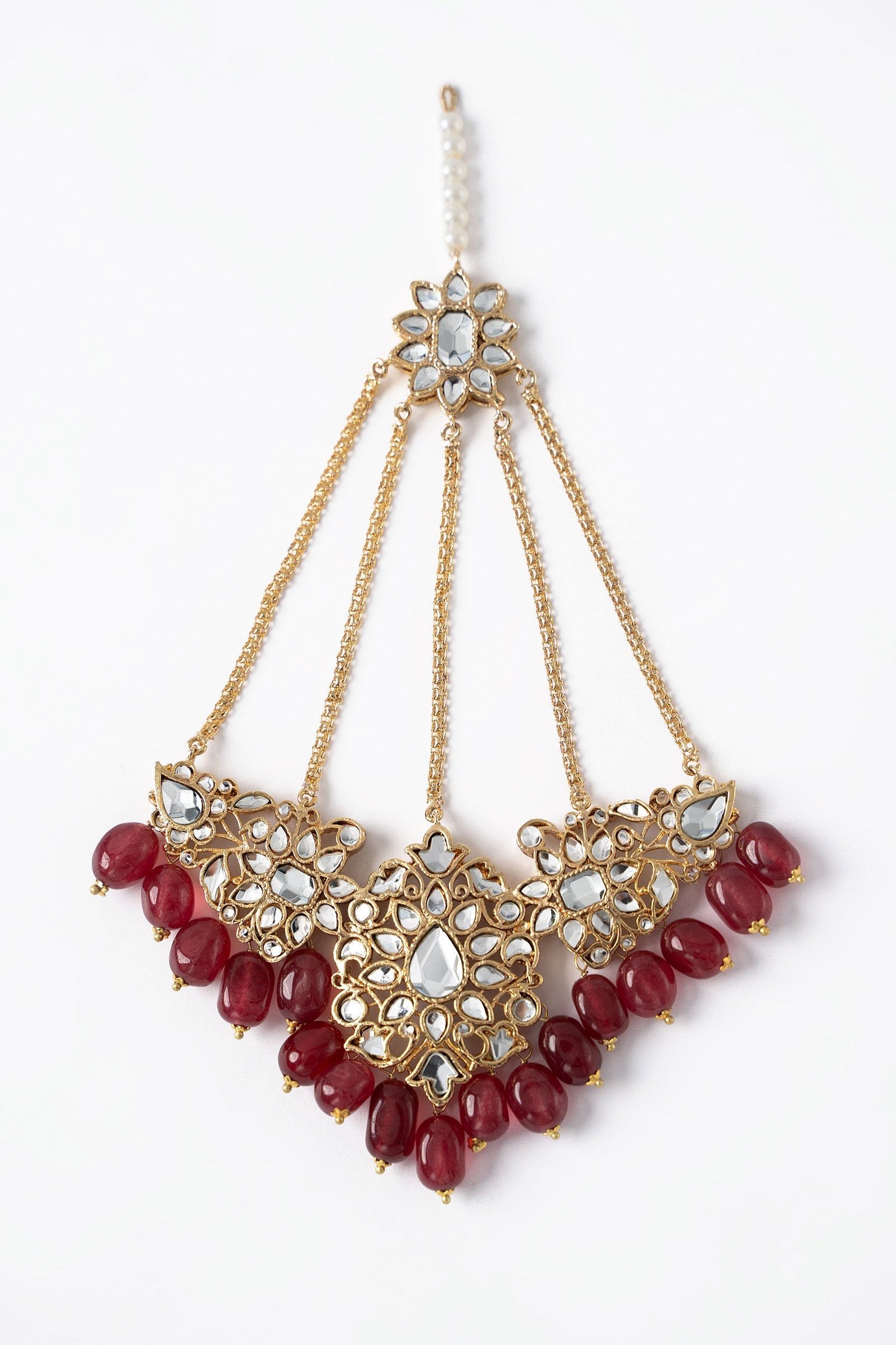 Our Mahraani Bridal Jhoomar makes the perfect pair to your bridalwear and complements it perfectly with the shine of handcut glass stones finished with red onyx hangings and gold plating. It is a specimen of excellent craftsmanship with its intricately curated design.