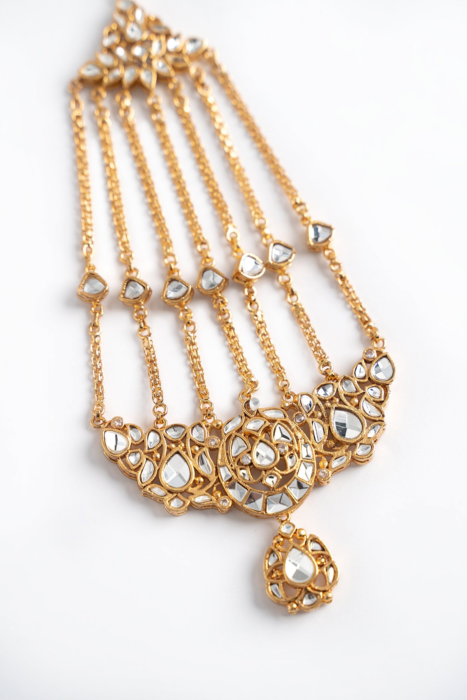 Adorned with handcut glass stones with white zircons, our Aurangabadi Bridal Jhoomar is delicate yet effortlessly chic, perfect for elevating your bridal look.