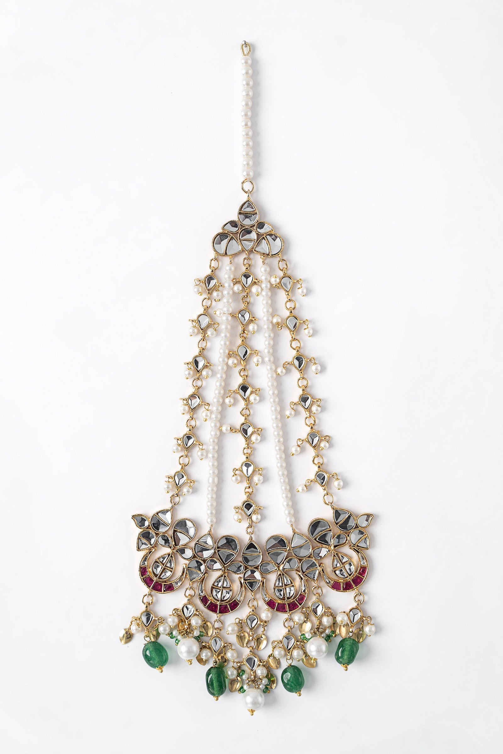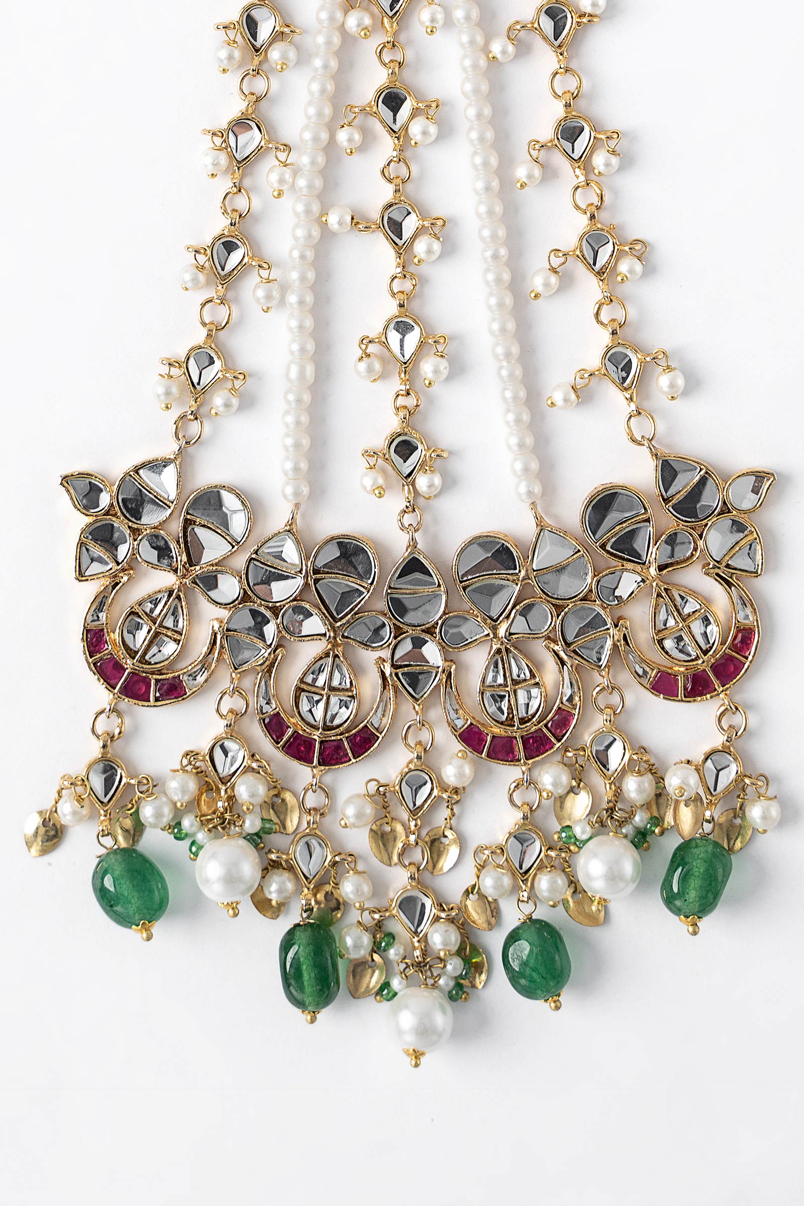 Get ready to fall in love with this classic piece of jewelry. Rooted in elegance, this traditional Malika Bridal Jhoomar is crafted with handcut glass stones with pink chatham, white pearls, and metal leaves pyroi with hanging green onyx, making it a symbol of elegance that effortlessly completes the look.