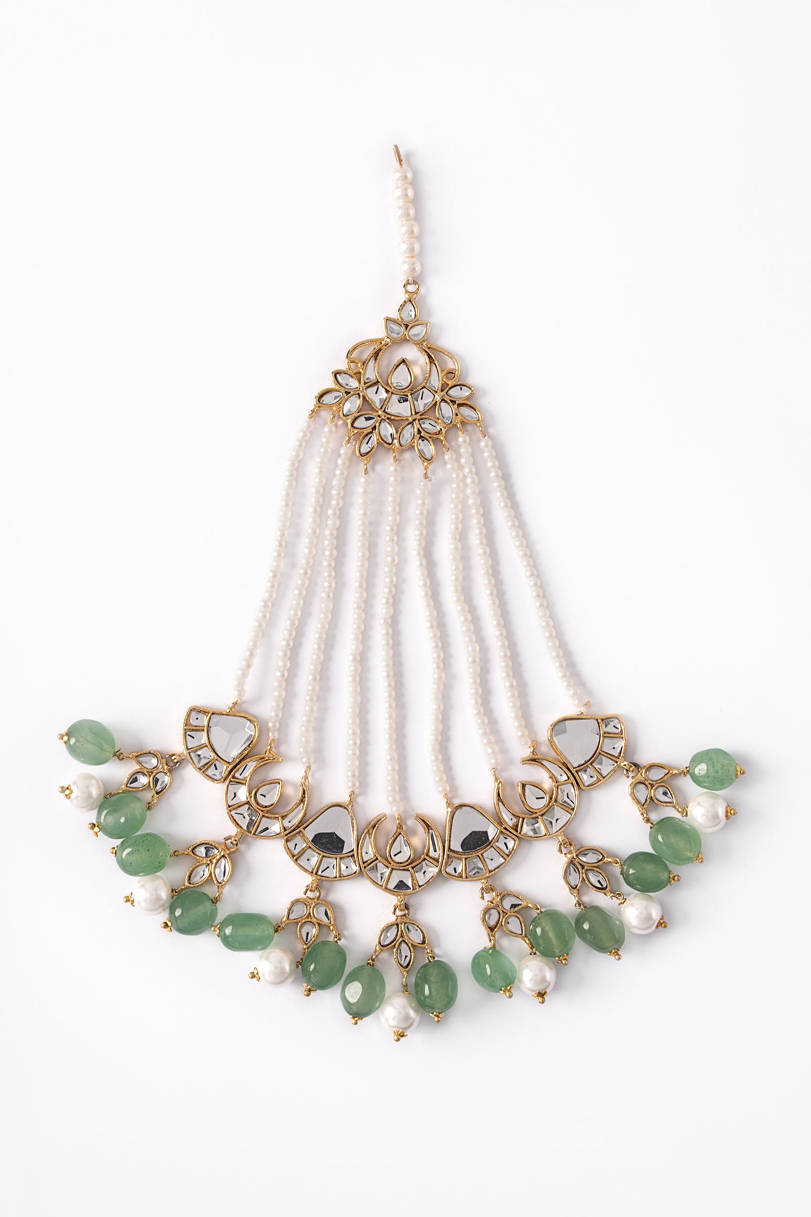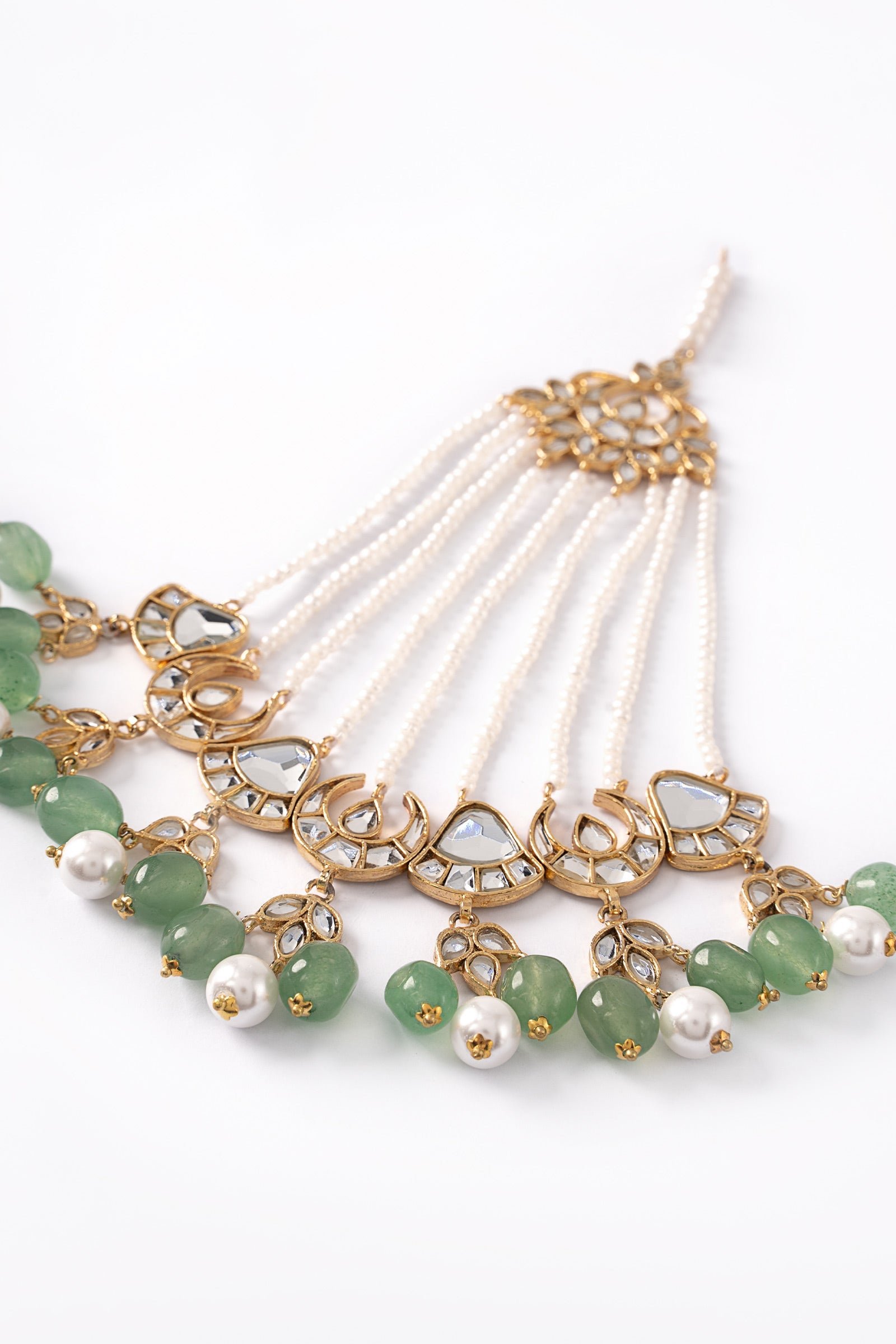 Gauhar Bridal Jhoomar inspired by traditional artistry, showcases handcut glass stones with white pearls pyroi, and jade green hanging. This accessory is very versatile and pairs well with your big day outfit.