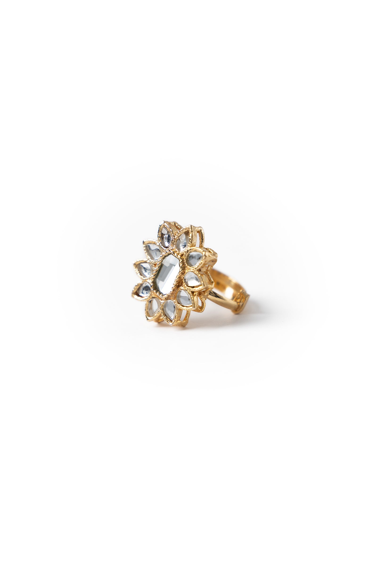Adorn our traditional Mahraani Bridal Set, featuring handcut glass stone artisanship finished with glistening round golden pearls. The set includes a majestic necklace, a pair of earrings, and a ring that make your big day special.