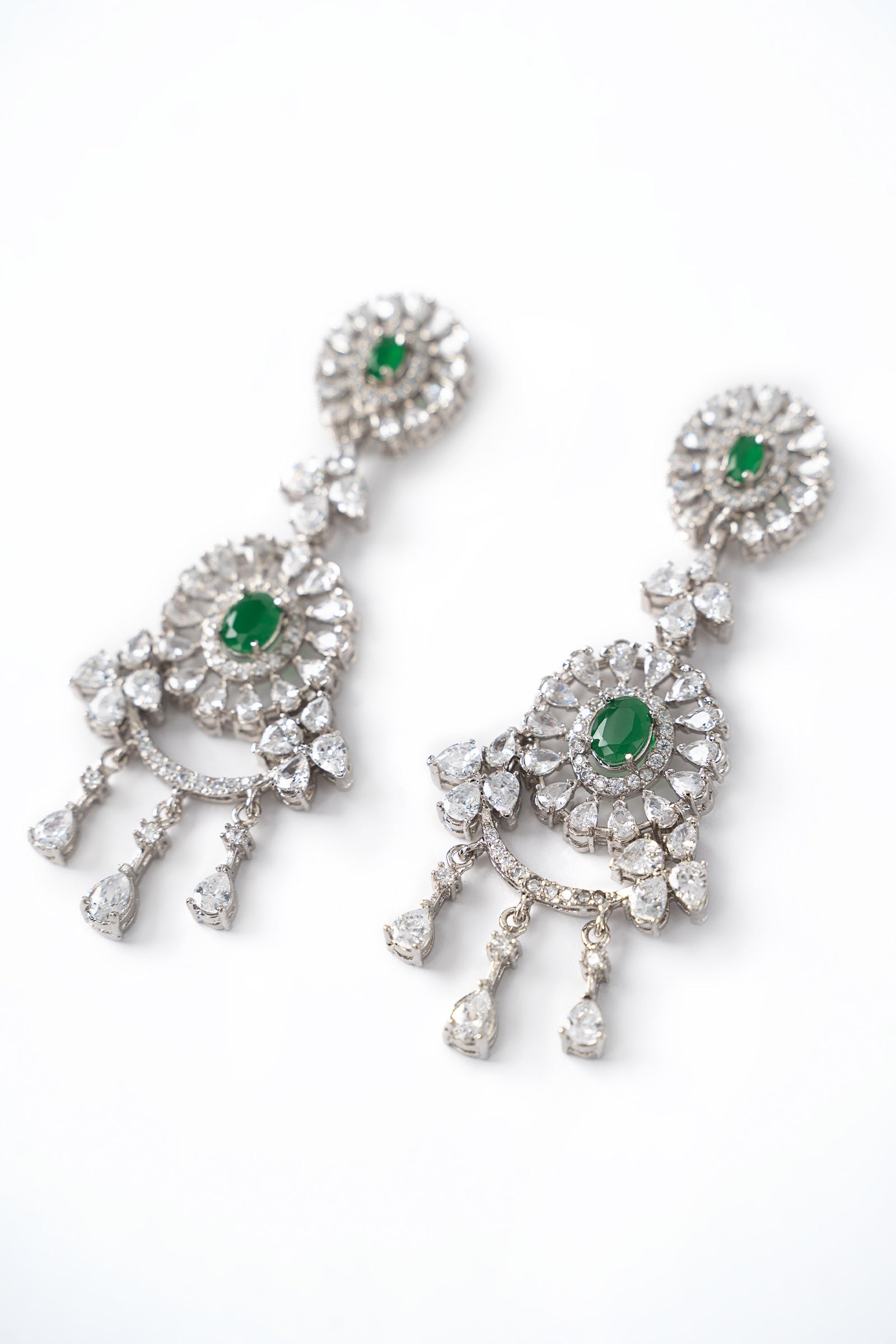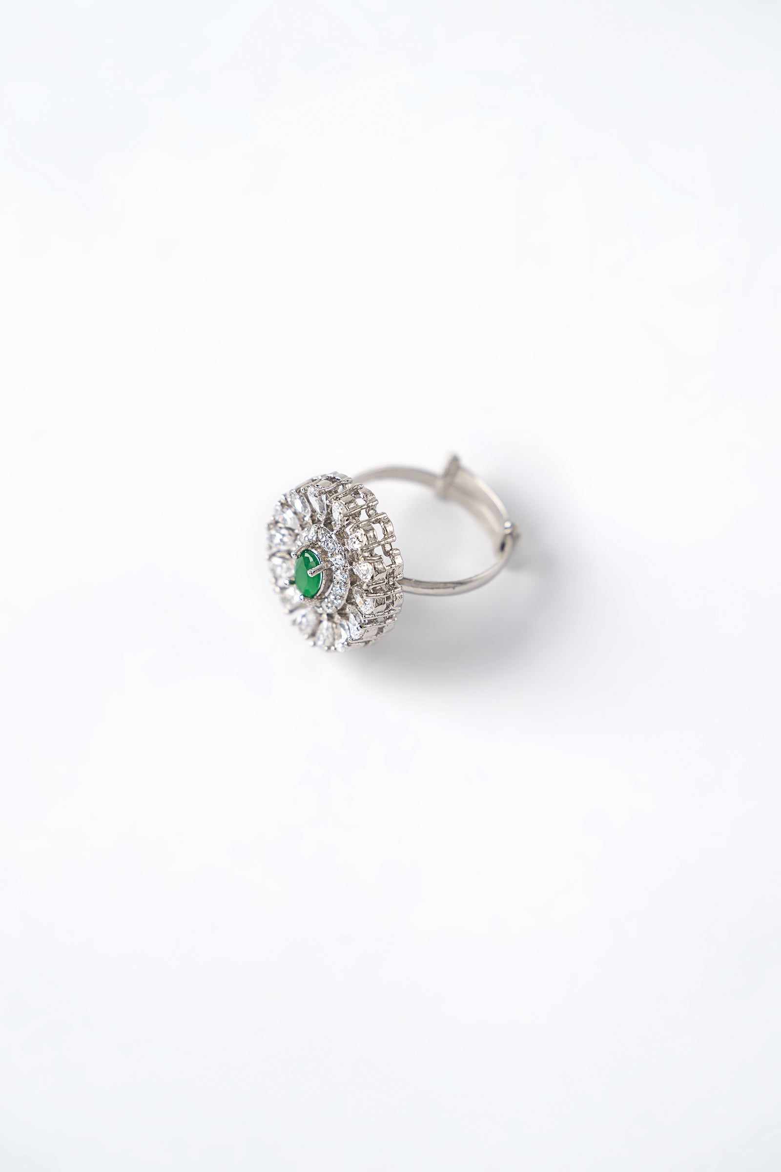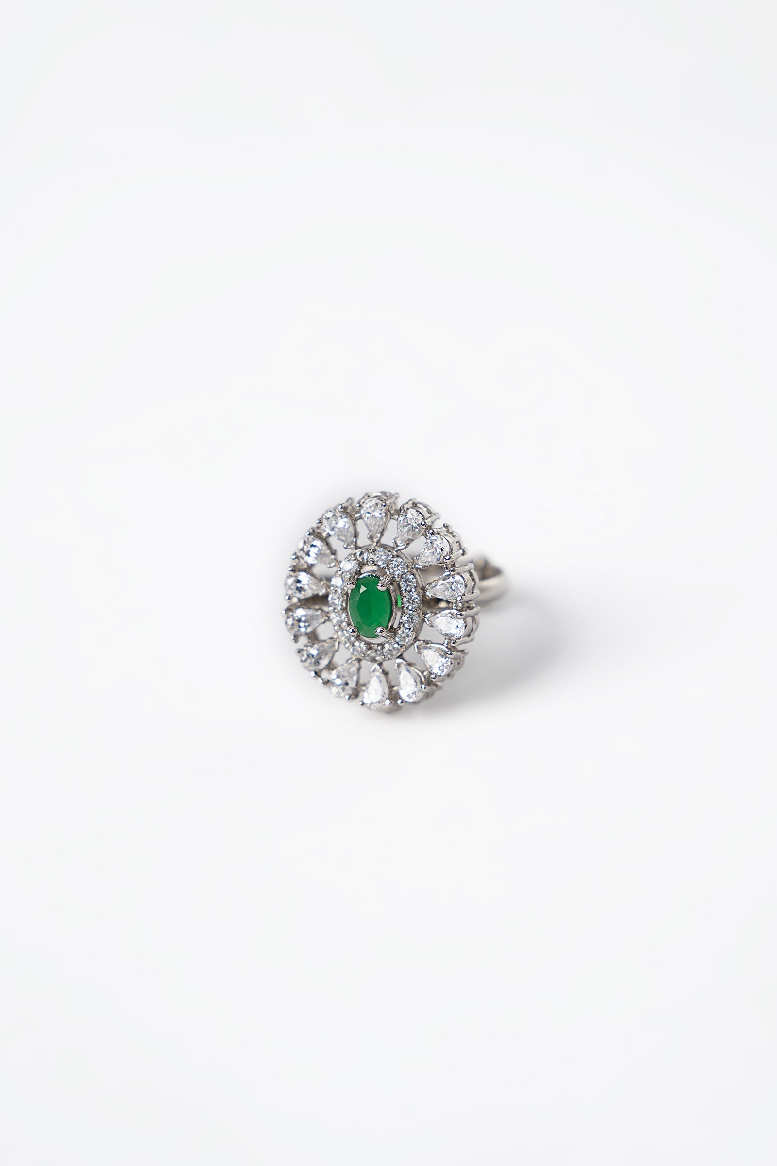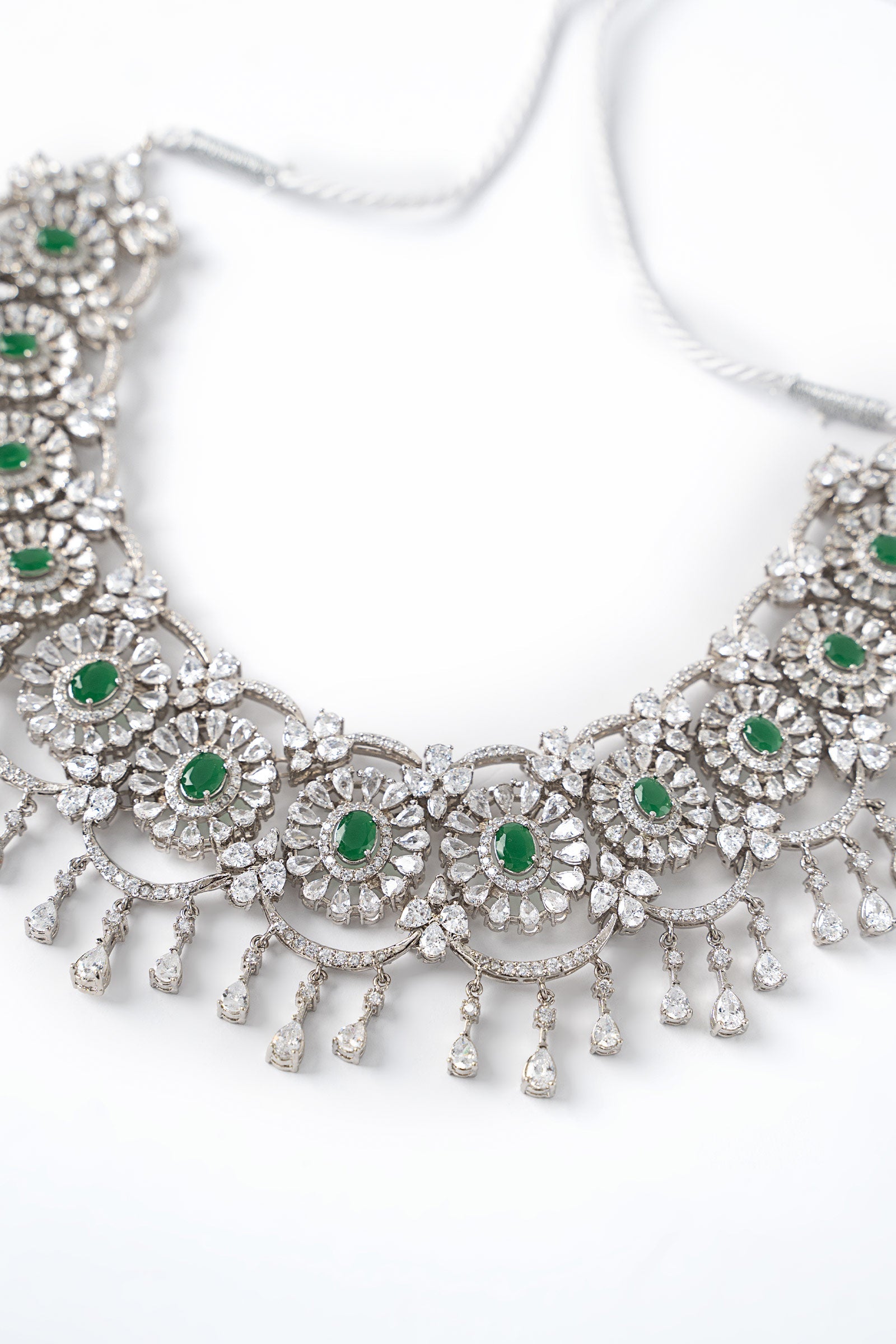 Embrace the enchanting radiance on your big day with our Sahiba Bridal Set. Featuring green emerald glass stones artistry with white zircons. It has a necklace, a pair of earrings, and a ring that lets you radiate confidence and make a classic statement.